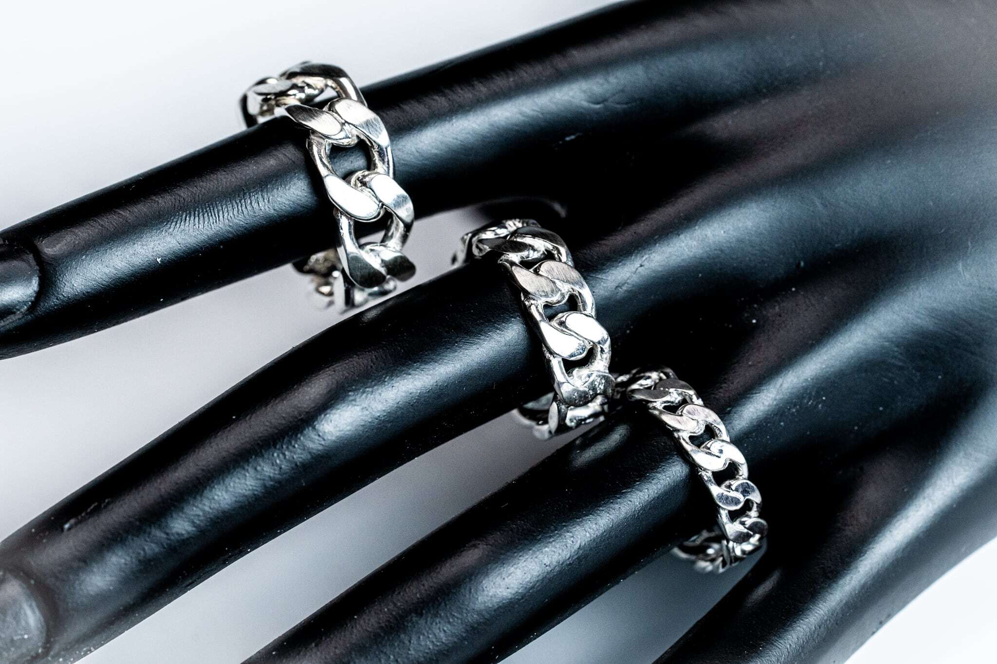 カットが多く入り、そのままだとどうしてもギラギラとして印象になってしまう喜平チェーンをインディアンジュエリーでもよく使われる艶を消す技法で一コマ一コマずつステンレス仕上げに。