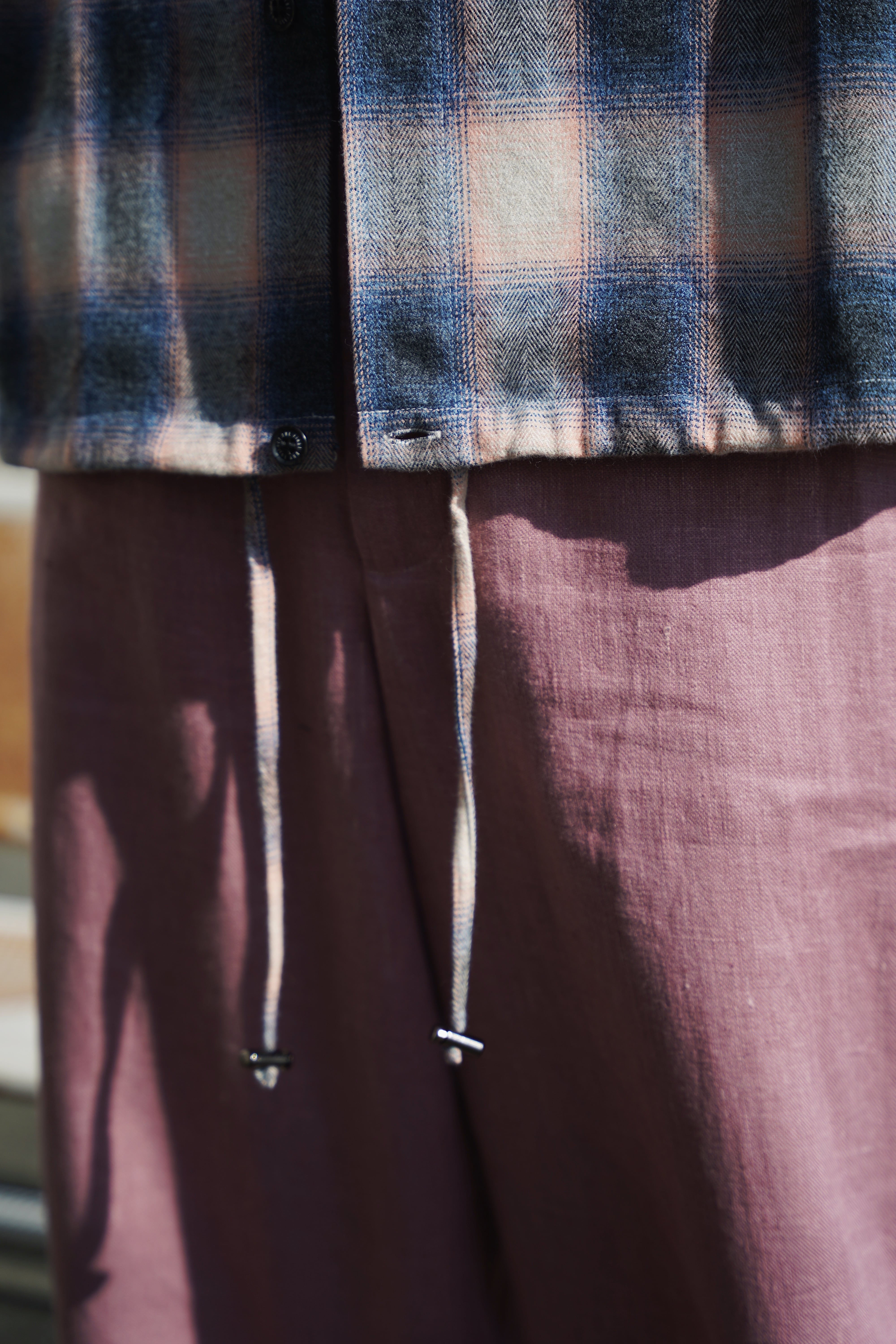 撚り杢のオンブレ生地を使用したチェックシャツ。シャツとコーチジャケットを組み合わせたようなディテールを採用。裾のドローコードでシルエットを調節可能。ポケットにはロゴ刺繍。