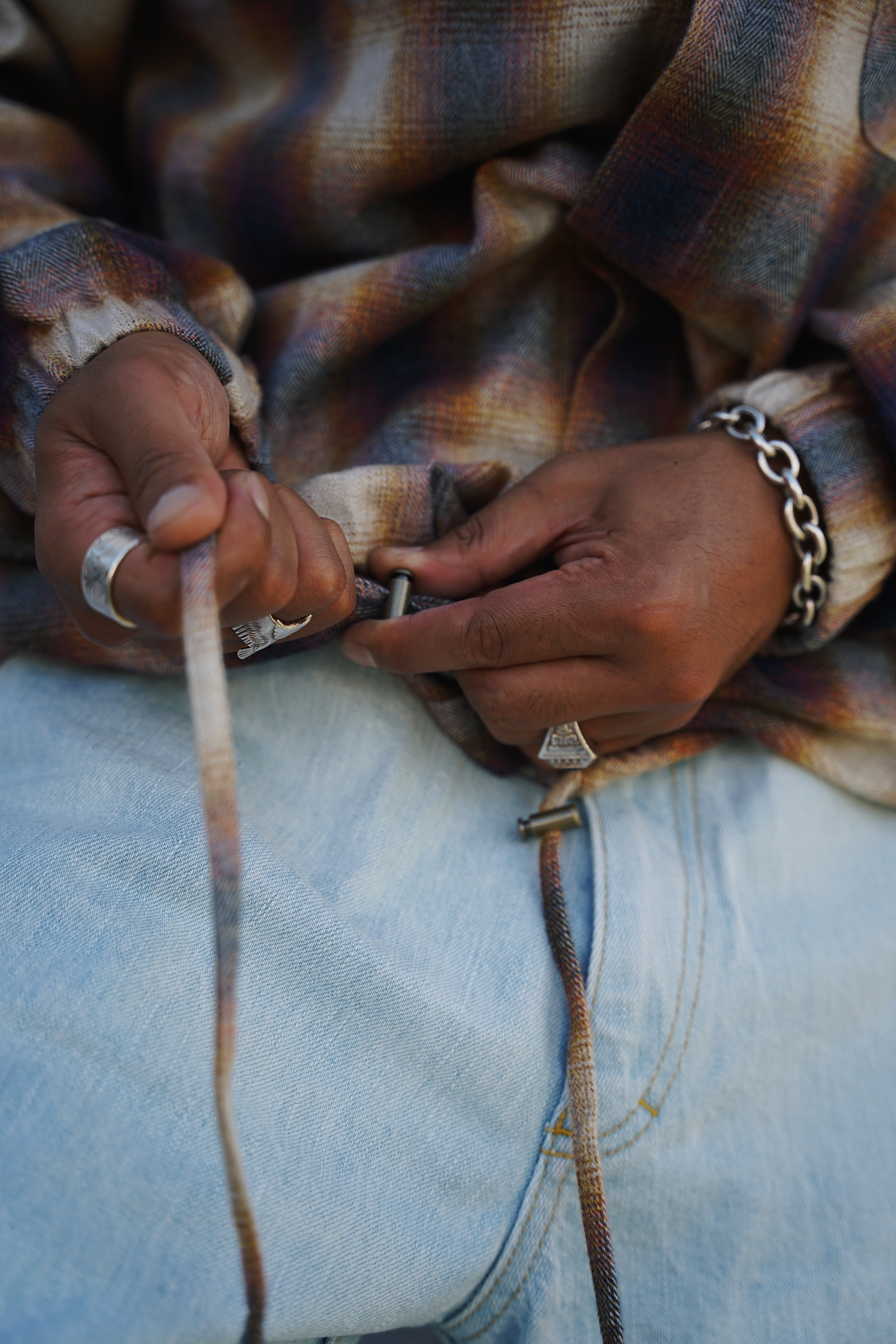 撚り杢のオンブレ生地を使用したチェックシャツ。シャツとコーチジャケットを組み合わせたようなディテールを採用。裾のドローコードでシルエットを調節可能。ポケットにはロゴ刺繍。