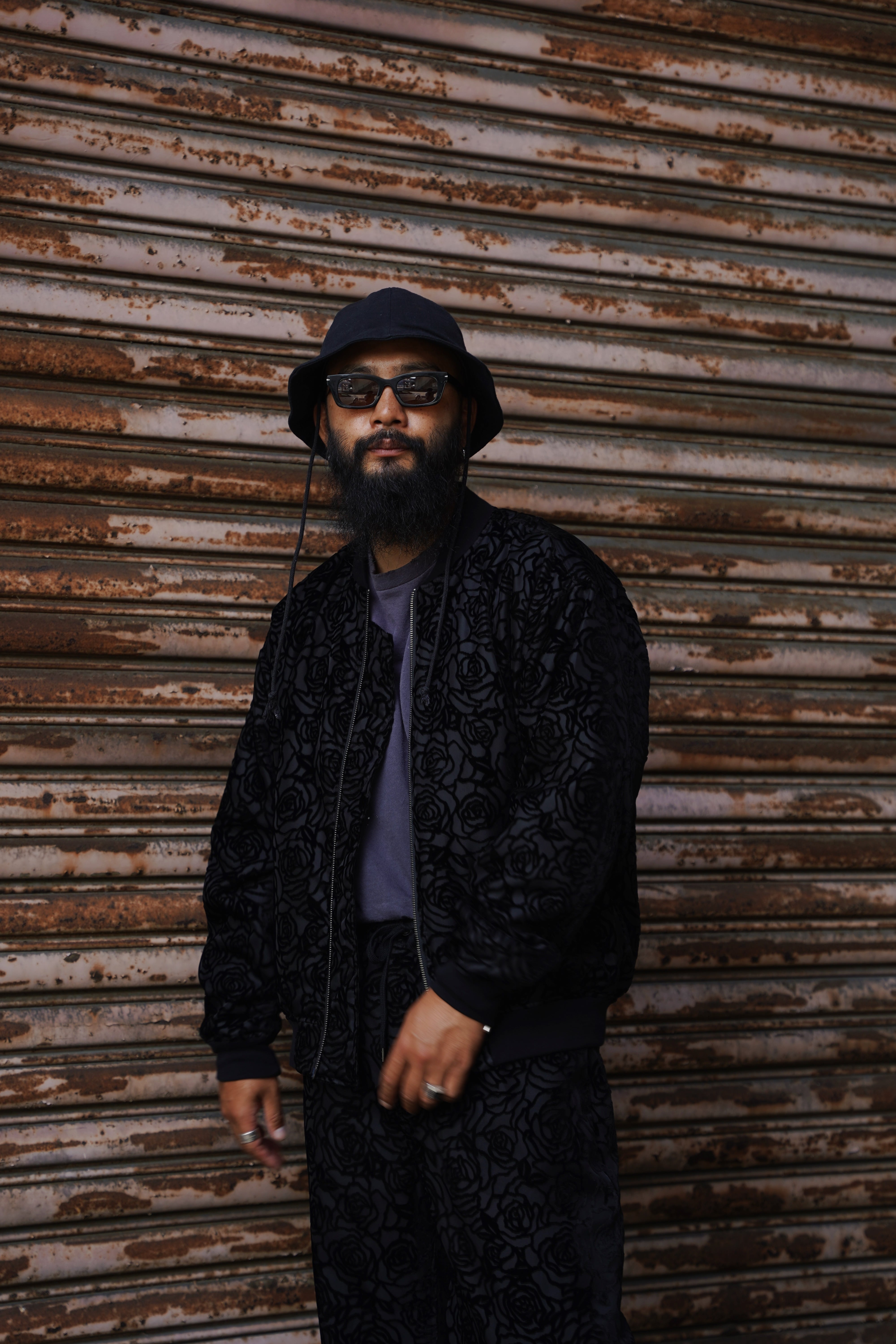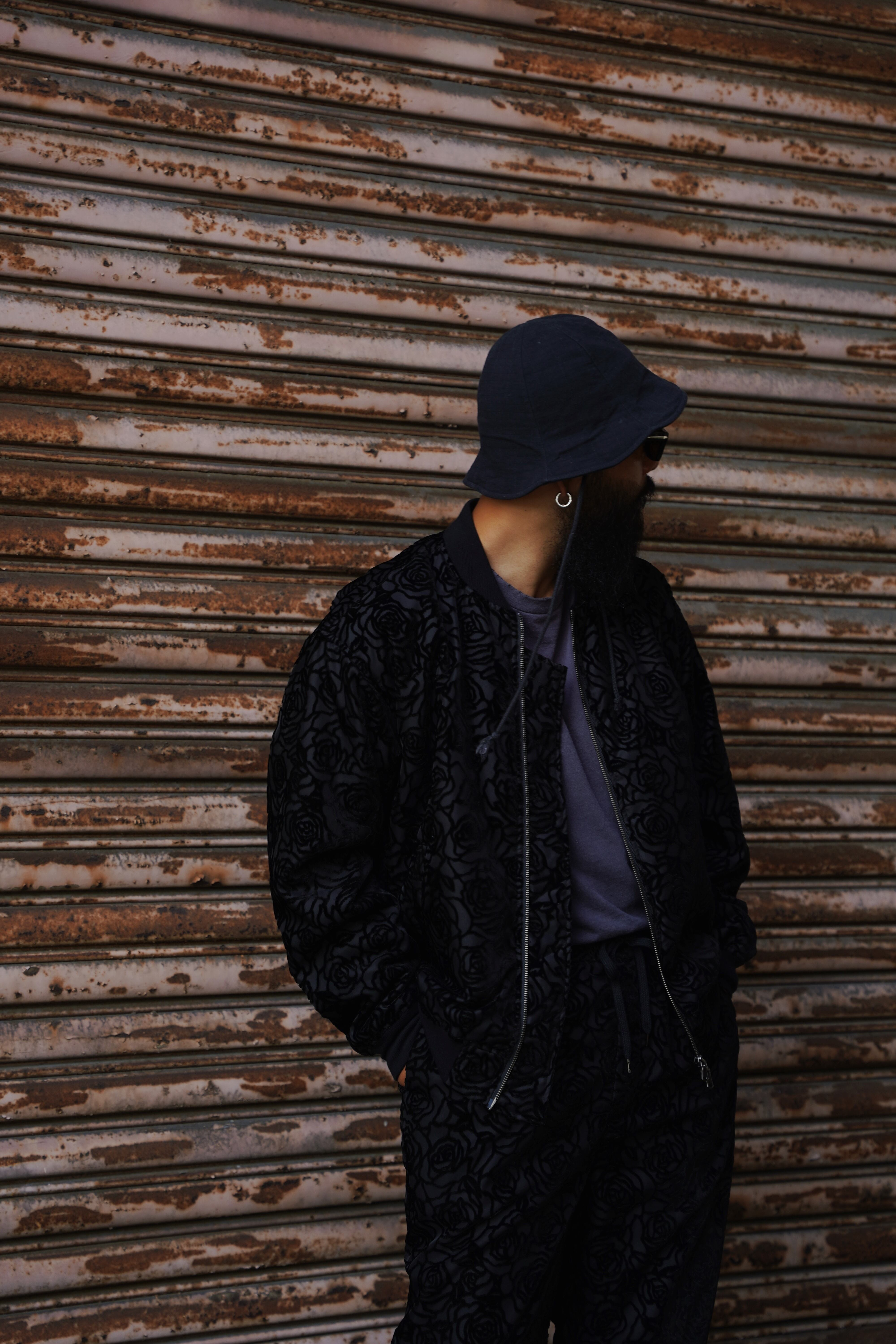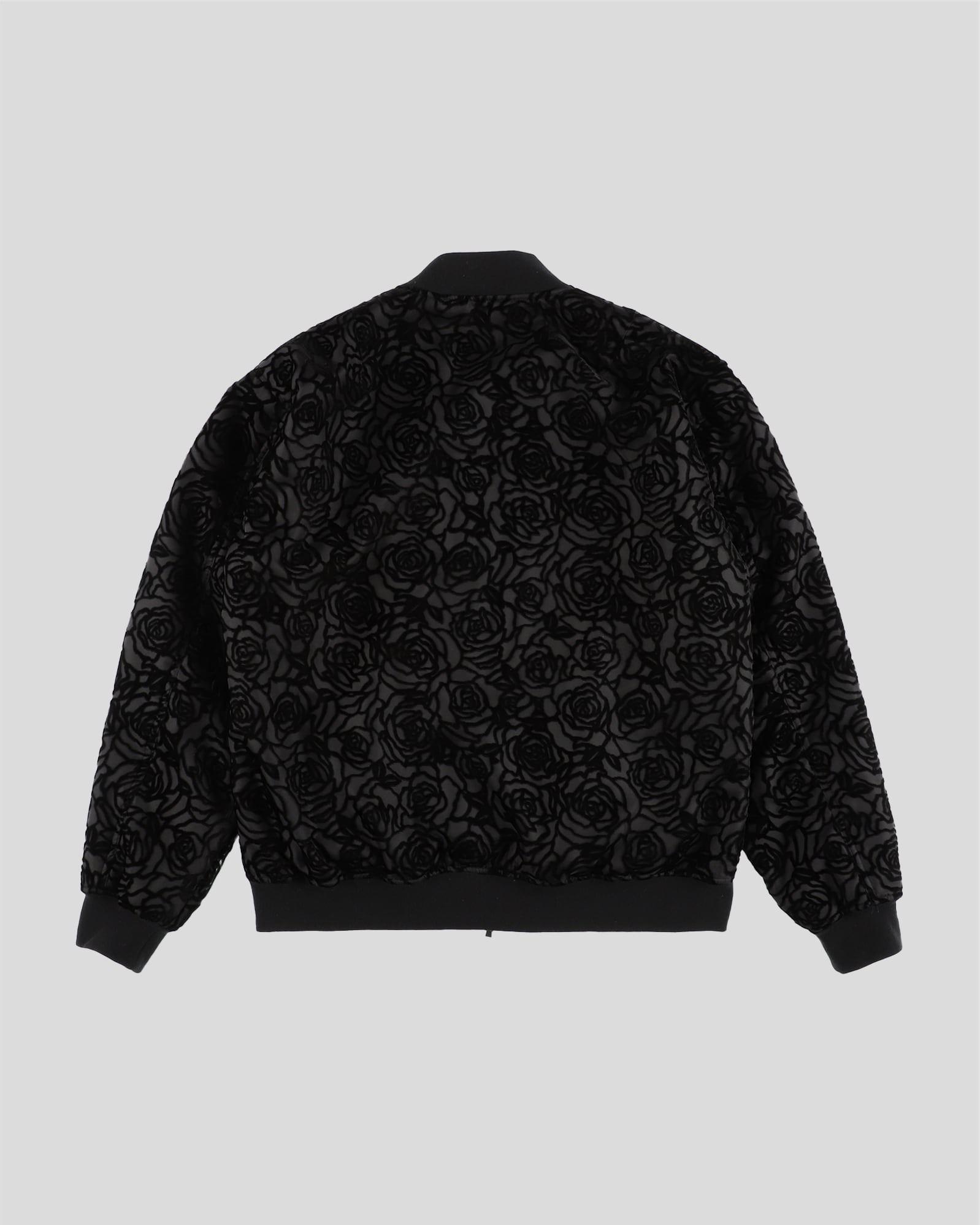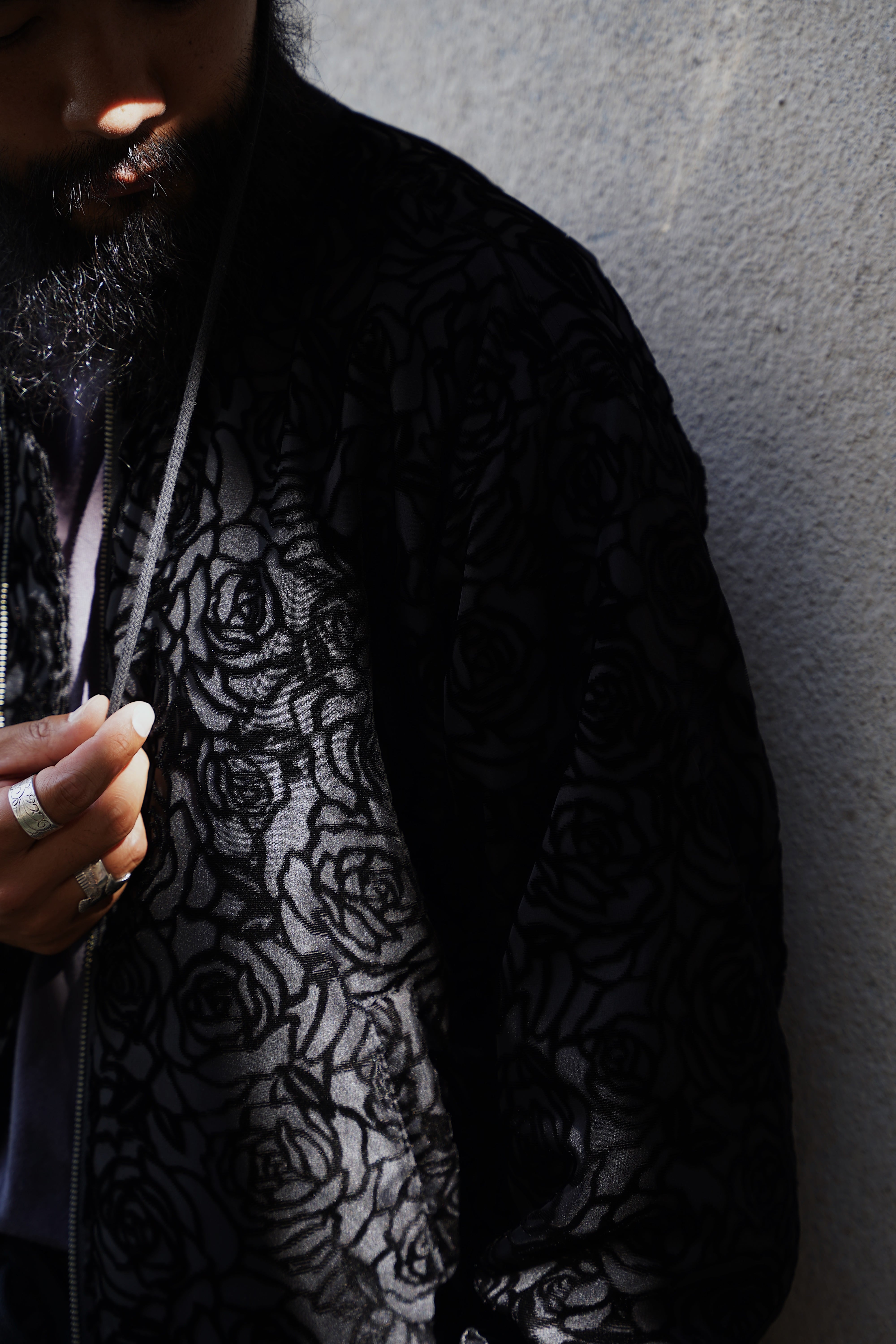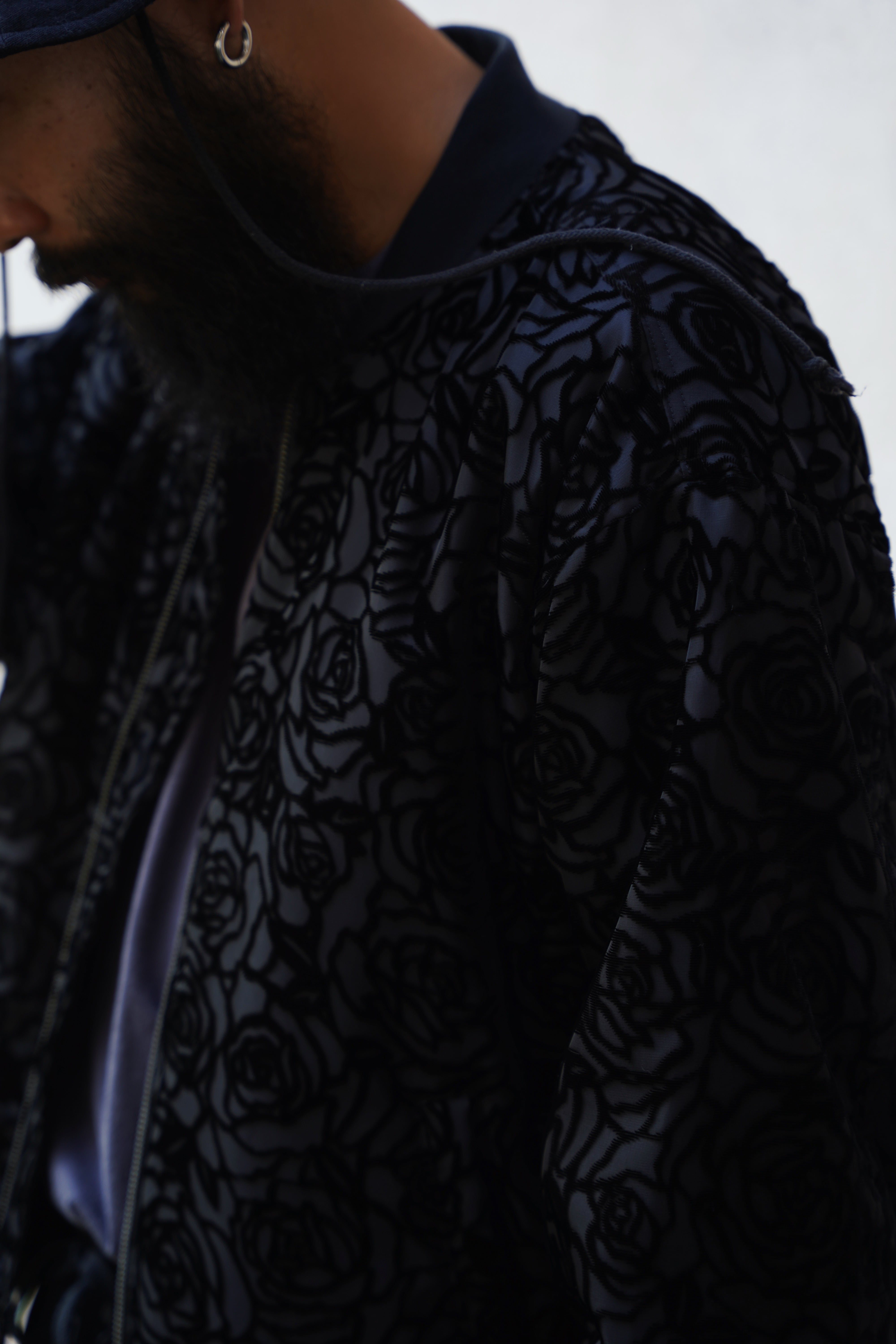 光沢の美しいレーヨンベルベットにオパール加工を施し、生地を溶かして無数のバラ柄を表現。4層からなる適度な膨らみと陰影が特徴的なブルゾン。薄めの中綿を使用し、幅広いシーズンでの着用を想定。