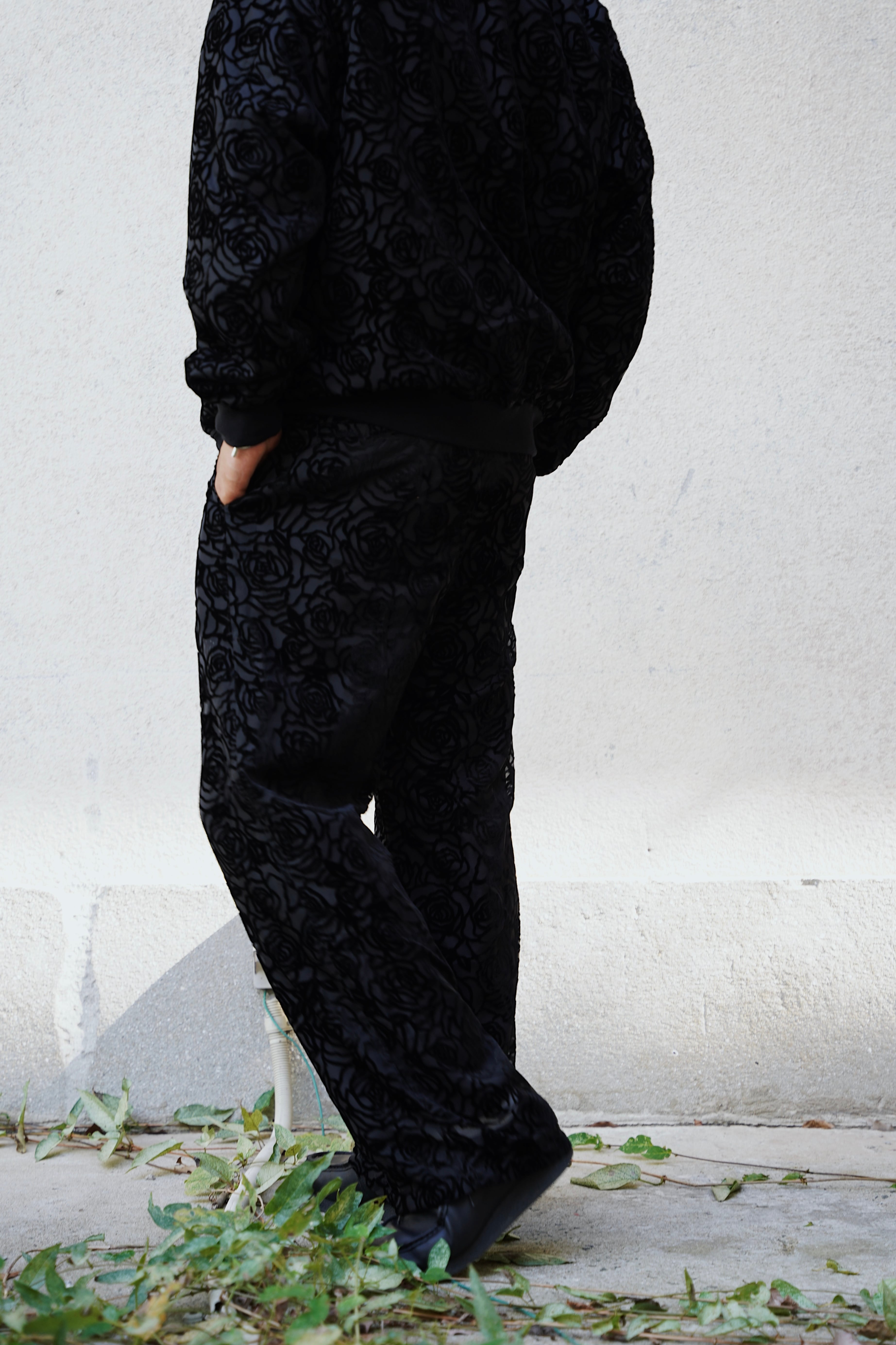 光沢の美しいレーヨンベルベットにオパール加工を施し、生地を溶かして無数のバラ柄を表現。
