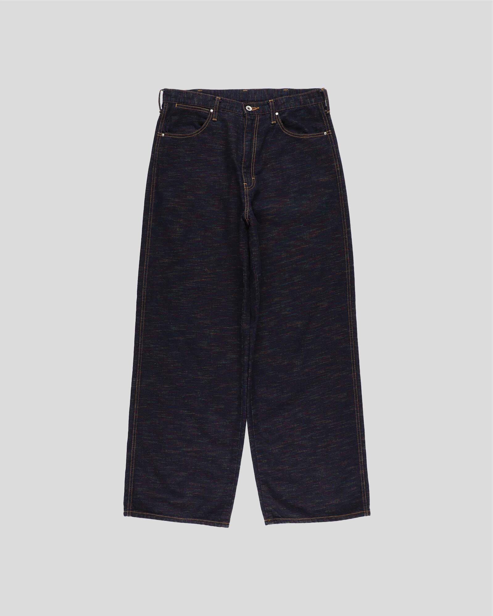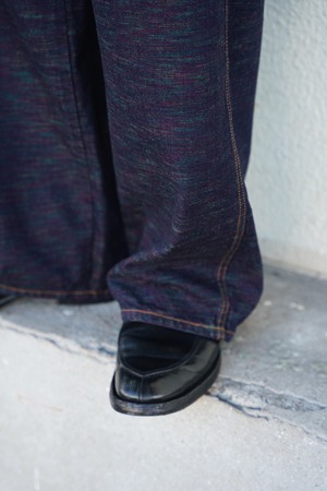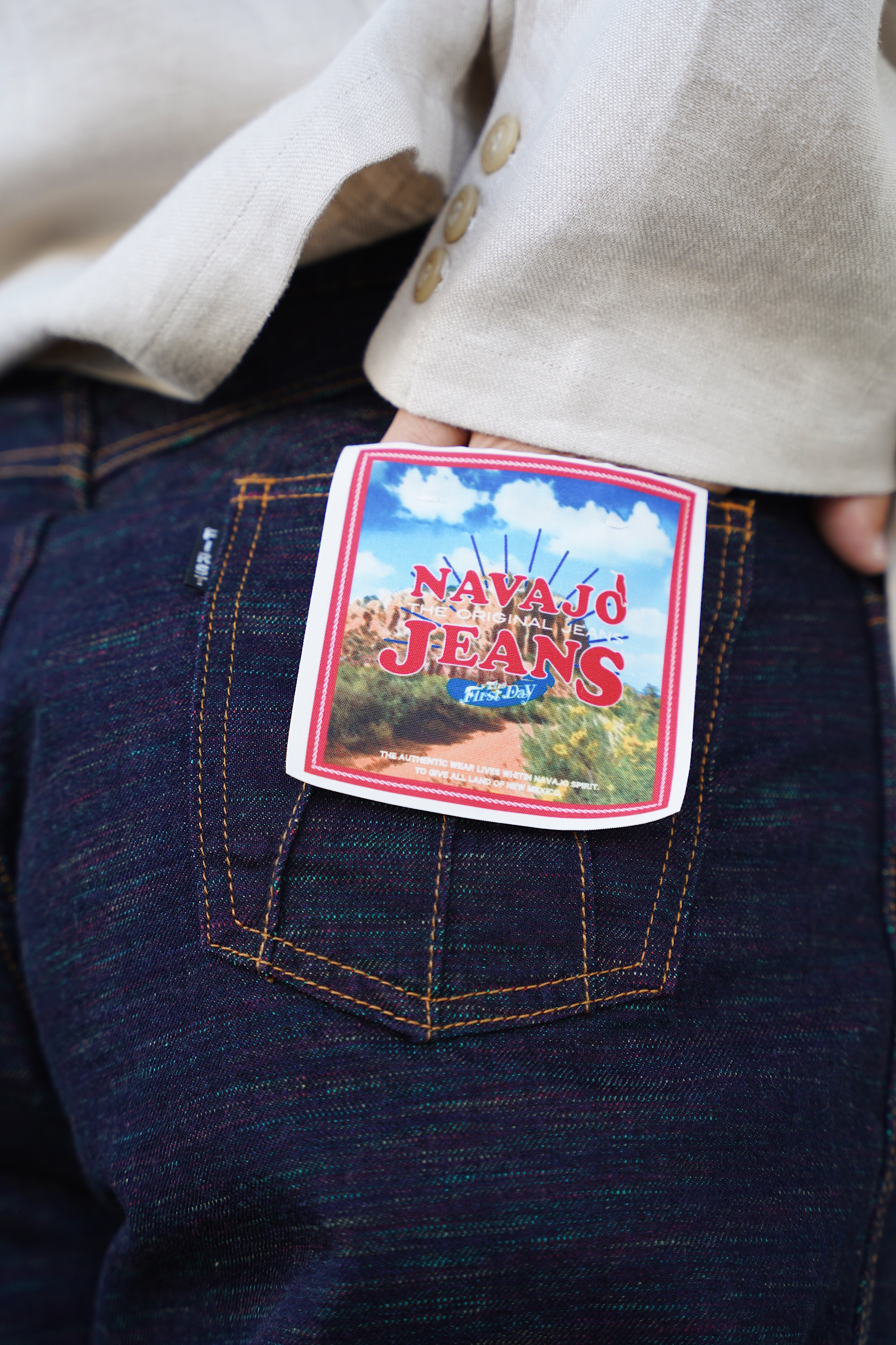 インディアンジュエリーのインレイワーク(はめ込み技法)をイメージし、カラフルなカスリ糸を使用した11.5ozデニムシリーズ。サンバースト(太陽光線)を思わせる随所のピンタック、スタッズワークをイメージしたリベット使いなど、ジュエリーにおけるナバホの技法やデザインをディテールとして採用。生地の製作から縫製まで全行程をデニムの産地岡山にて製造。縦糸にインディゴ、横糸にカスリ糸を使用しており、履き込むごとに色落ち、ムラ感がコントラストとして現れる一本。
