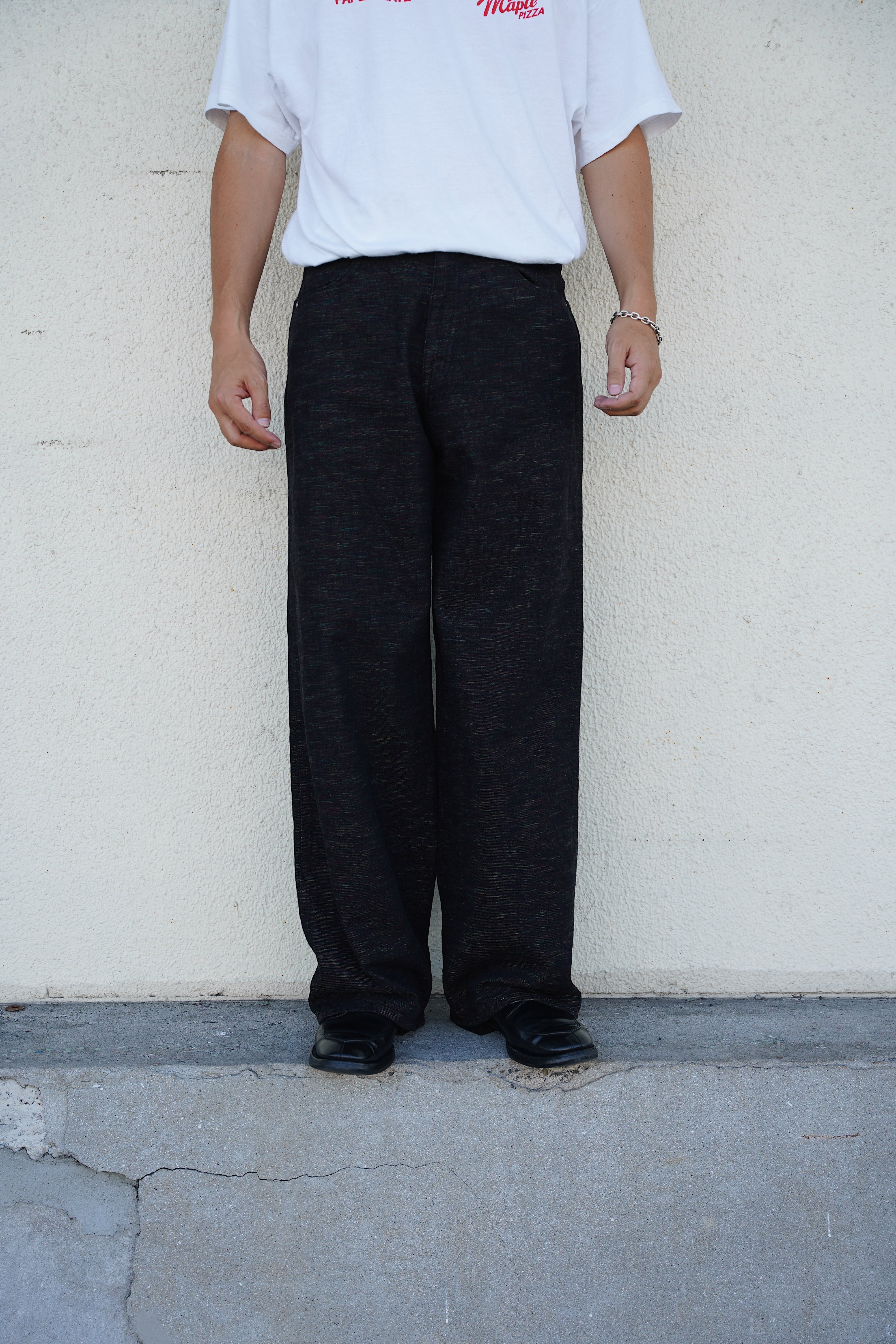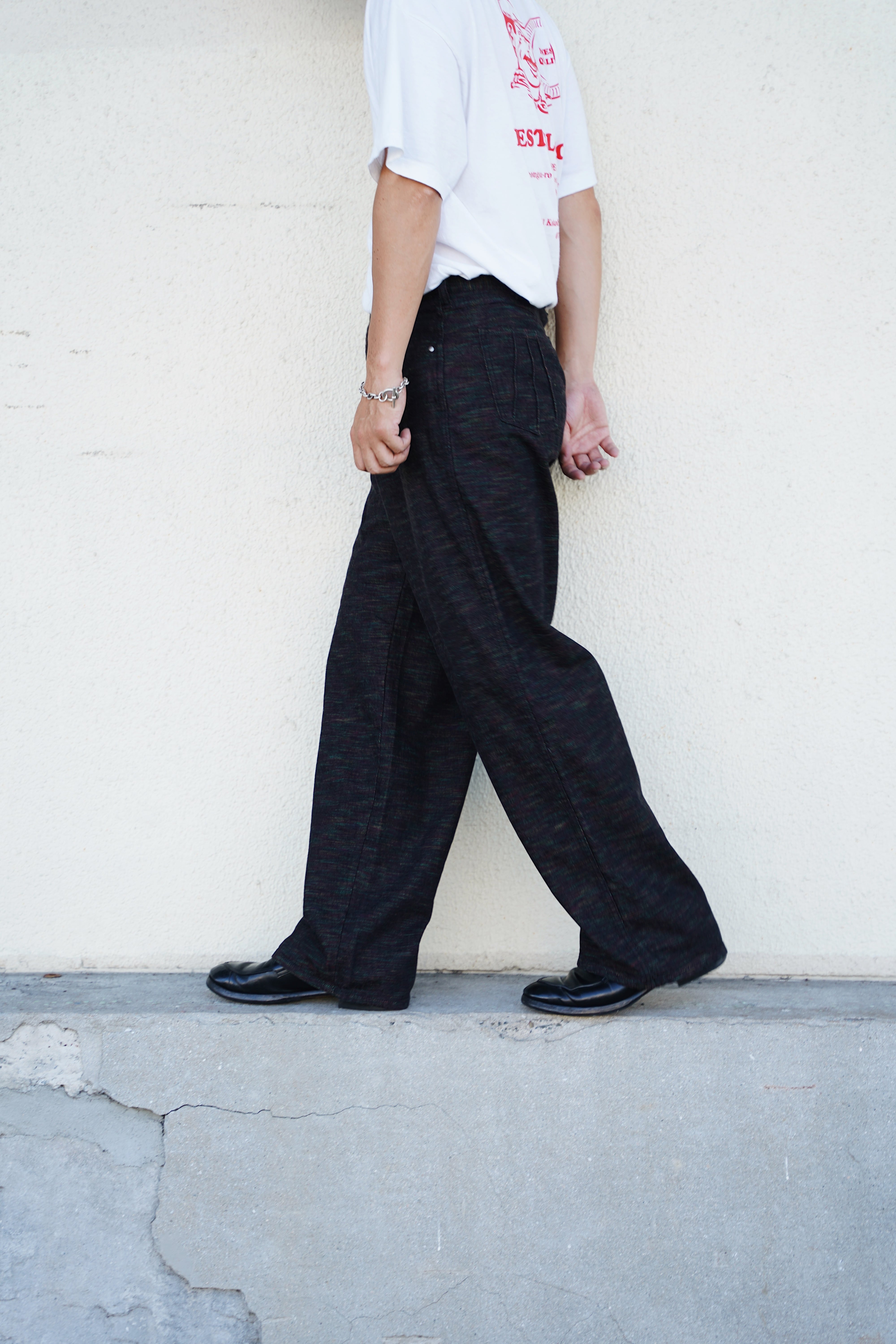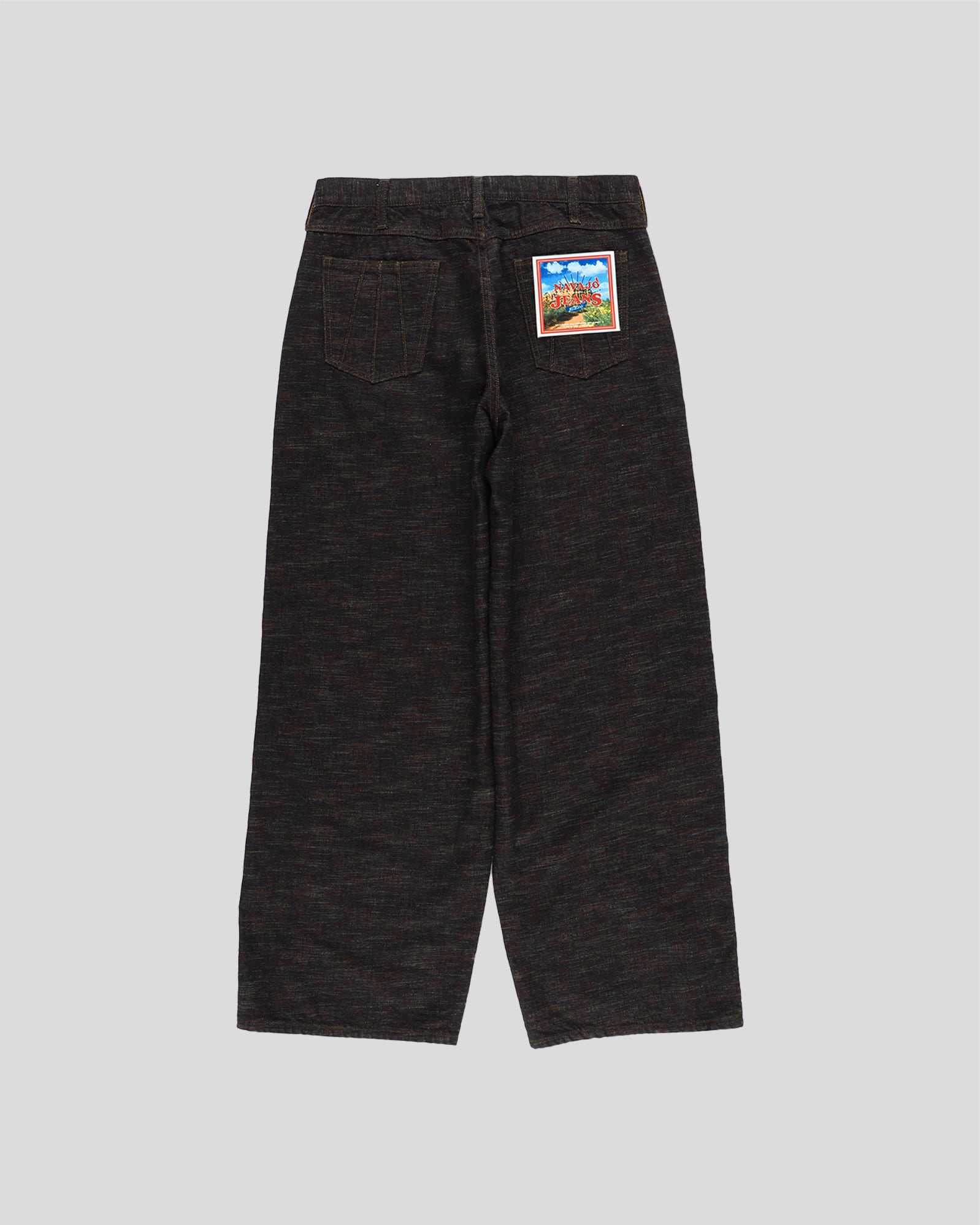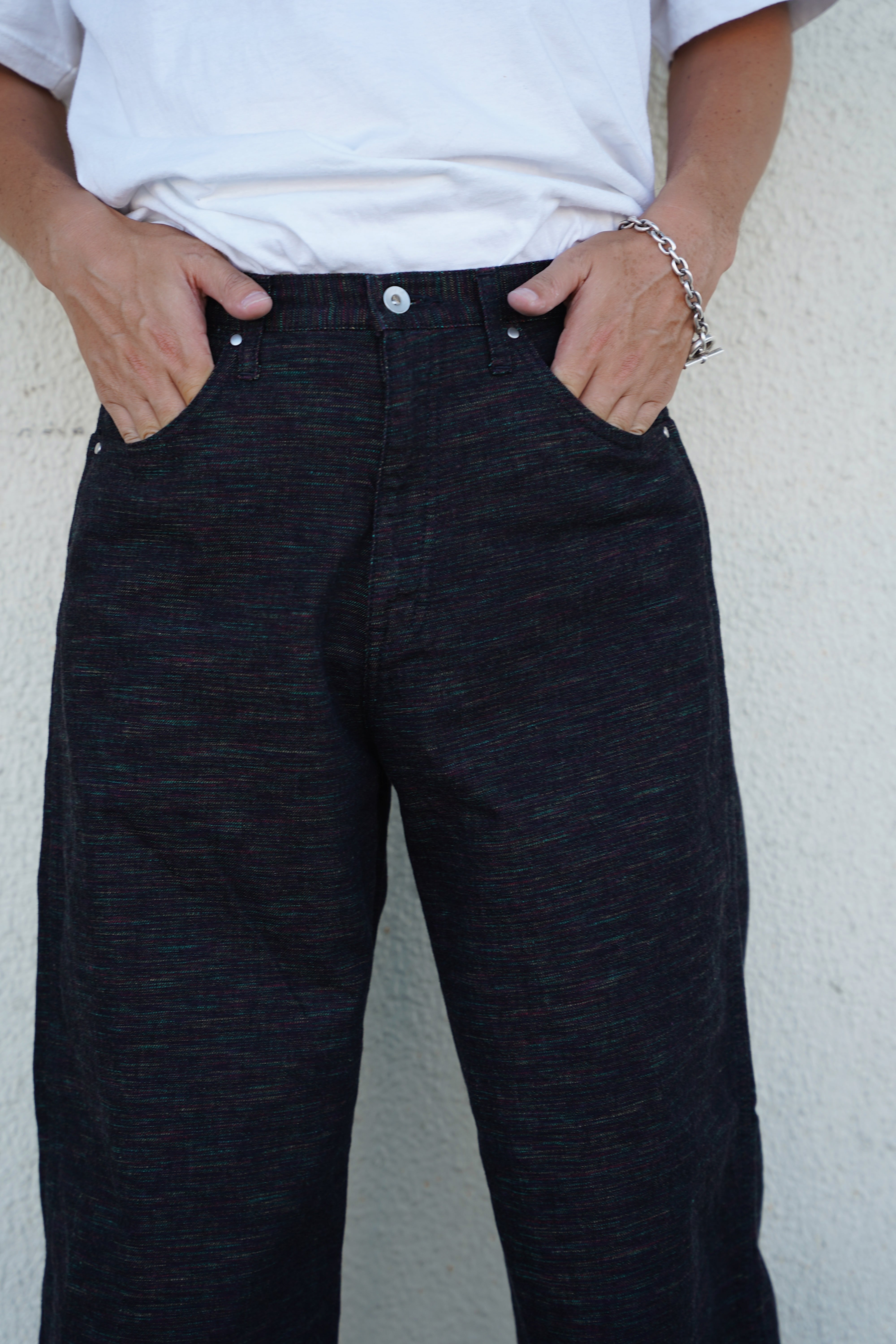インディアンジュエリーのインレイワーク(はめ込み技法)をイメージし、カラフルなカスリ糸を使用した11.5ozデニムシリーズ。サンバースト(太陽光線)を思わせる随所のピンタック、スタッズワークをイメージしたリベット使いなど、ジュエリーにおけるナバホの技法やデザインをディテールとして採用。生地の製作から縫製まで全行程をデニムの産地岡山にて製造。縦糸にインディゴ、横糸にカスリ糸を使用しており、履き込むごとに色落ち、ムラ感がコントラストとして現れる一本。