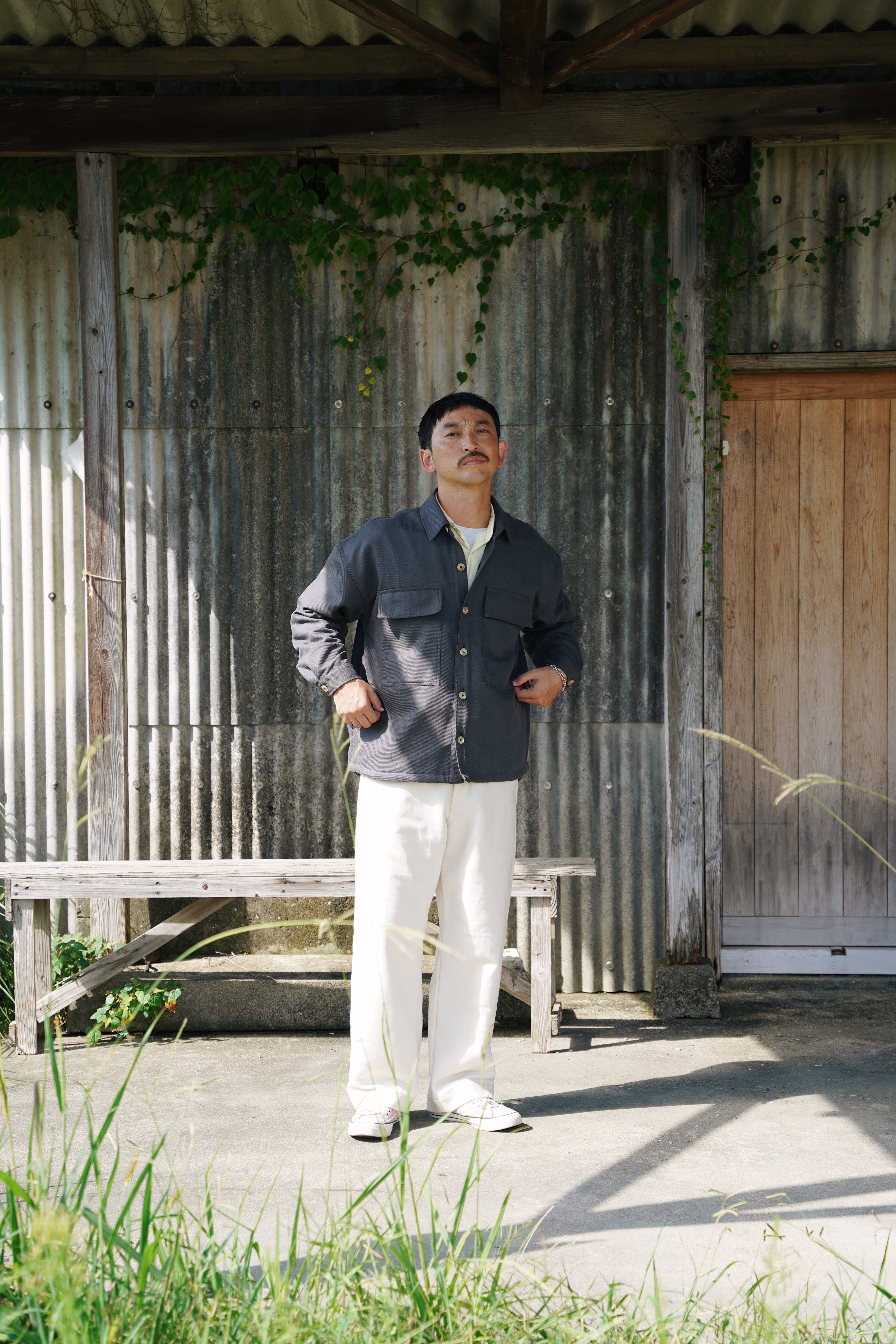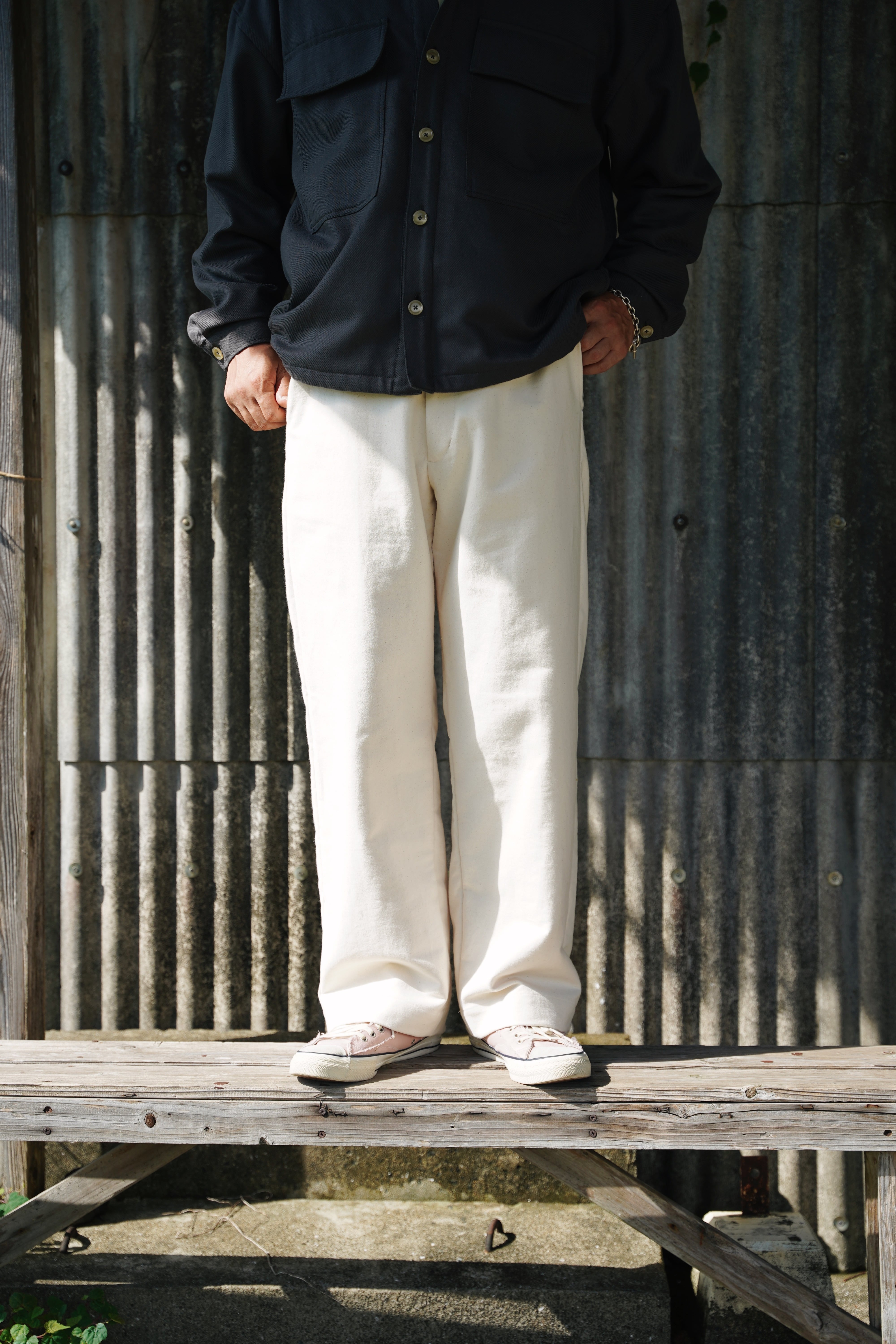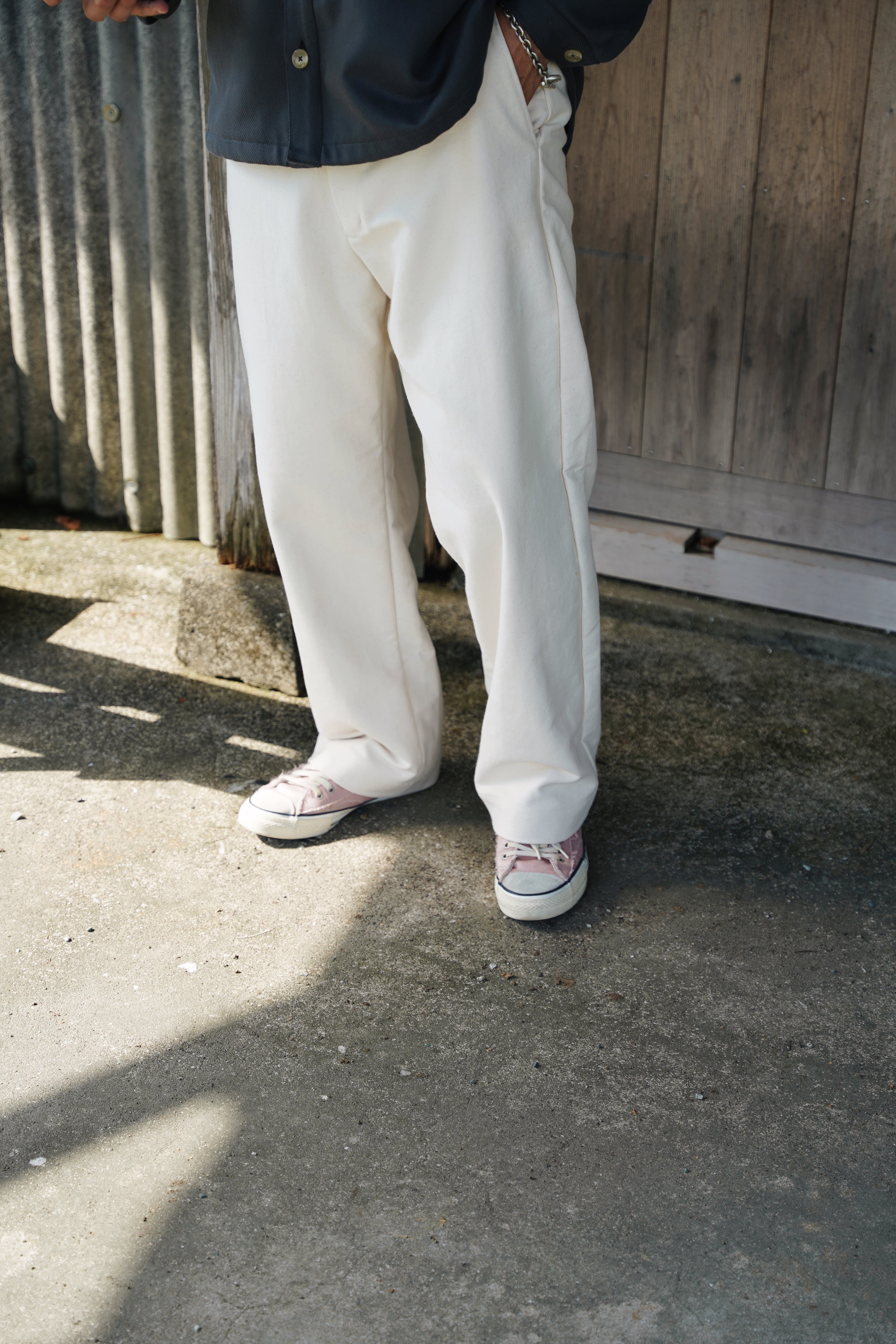 ヴィンテージ加工を施したチノクロスを使用したワイドスラックス。