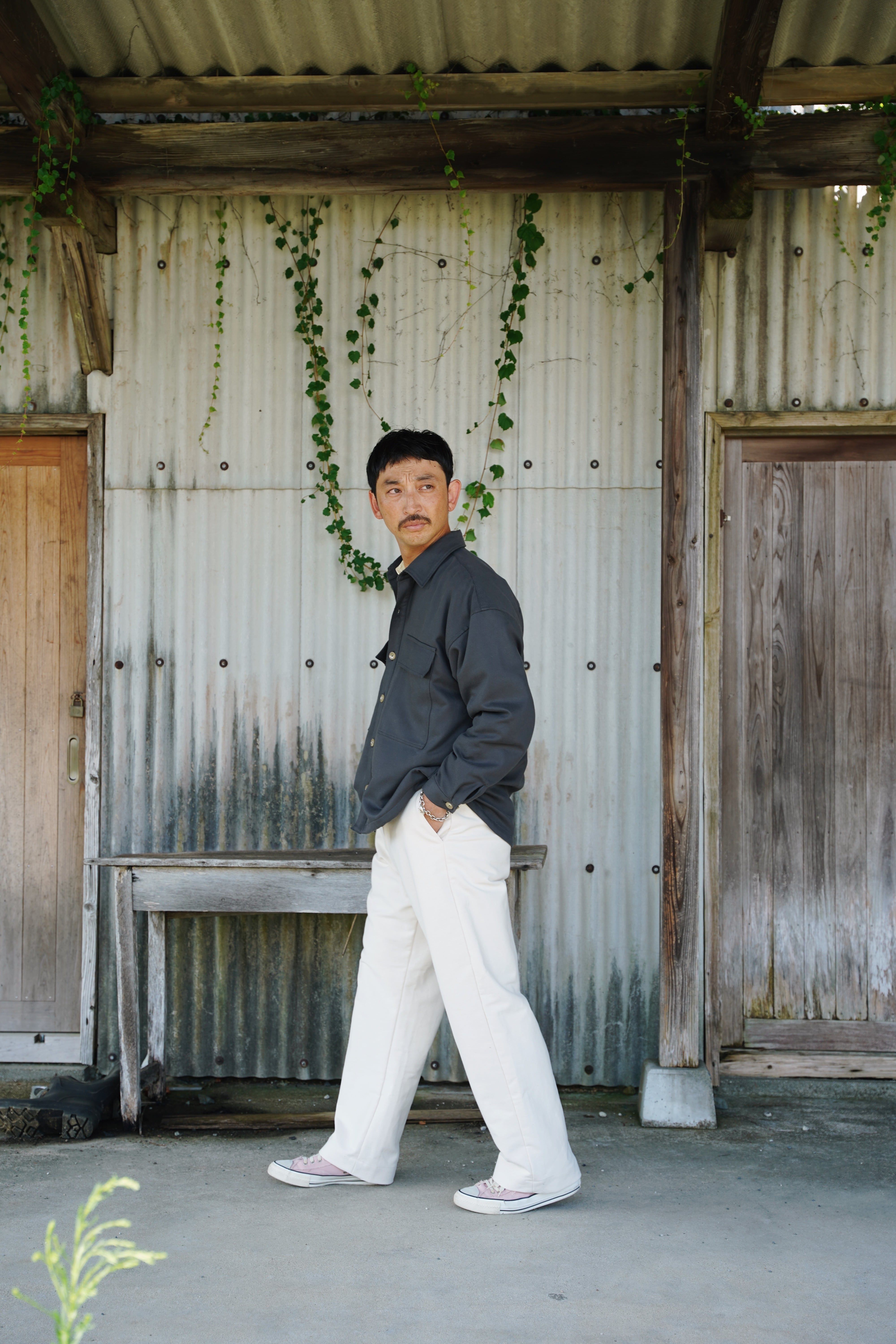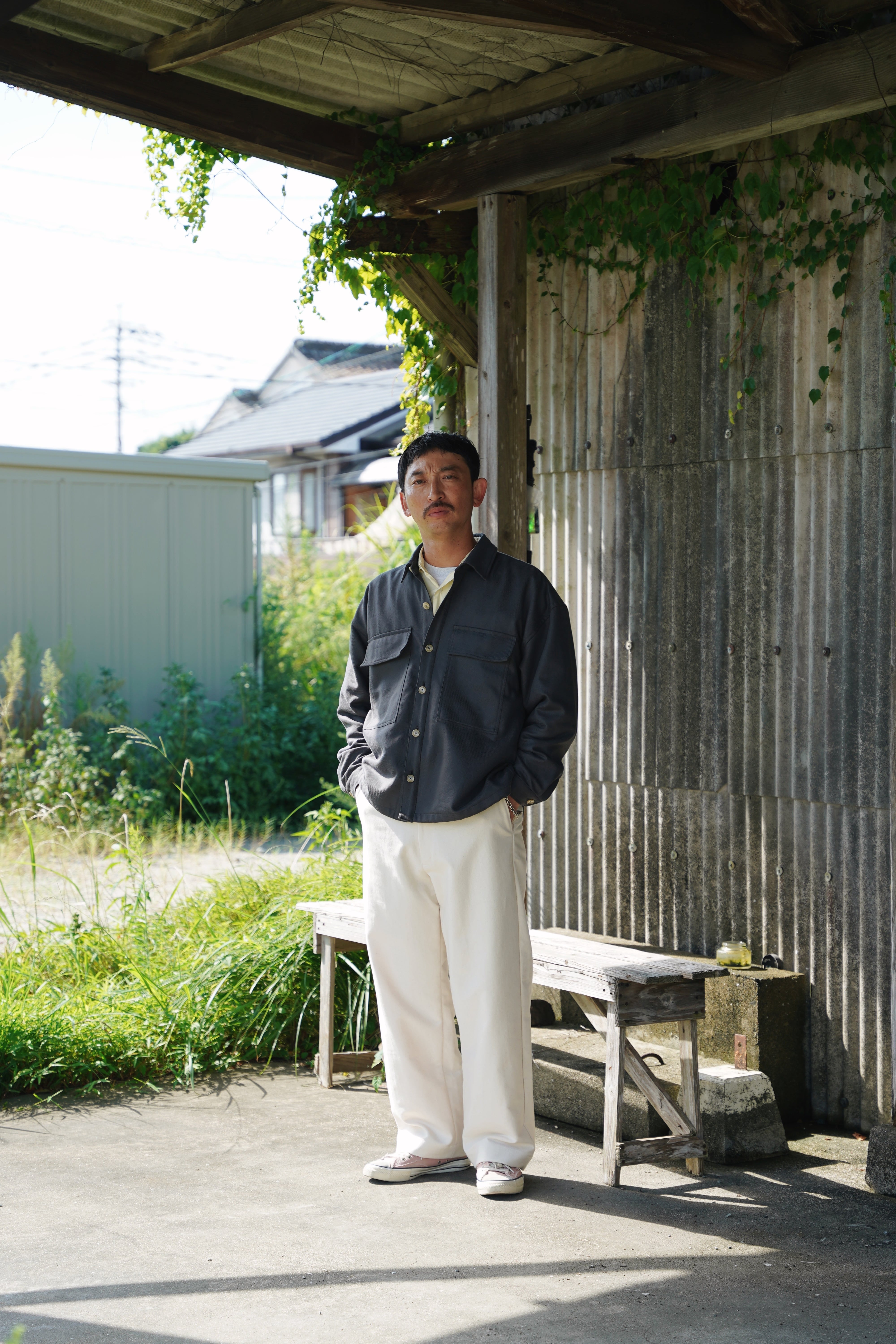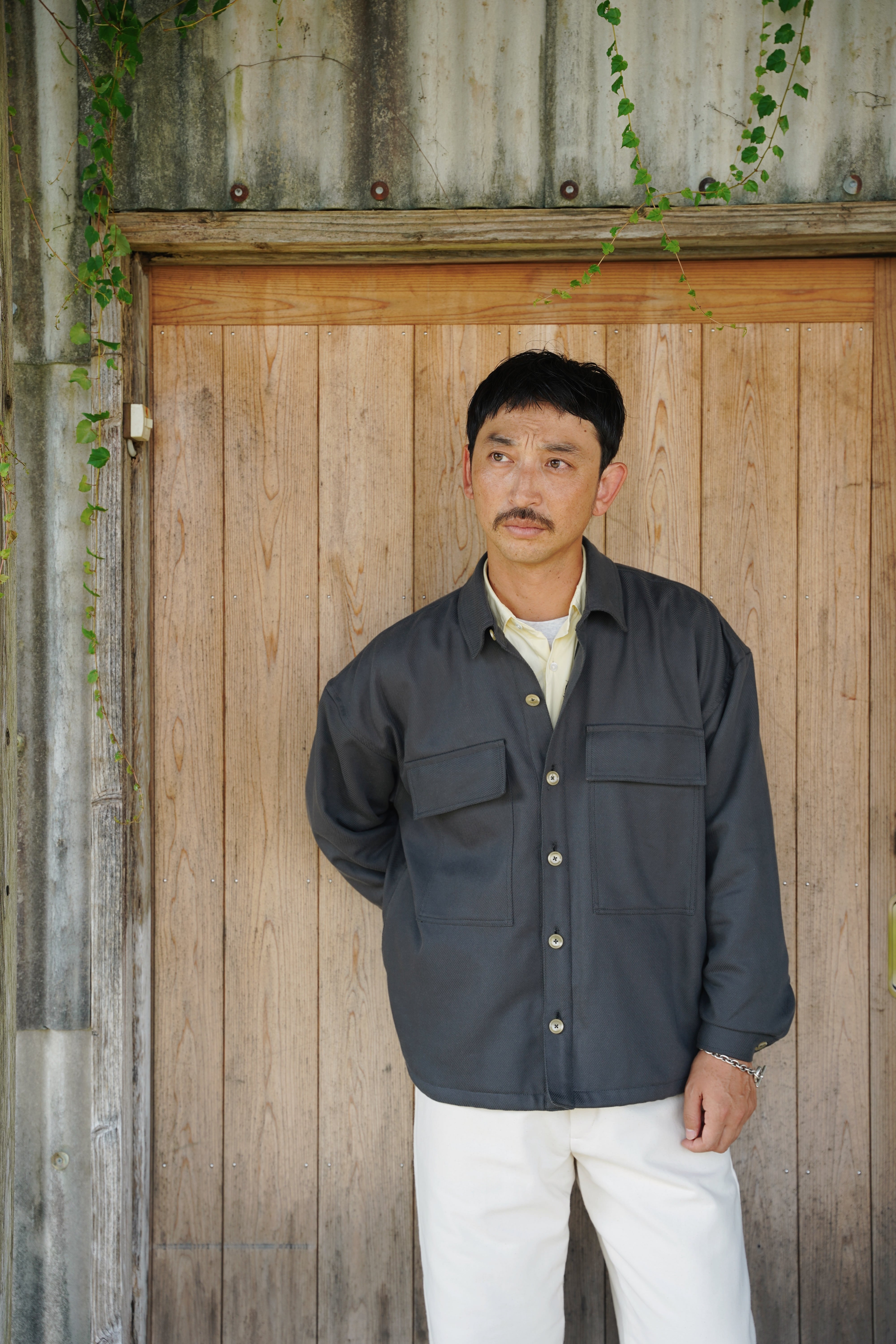 背面をラウンドカット仕様にし、裏地を付けずに肉厚すぎない生地を採用することでシャツとしての雰囲気を残しながら、シルエットを身幅広め着丈短めに設定し、サイドにスリットポケットあしらうことでジャケットとしてのディティールも兼ね備えている。