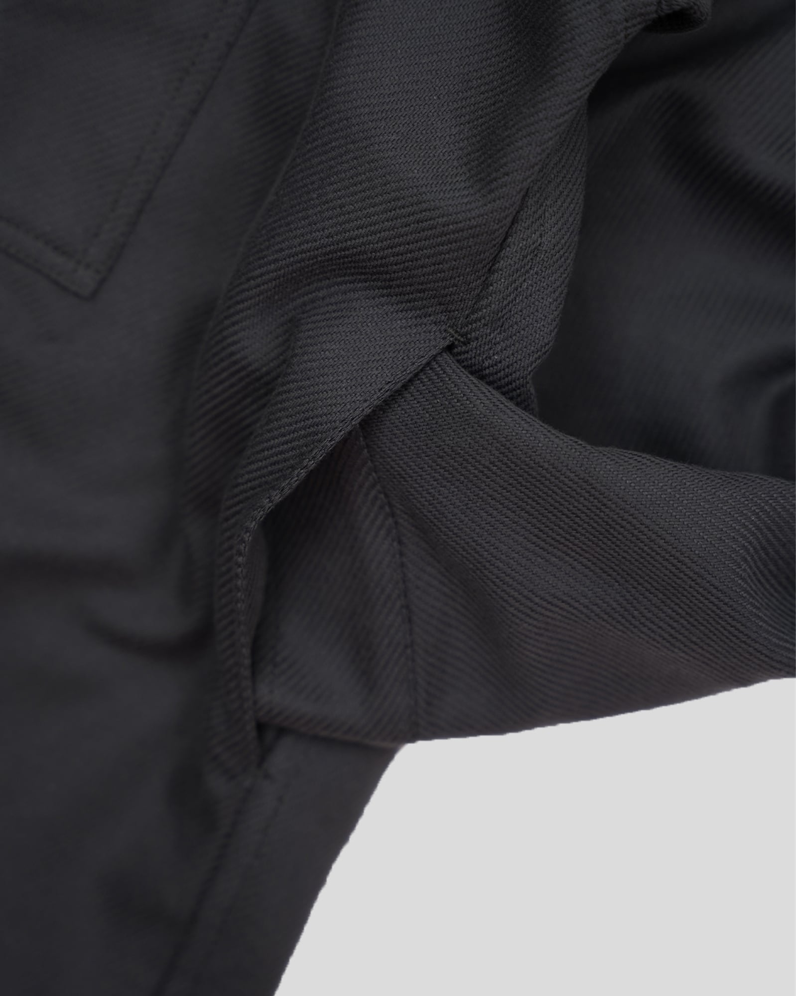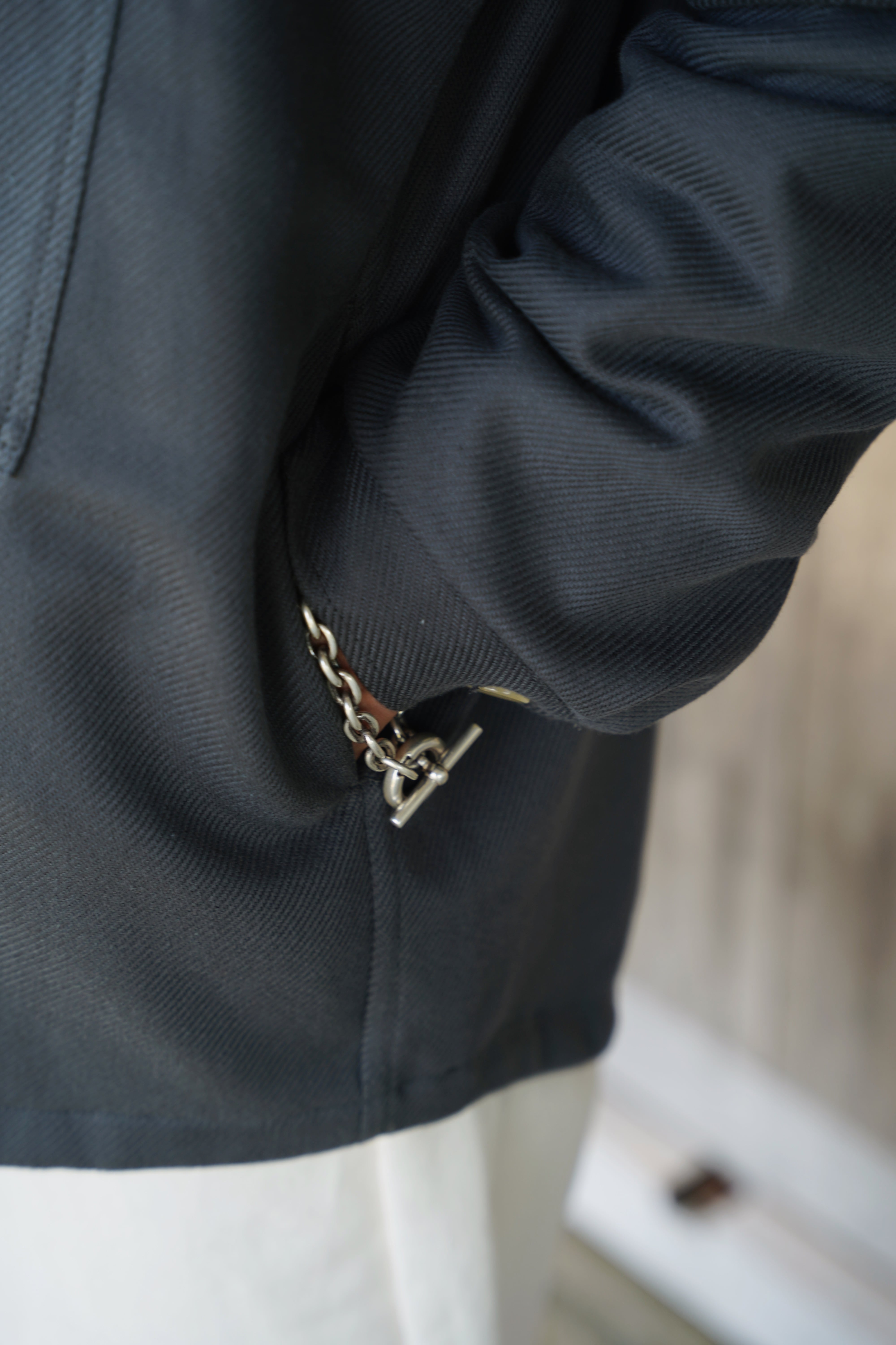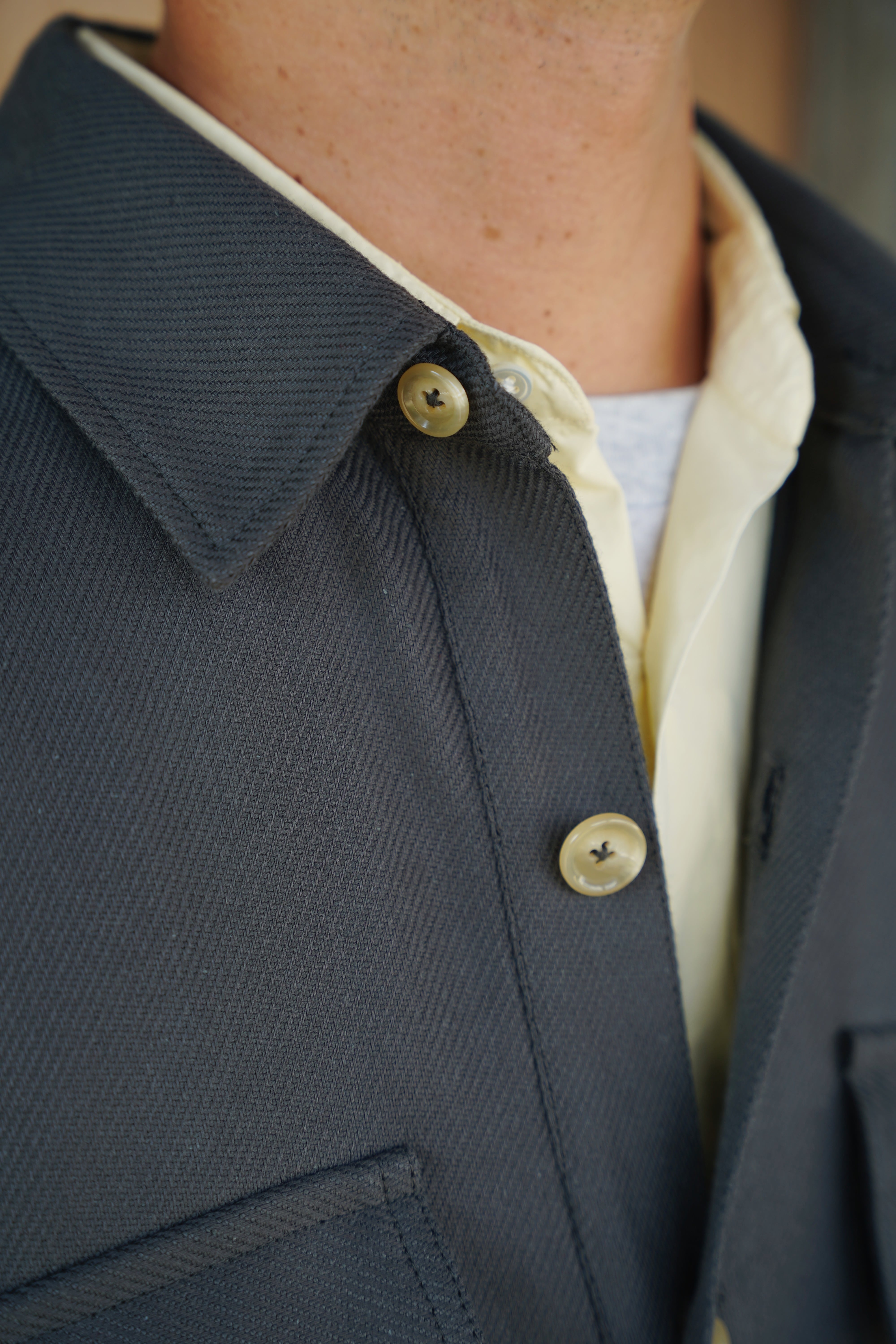 背面をラウンドカット仕様にし、裏地を付けずに肉厚すぎない生地を採用することでシャツとしての雰囲気を残しながら、シルエットを身幅広め着丈短めに設定し、サイドにスリットポケットあしらうことでジャケットとしてのディティールも兼ね備えている。