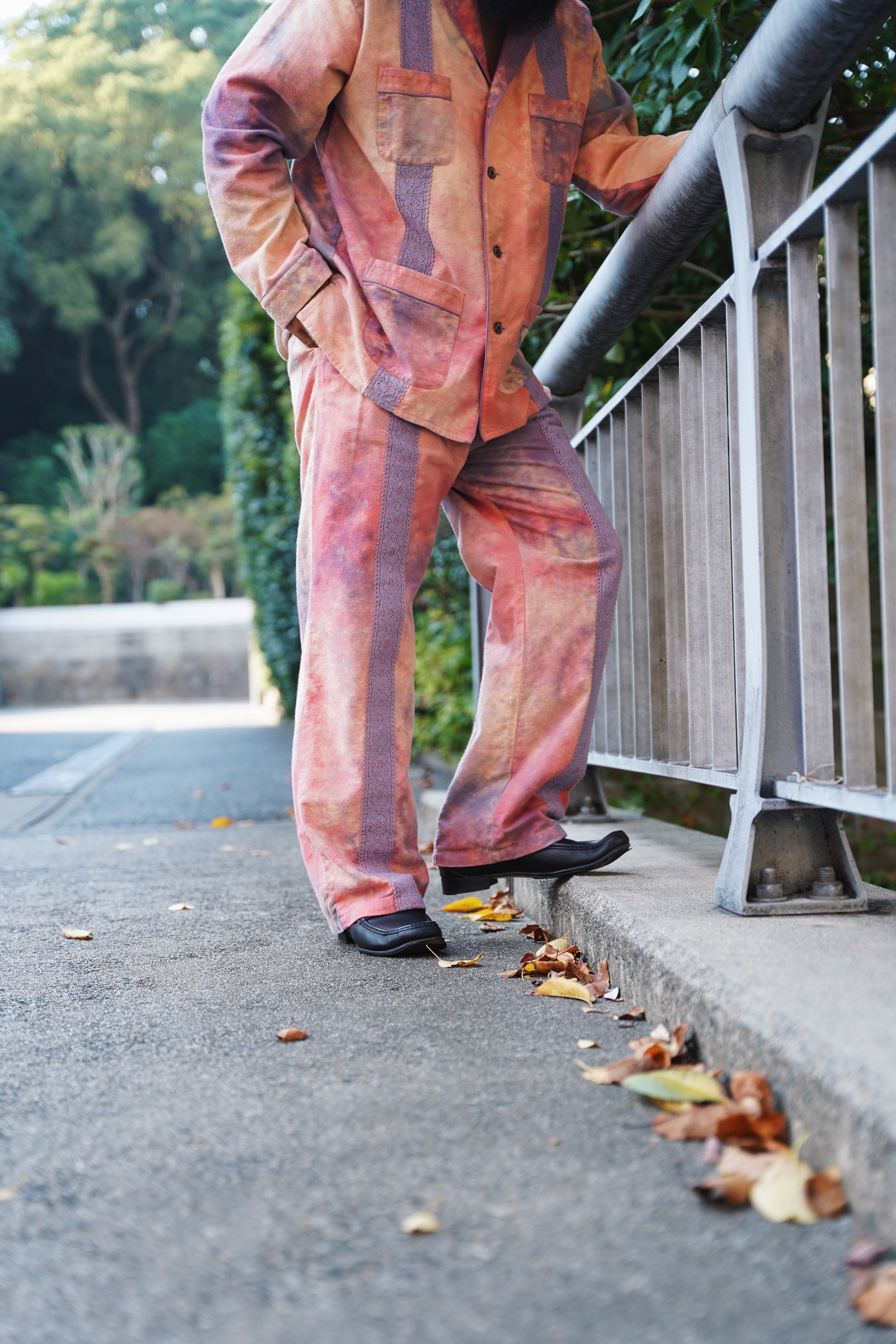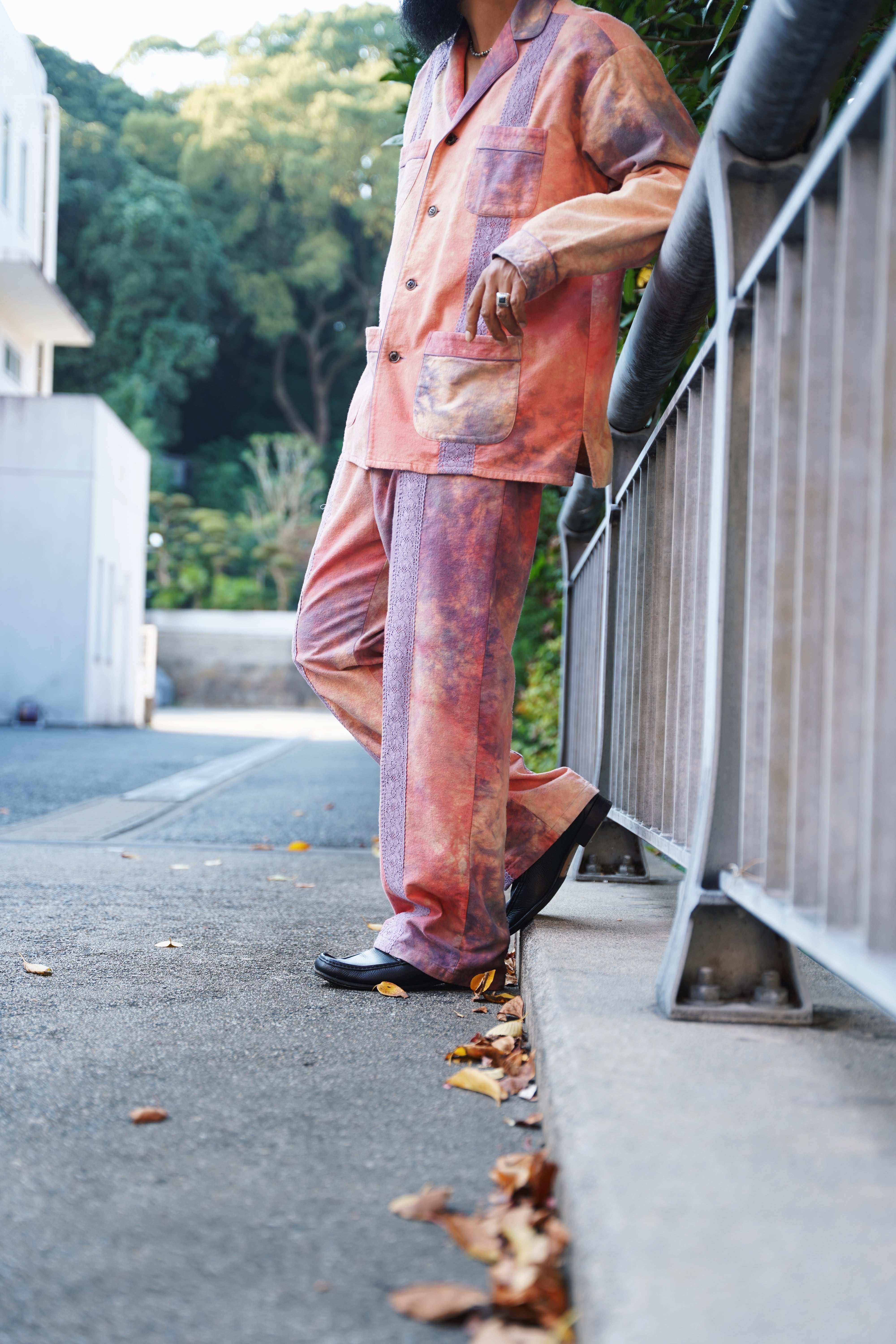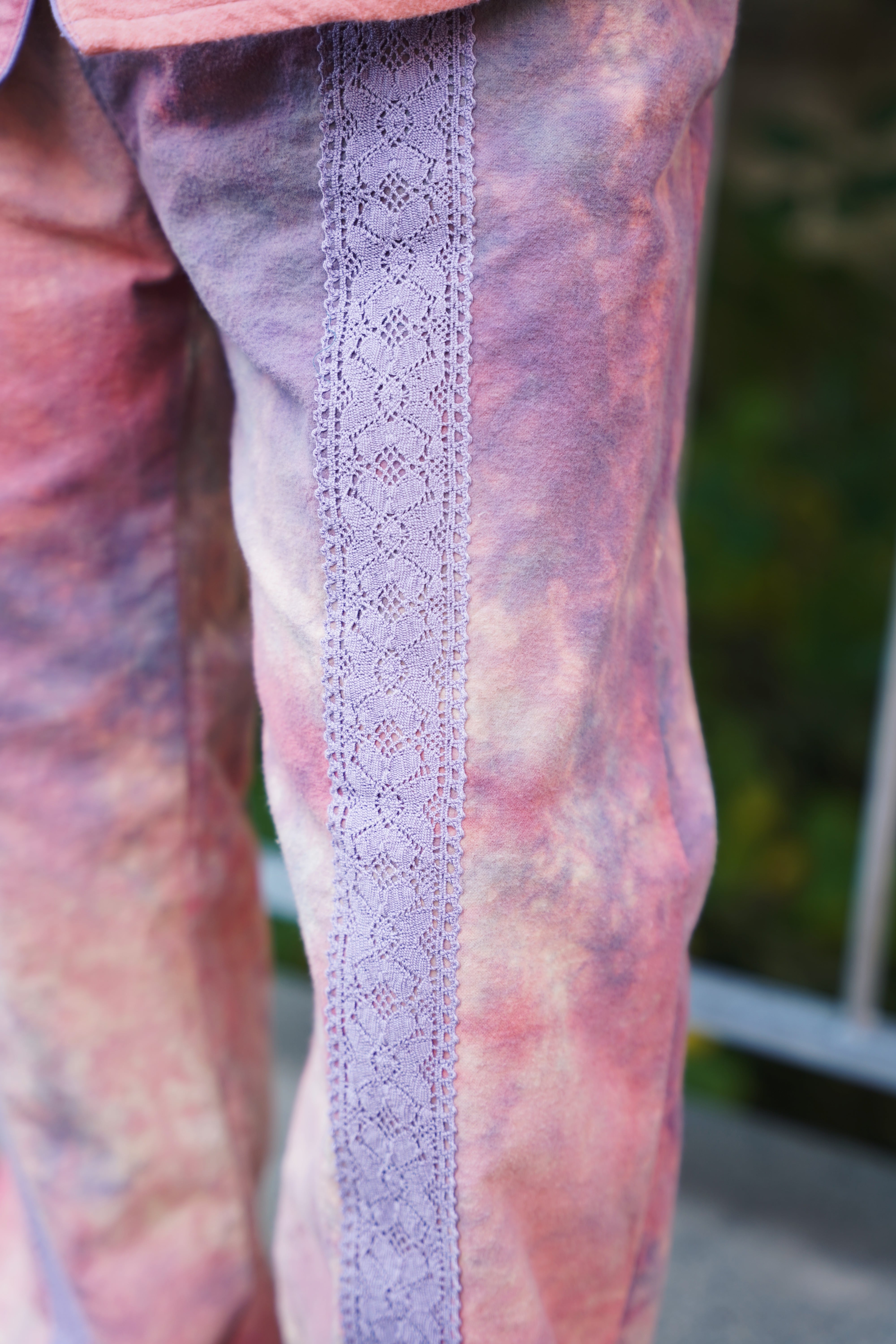 両面起毛のフランネルにムラ染めを施したイージーパンツ。トップス同様に身頃にレースを配置。