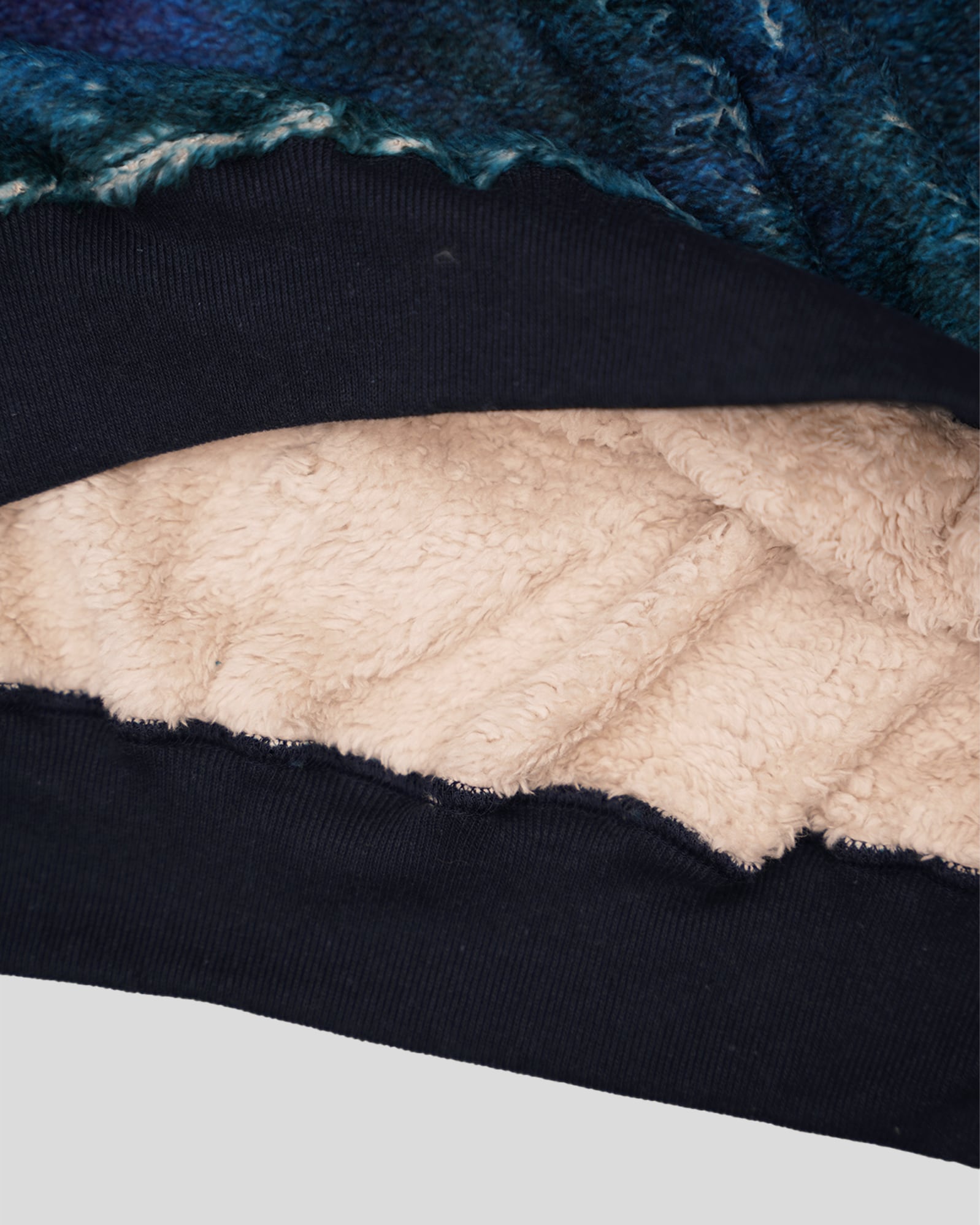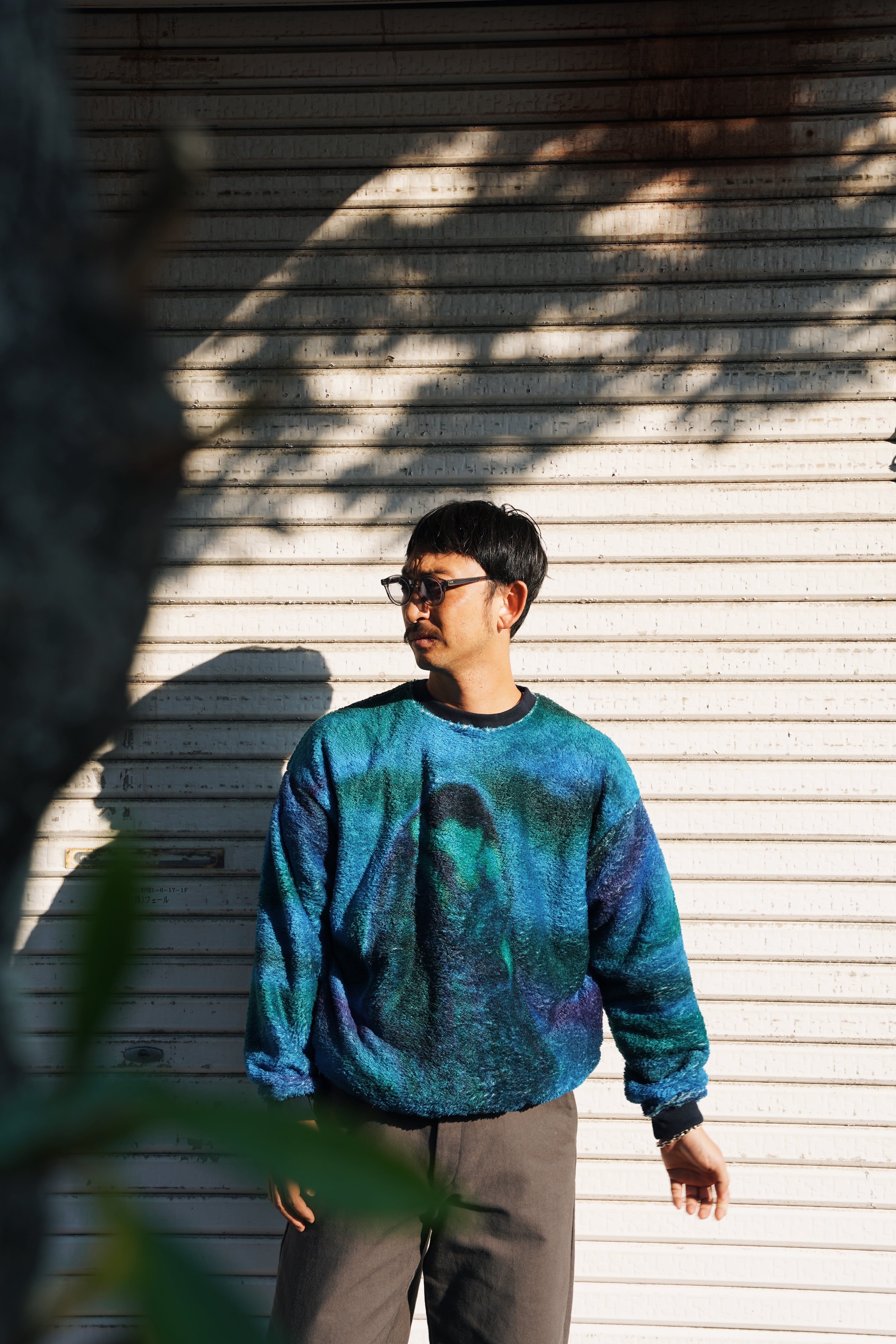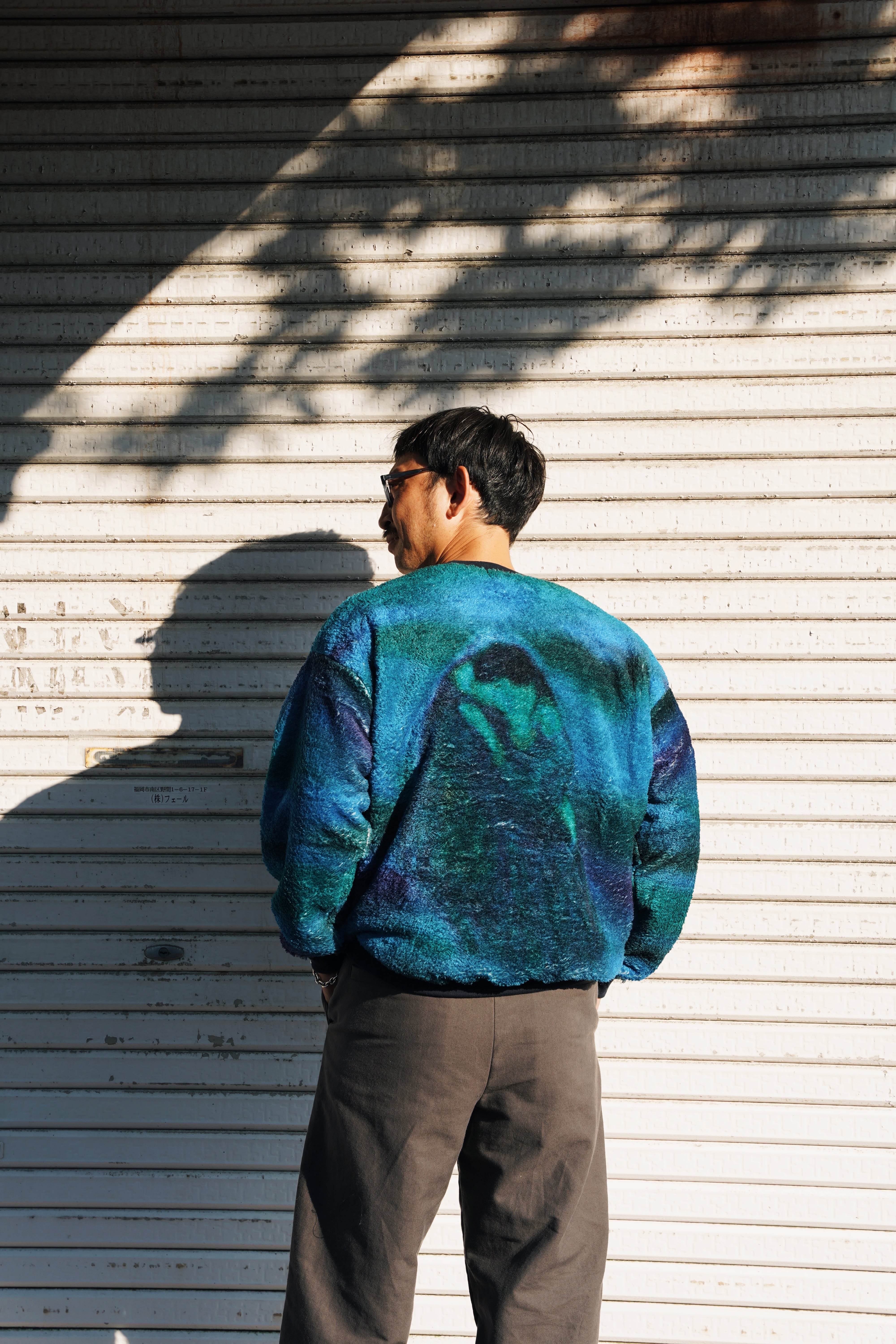 両面起毛を施した軽量で保温性の高いボアフリースに転写プリントで柄を表現。寄り添い口づけを交わす男女を「TWILIGHT」と「NIGHT」のシュチュエーションに配置。温かい空気を外に逃さずミドルレイヤーとして重宝するプルオーバー。