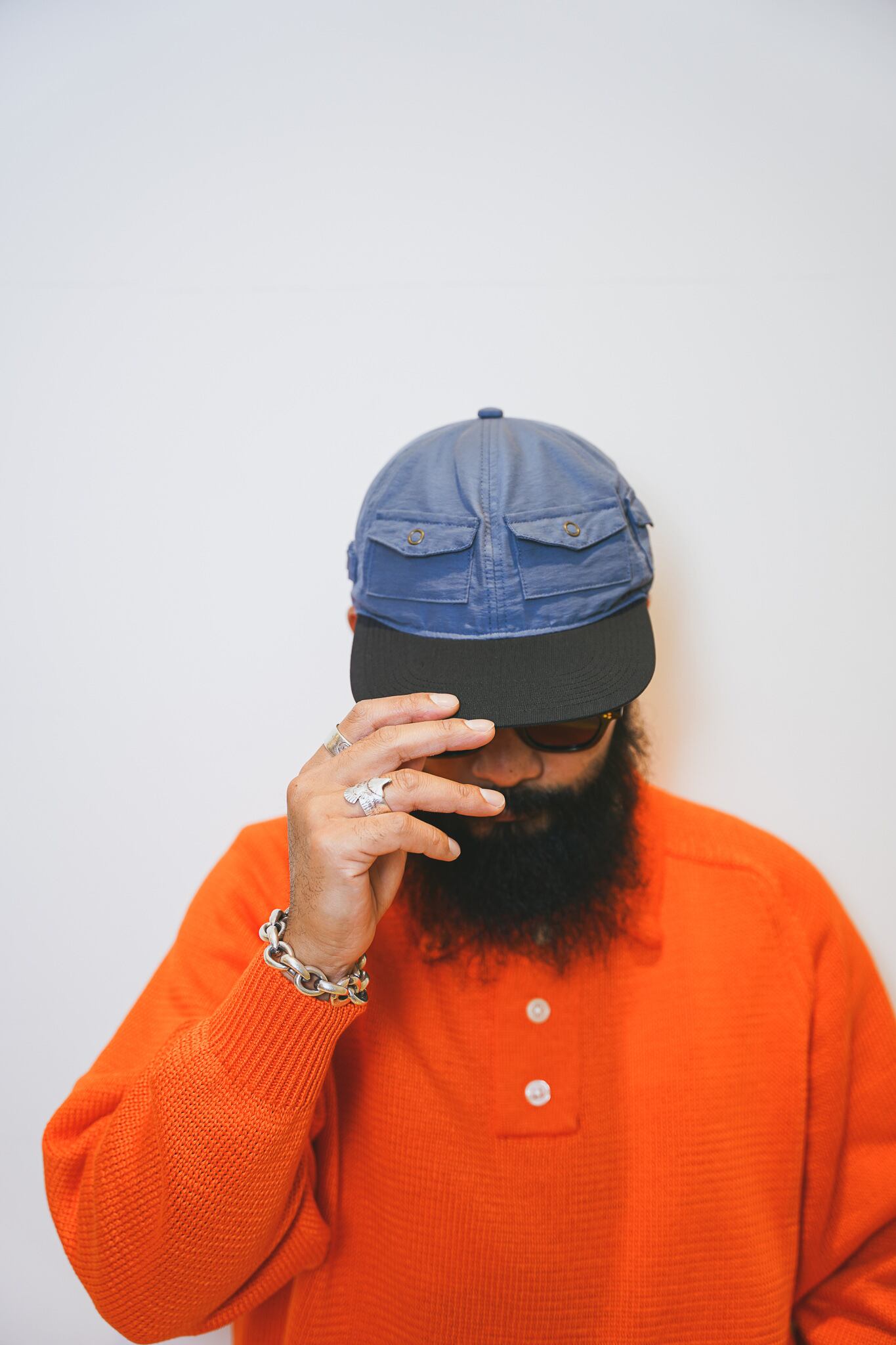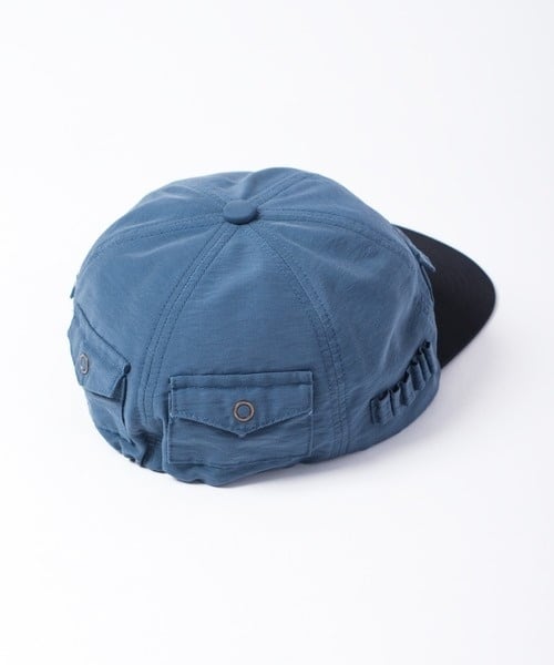 ポケットがアクセントになった6パネル仕様。5つのポケットと右側パネルにはAirPodsを挿せる波型ベルトディテールを採用。生地は60/40クロスを使用しており、軽い雨にも対応可。内側スベリの一部はゴムになっており、サイズ調整が可能。
