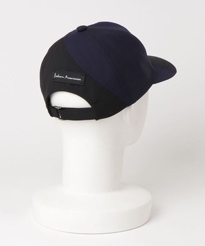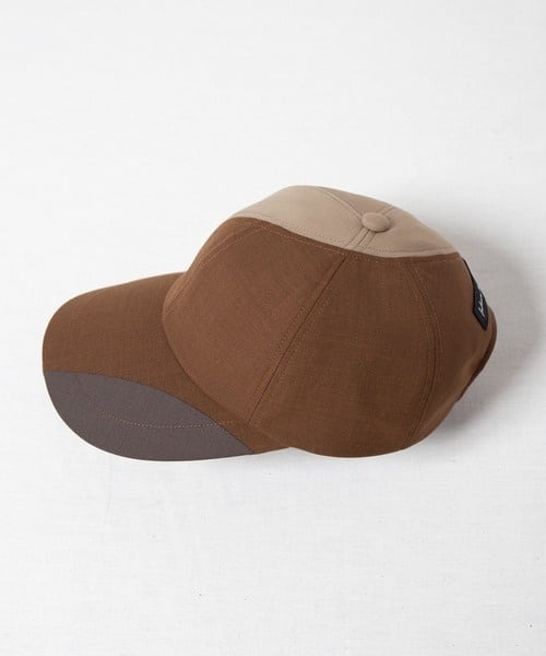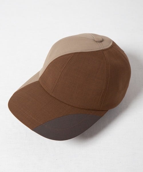 3色のサマーウール生地を使用したCAP。 曲線をえがくように切替されたデザインが特徴。 生地は天然素材ならではの通気性、清涼感があるサラリとした肌触り。 80mmとやや長めのブリムを採用し,切り替えのデザインと相まってコーディネートのアクセントに。 後方はサイズ調整可能なベルクロ仕様になっており角カンが上品さを演出。