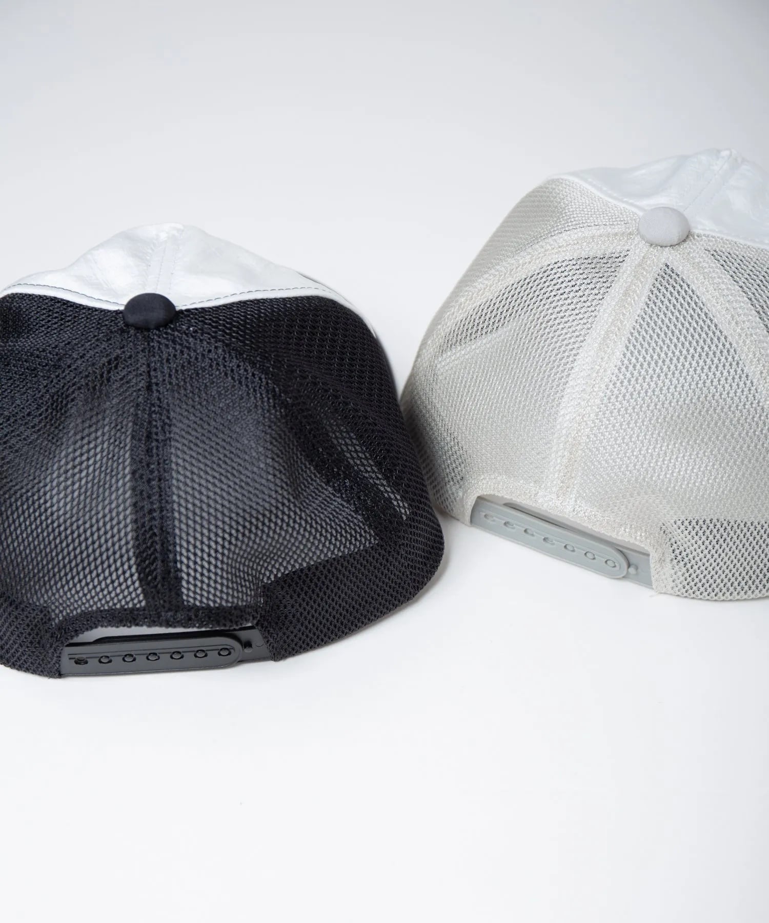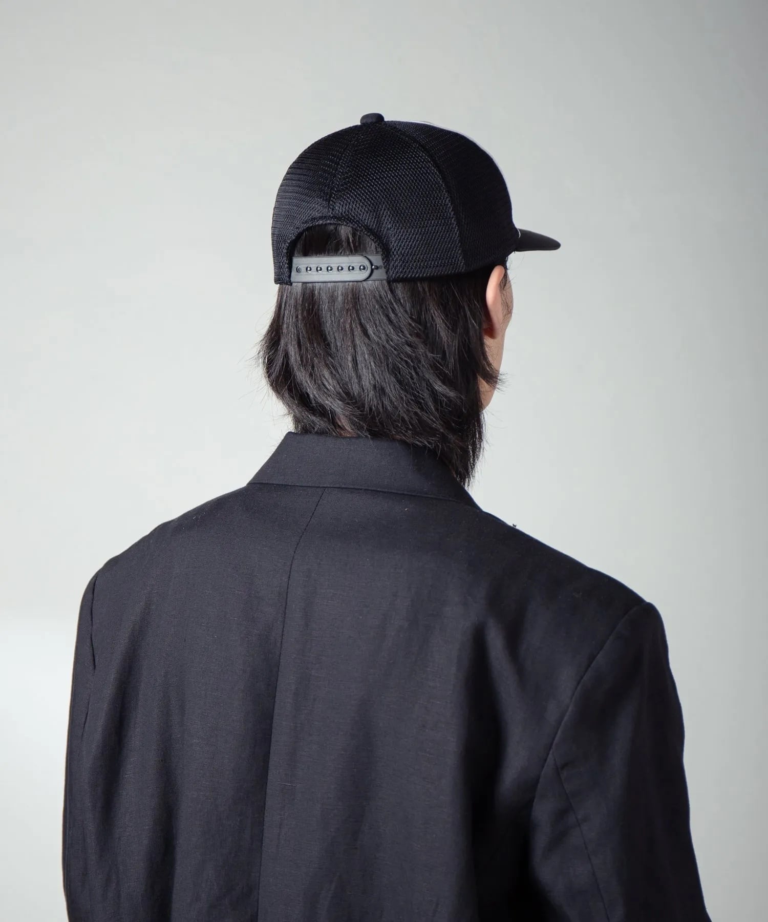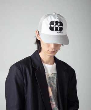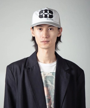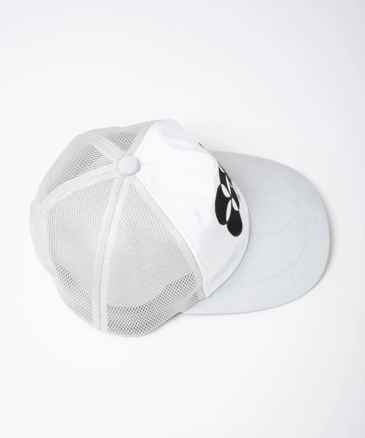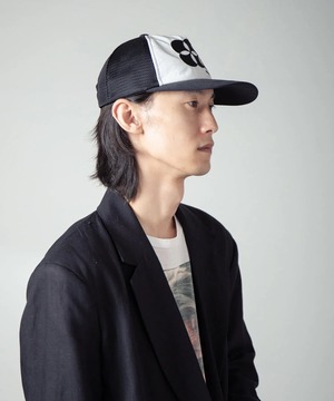表面感があるナイロン生地を使用したトラッカーキャップ。フロントには『無限』と『花』をモチーフにした刺繍を施す。ブリムはワイド型を採用しており、ブリムステッチは半円が交わる変則的なステッチが特徴的なデザインに。後方はサイズ調整可能なスナップバック仕様になっている。
