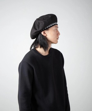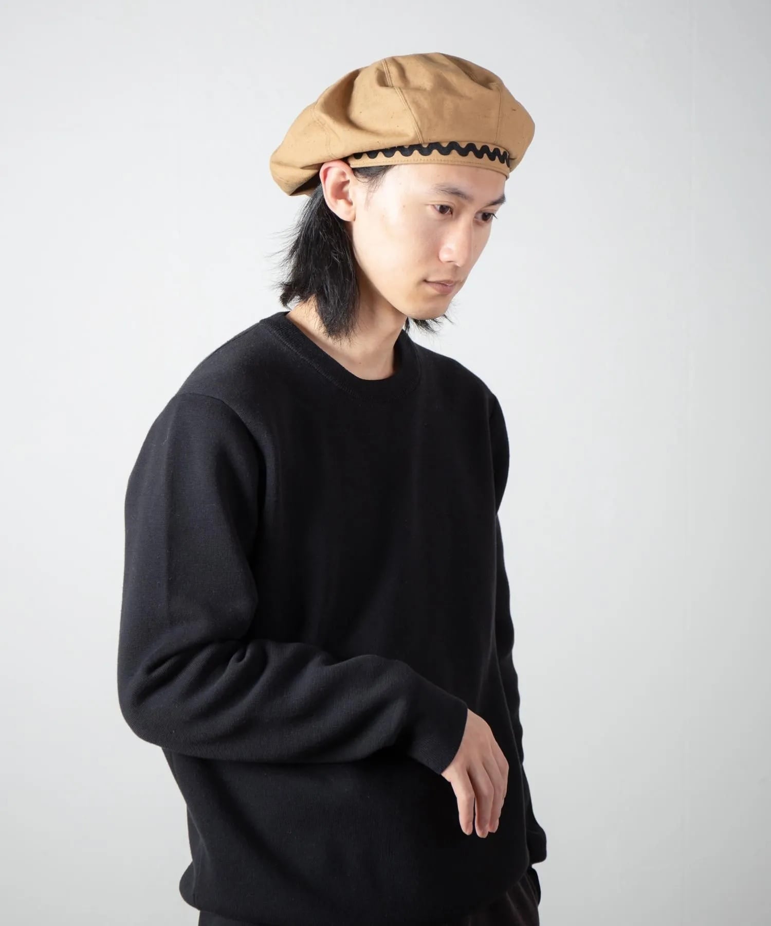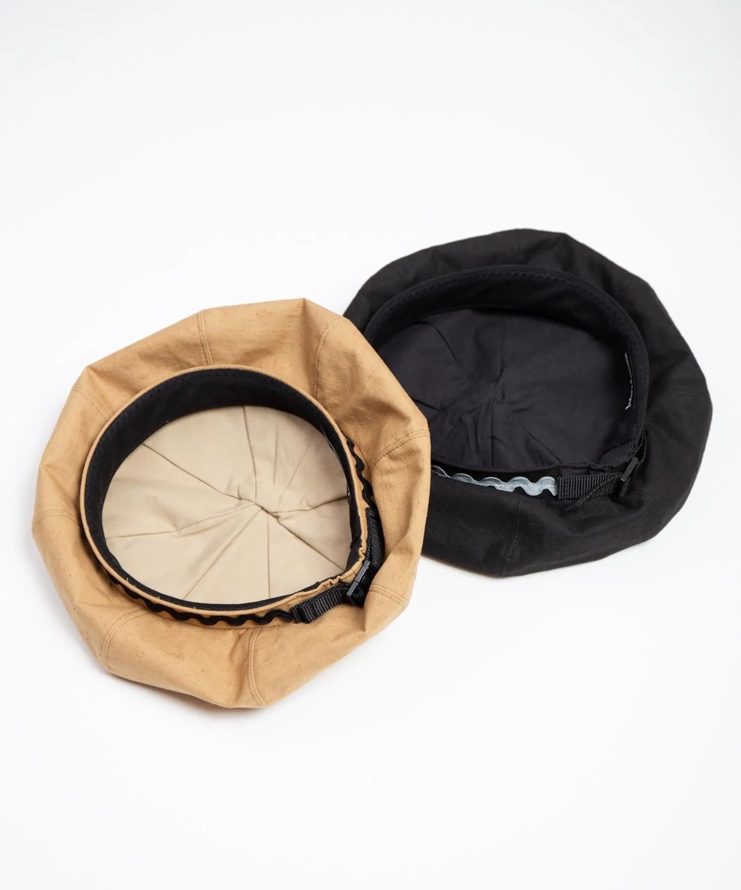 コットンネップ生地を使用した8パネルベレー。やや大判サイズのシルエットになっており、スタイルに応じてボリュームを調整してアレンジ可能。被り口には波型のテープを施したデザインになっており、程良いアクセントに。被り口後方にはサイズ調整ベルト、ゴムアジャスター仕様になっている為、フィット感の調整が可能。