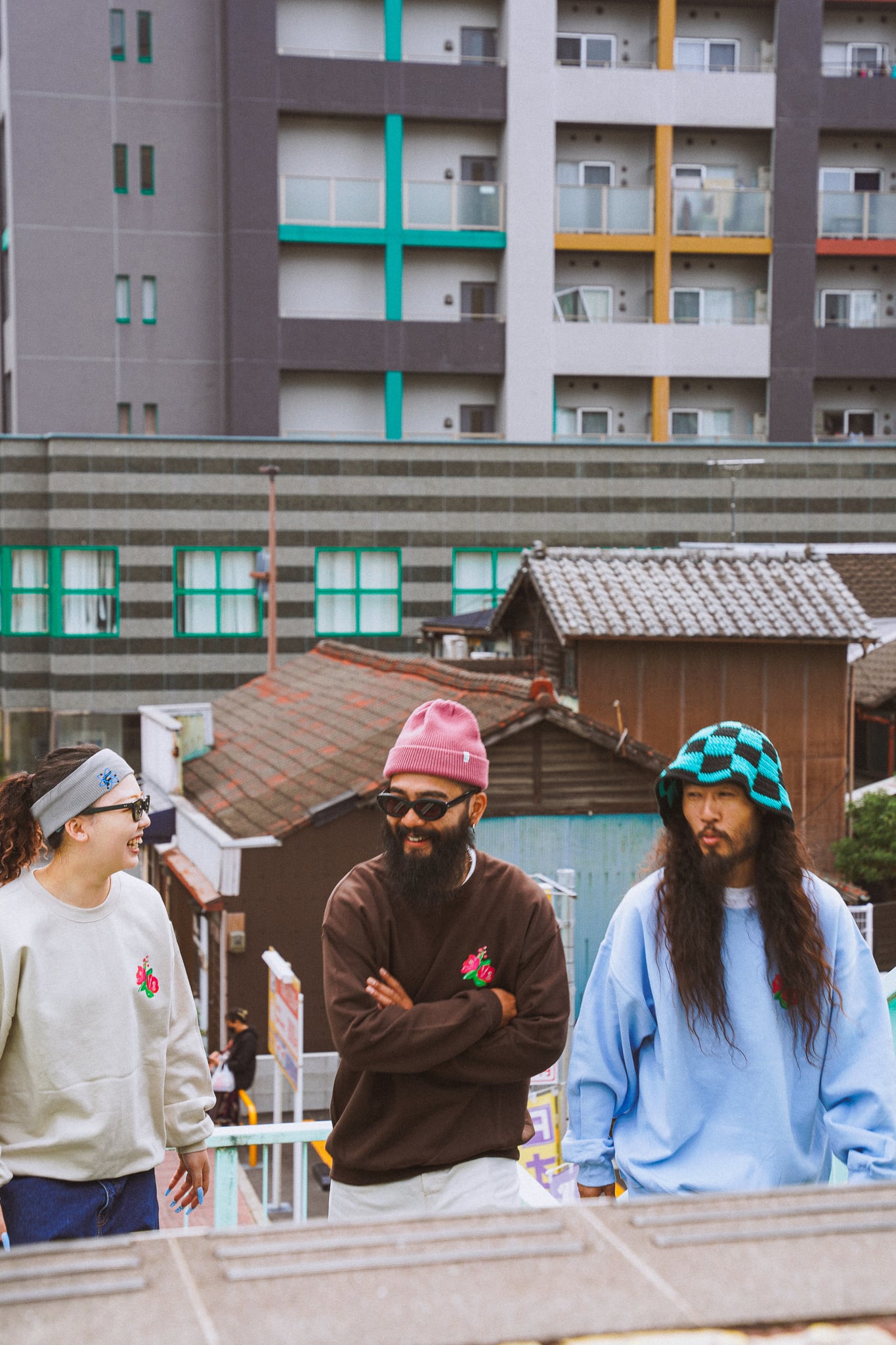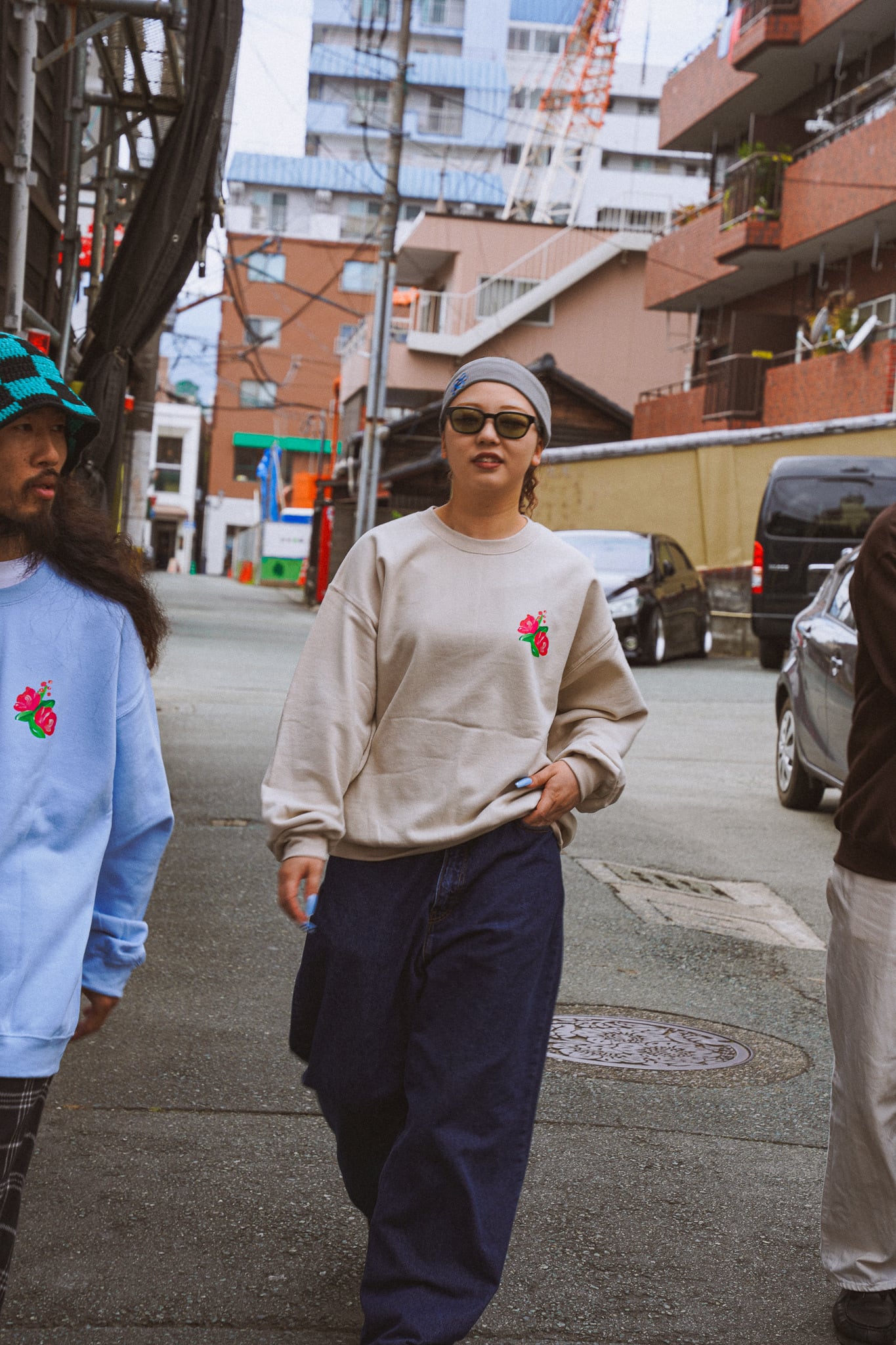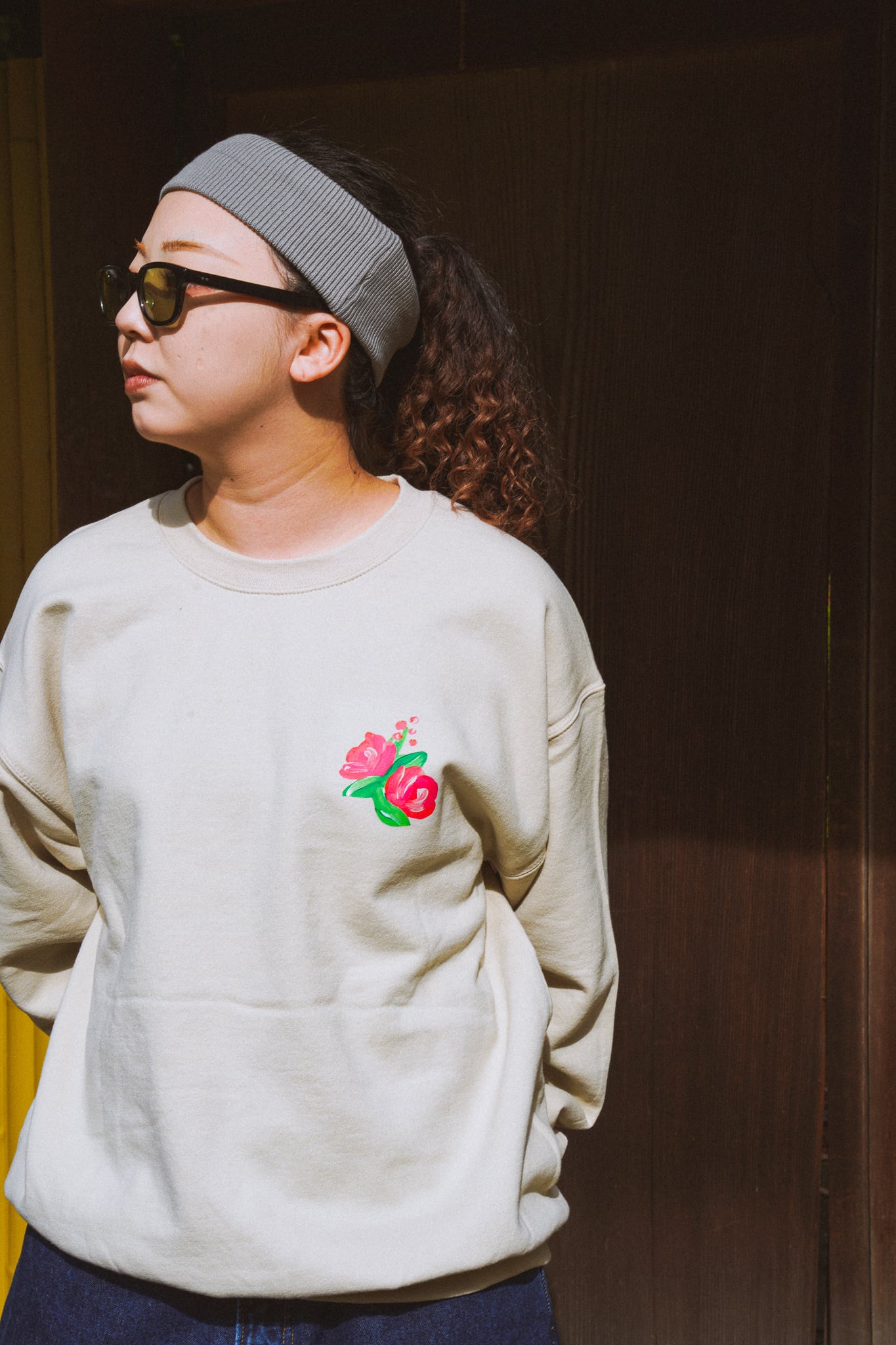 "HAPPINESS"をテーマに、witness氏に描き下ろしてもらったデザインをフロントワンポイントと大きくバックプリントしたスウェット。