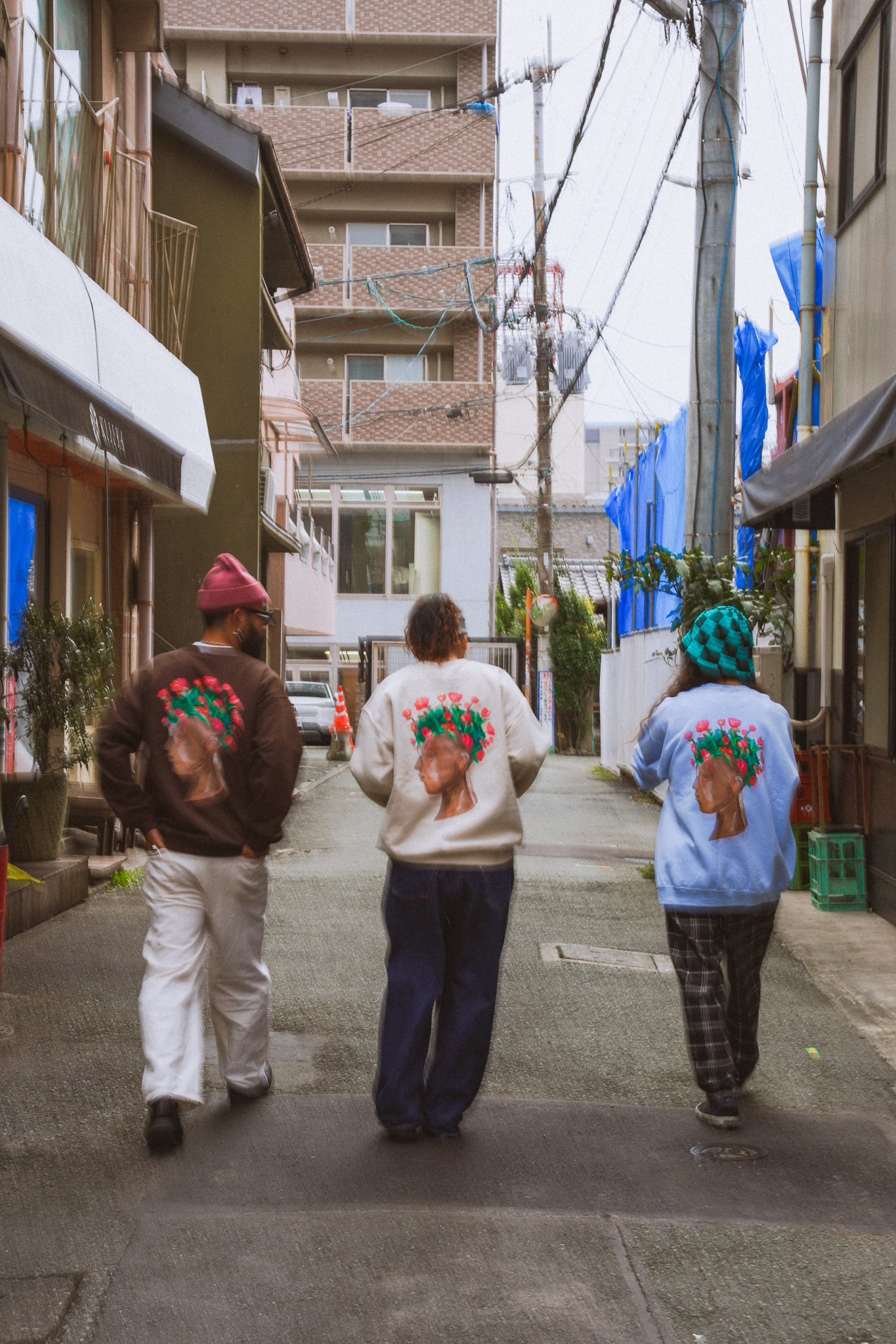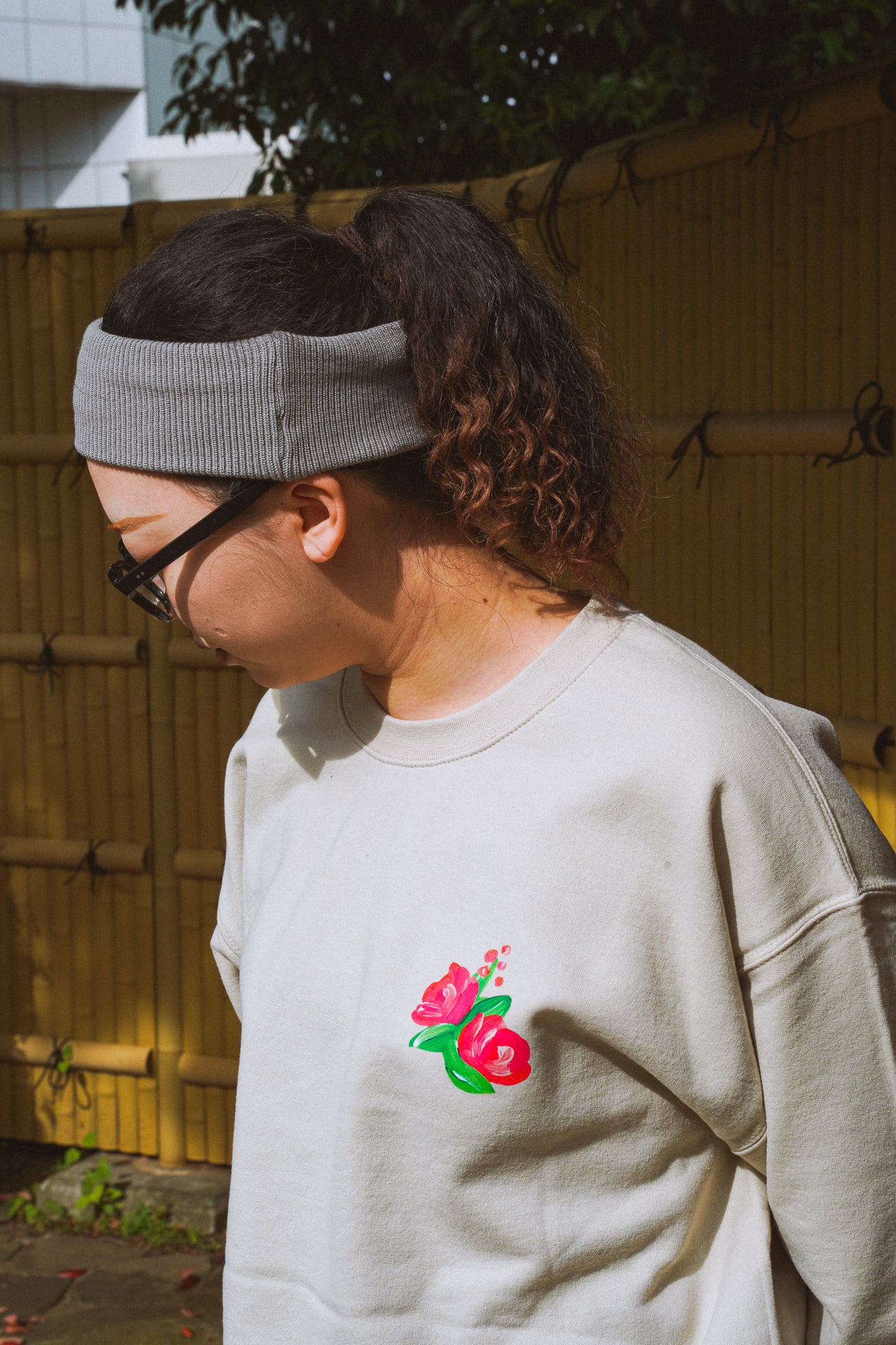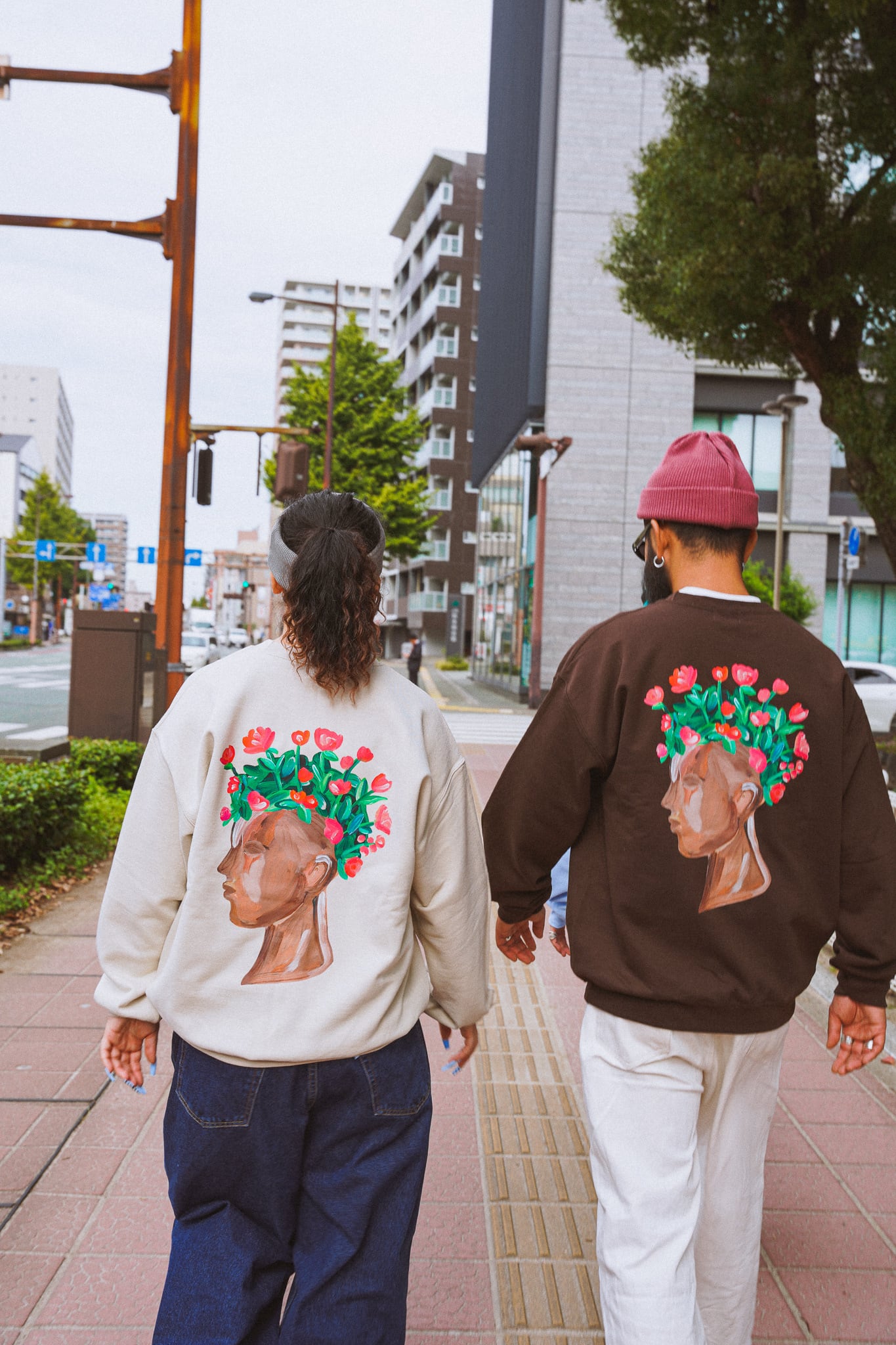 "HAPPINESS"をテーマに、witness氏に描き下ろしてもらったデザインをフロントワンポイントと大きくバックプリントしたスウェット。