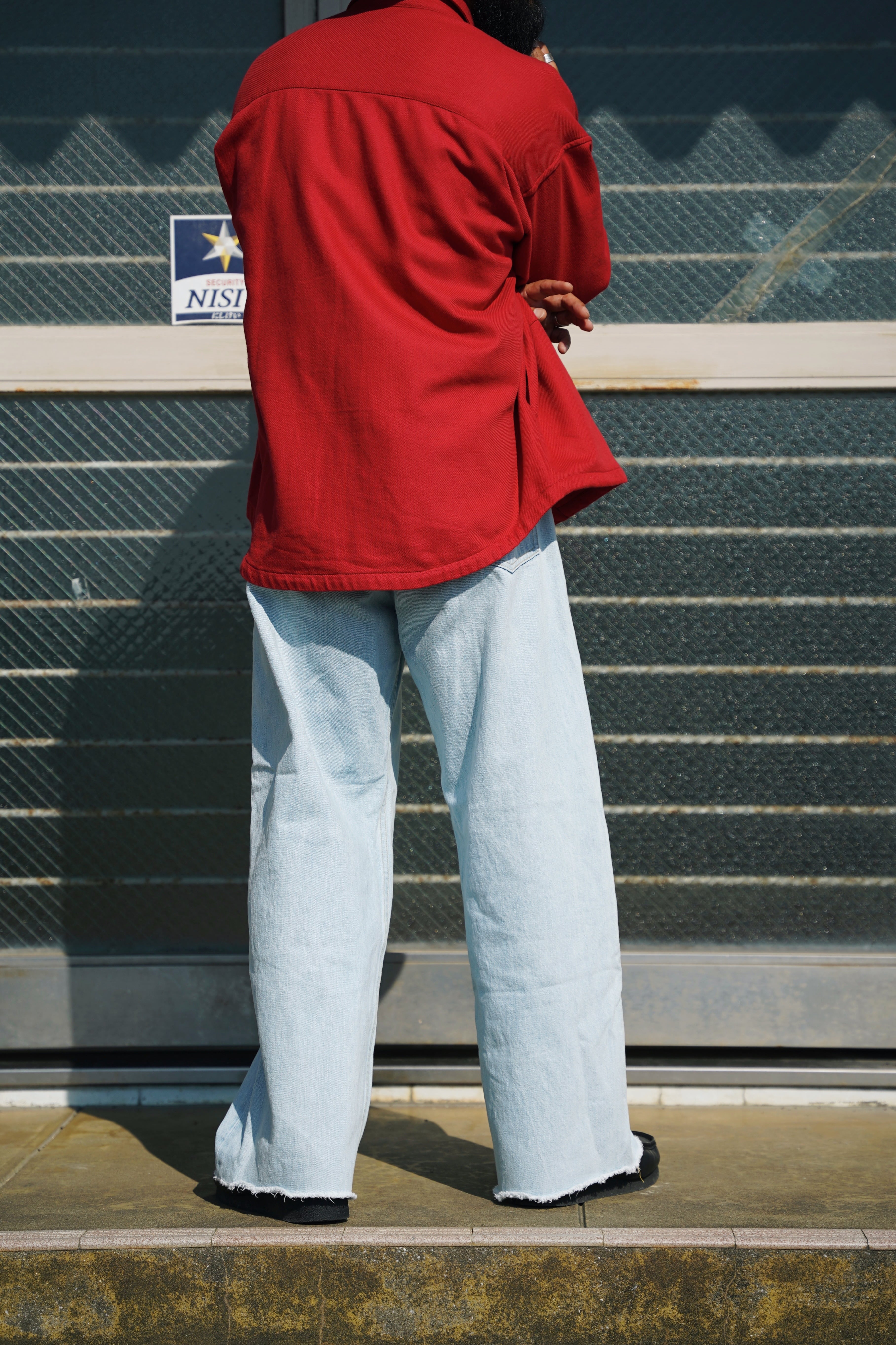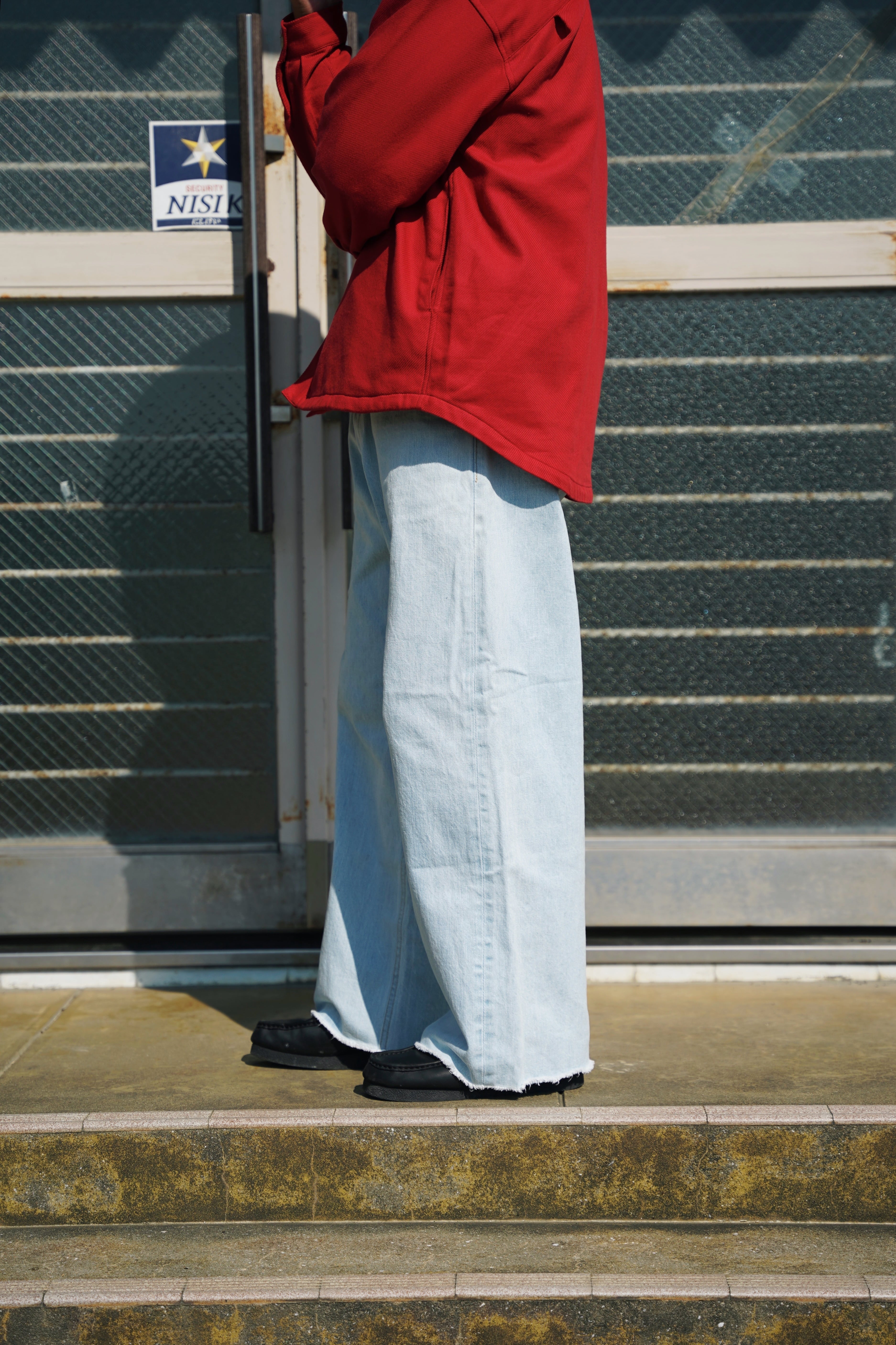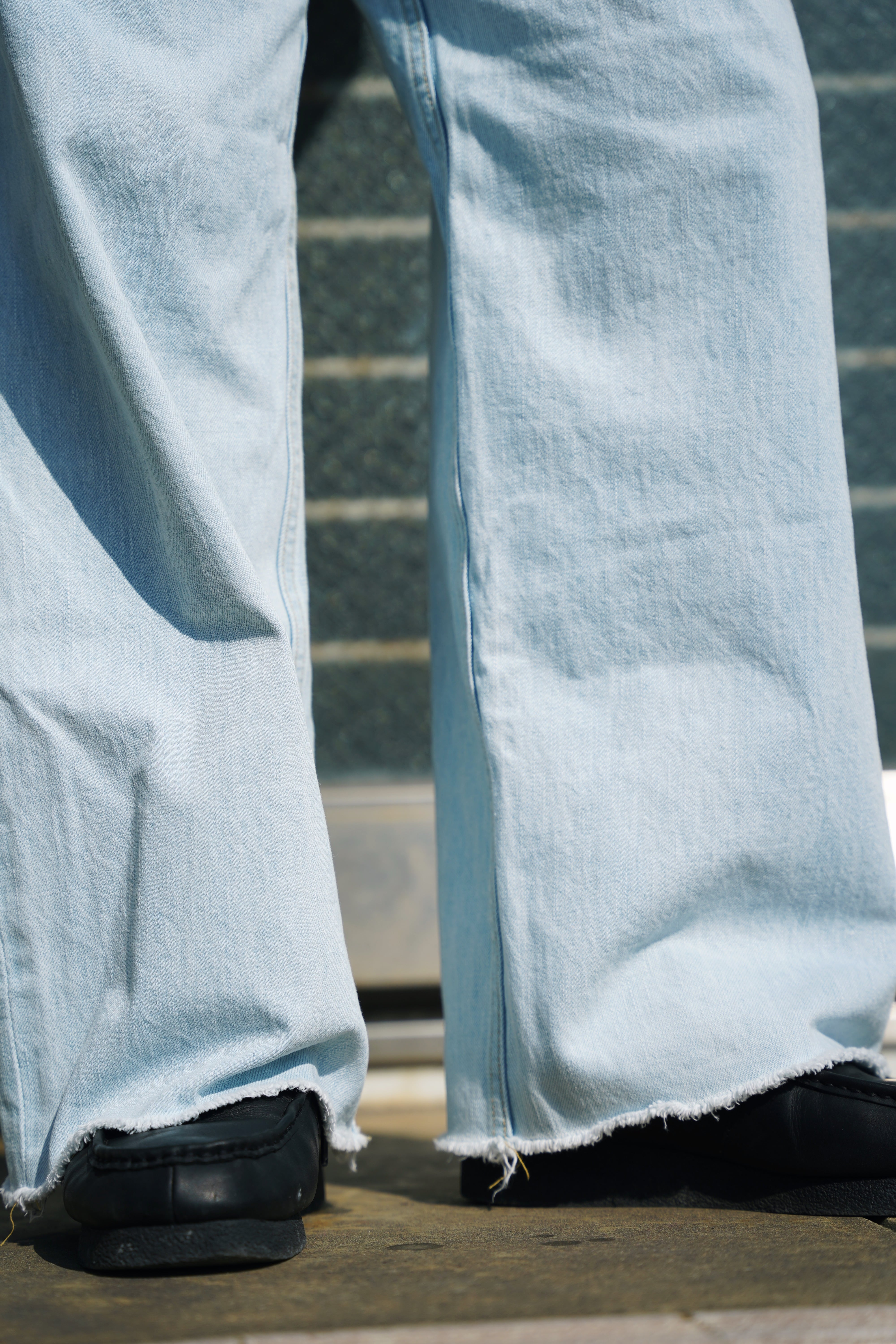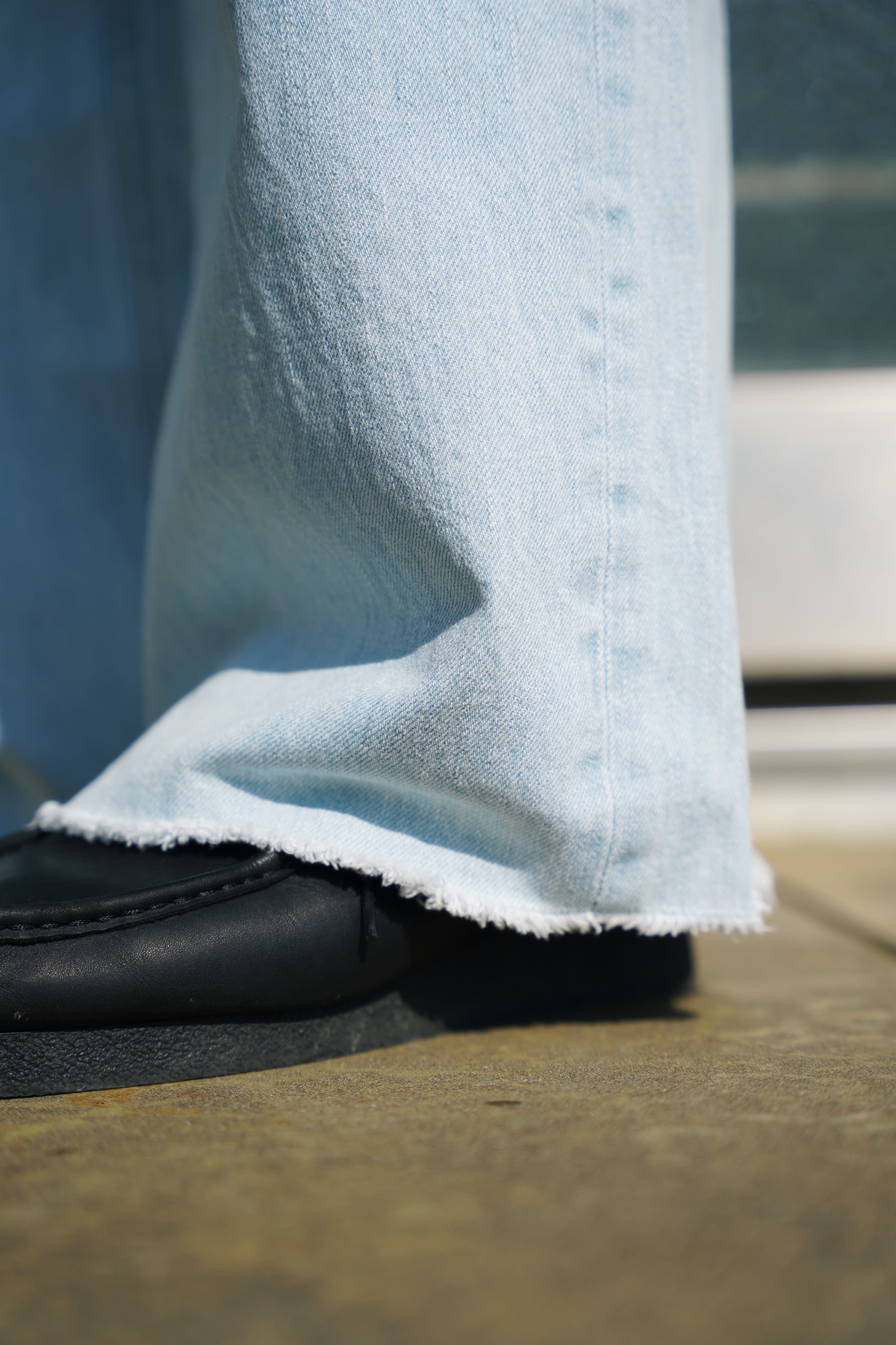 セルヴィッチのデッドストック生地を使用し、裾にカットオフディティールに施したハードウォッシュデニム。