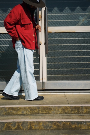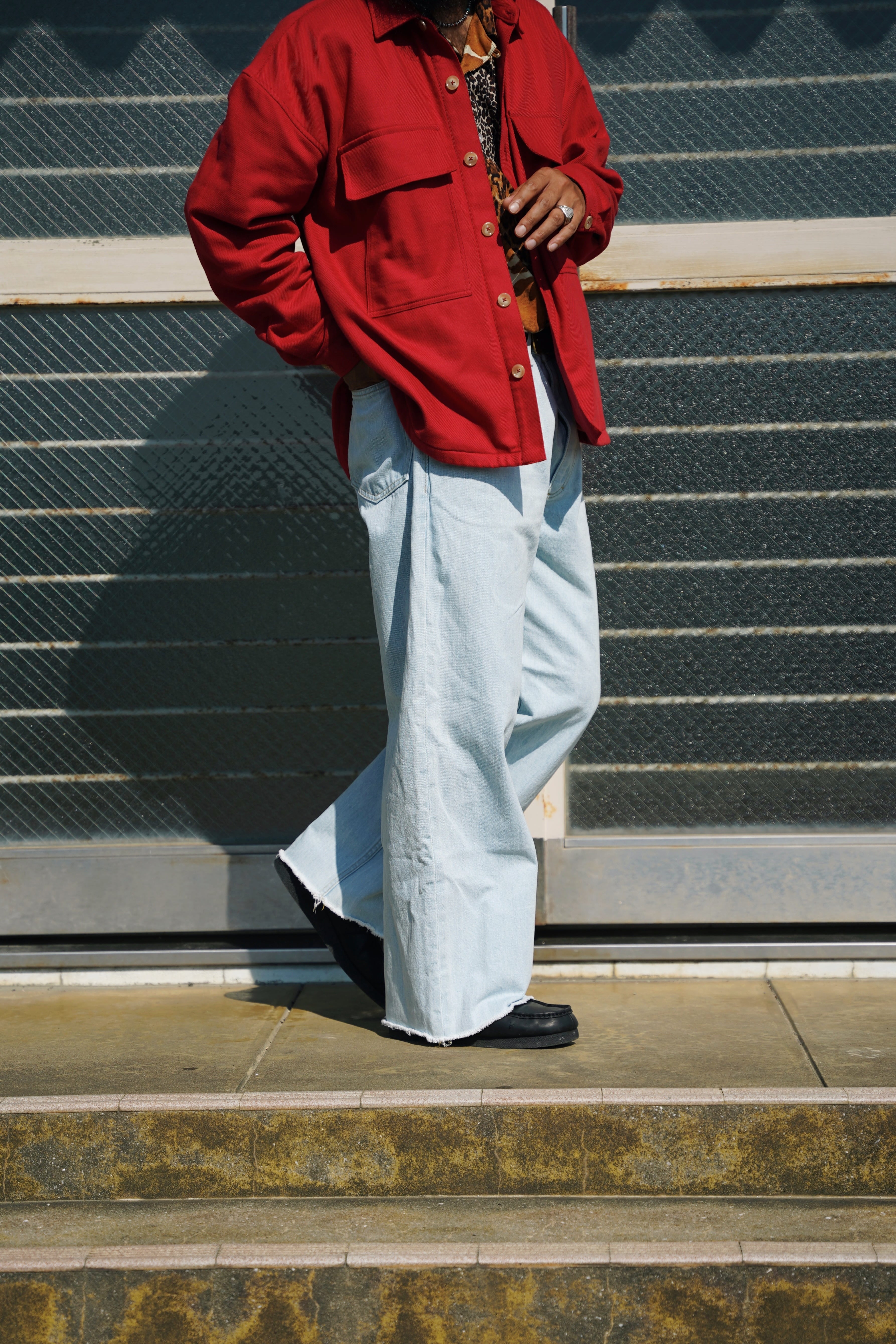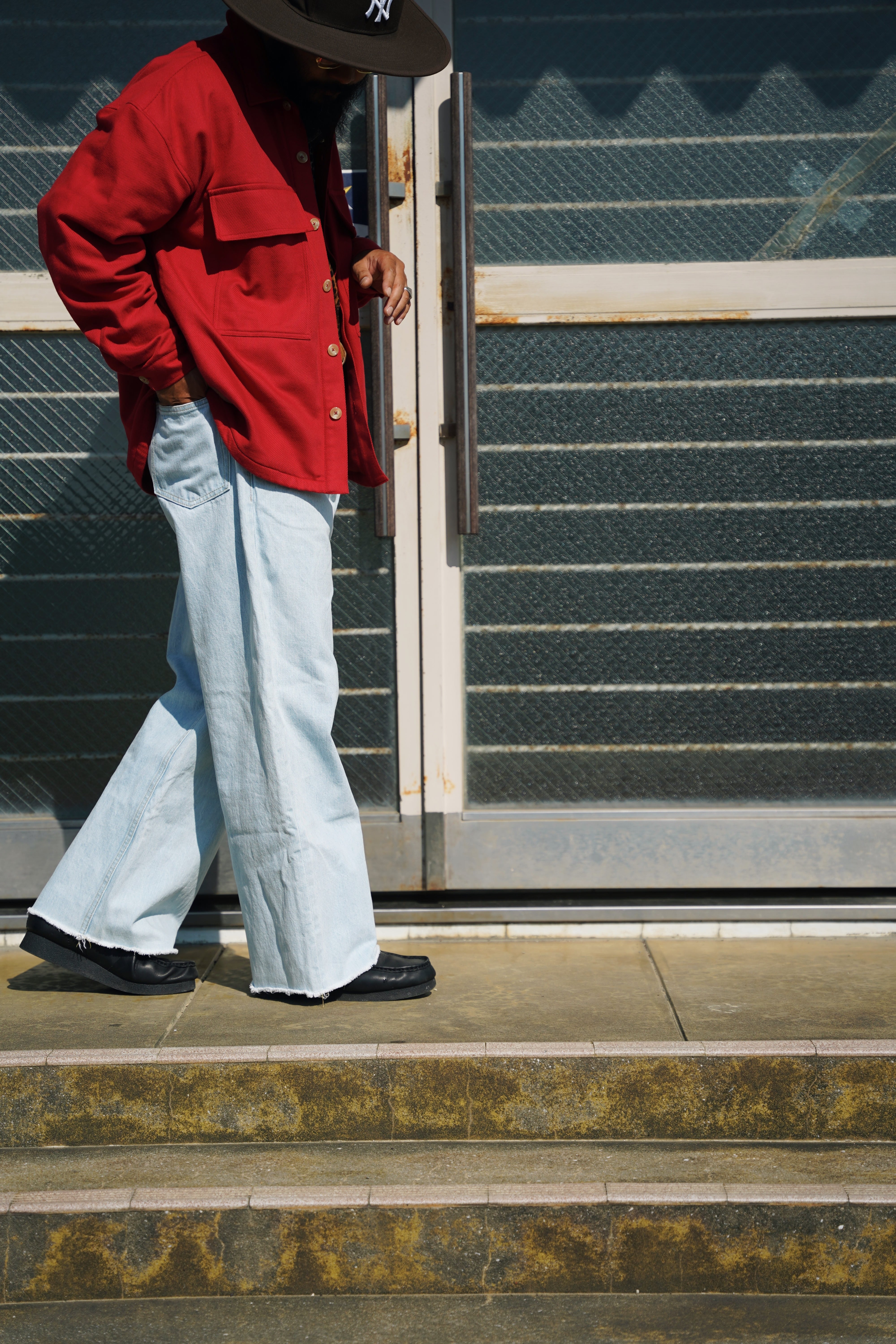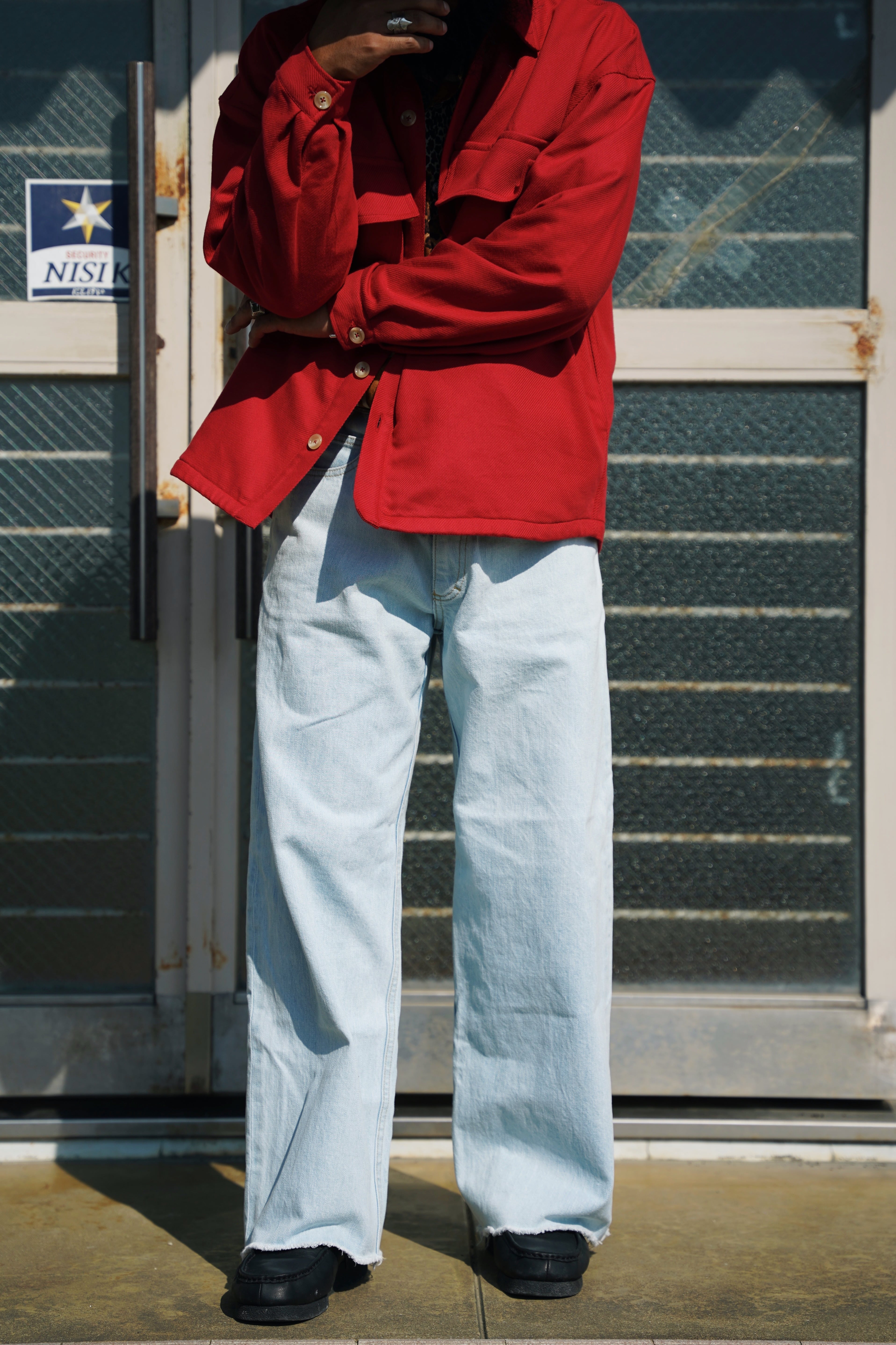 セルヴィッチのデッドストック生地を使用し、裾にカットオフディティールに施したハードウォッシュデニム。