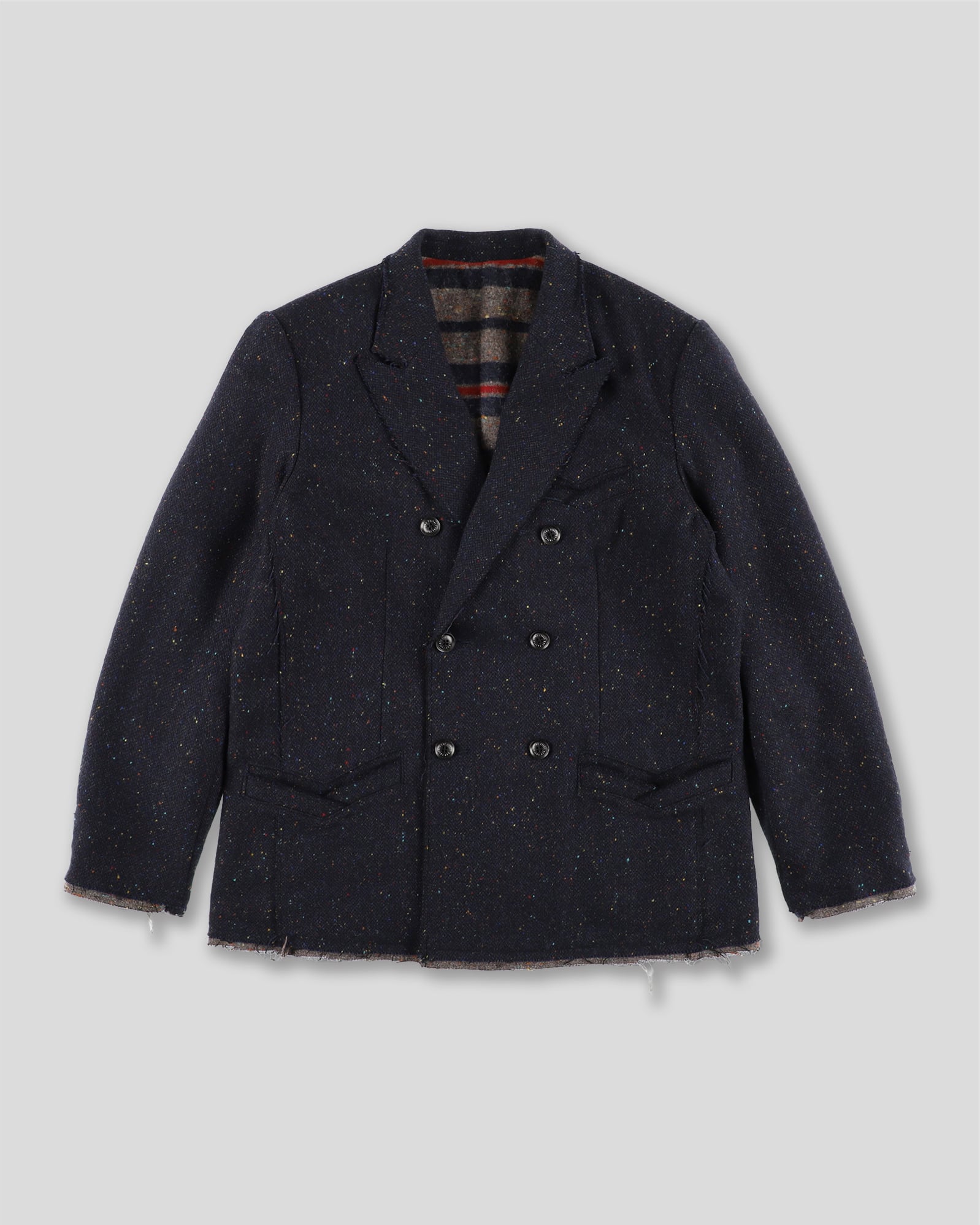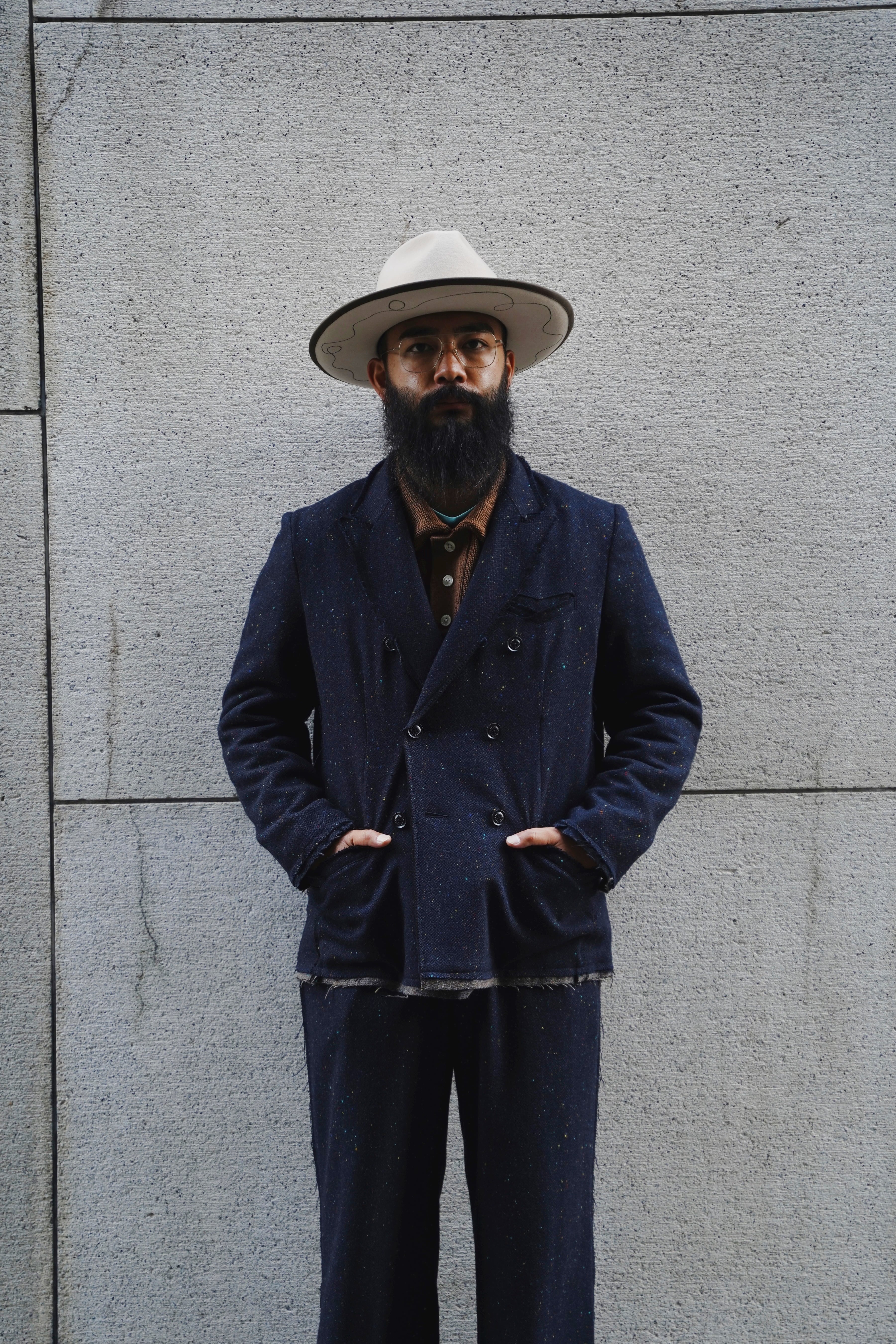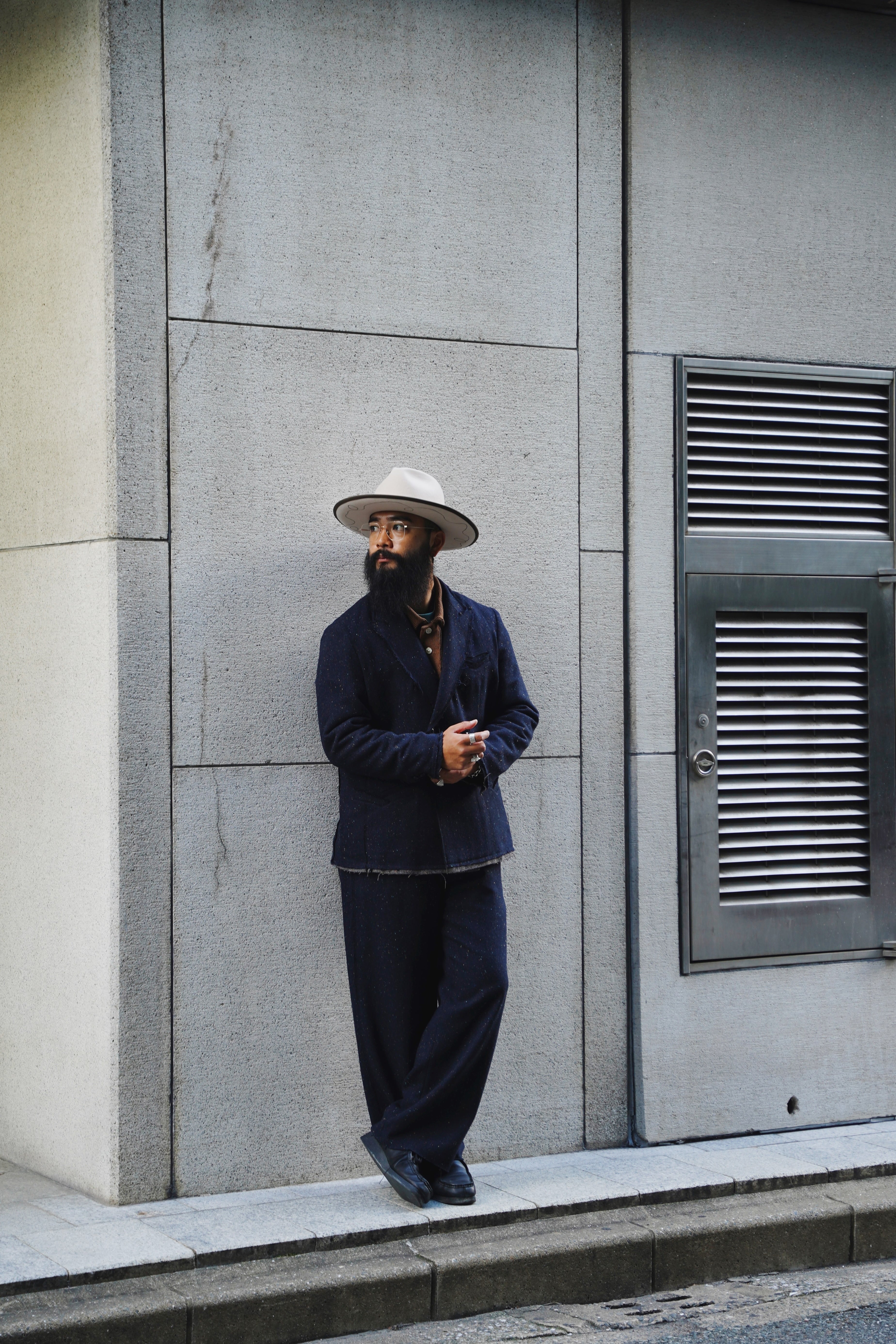 ピークドラペル、肩パッドで形成されたショルダーライン、ダブル仕様などフォーマルなディティールながら随所を断ち切りで仕上げることでフォーマルからカジュアルスタイルまで活躍する1着。