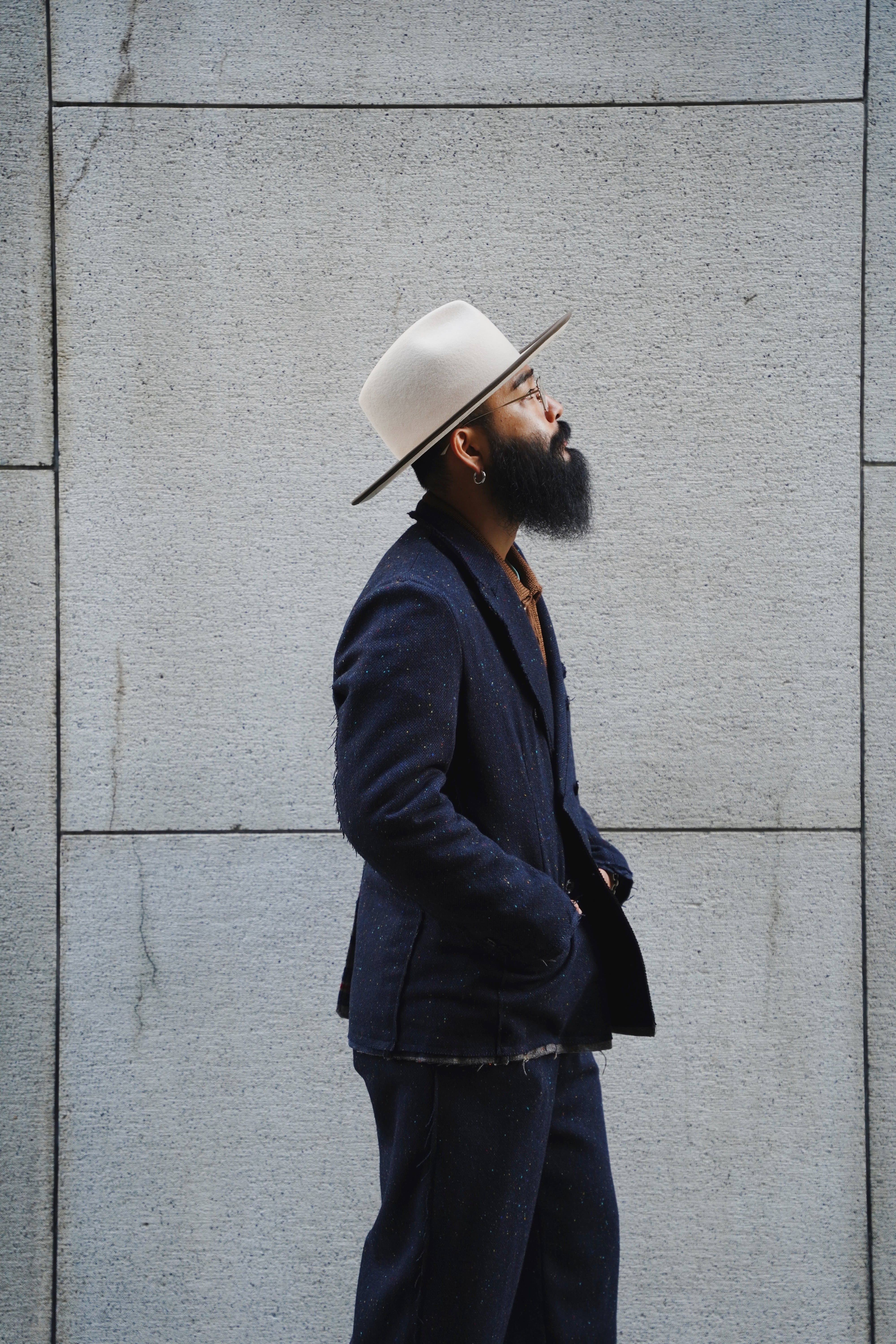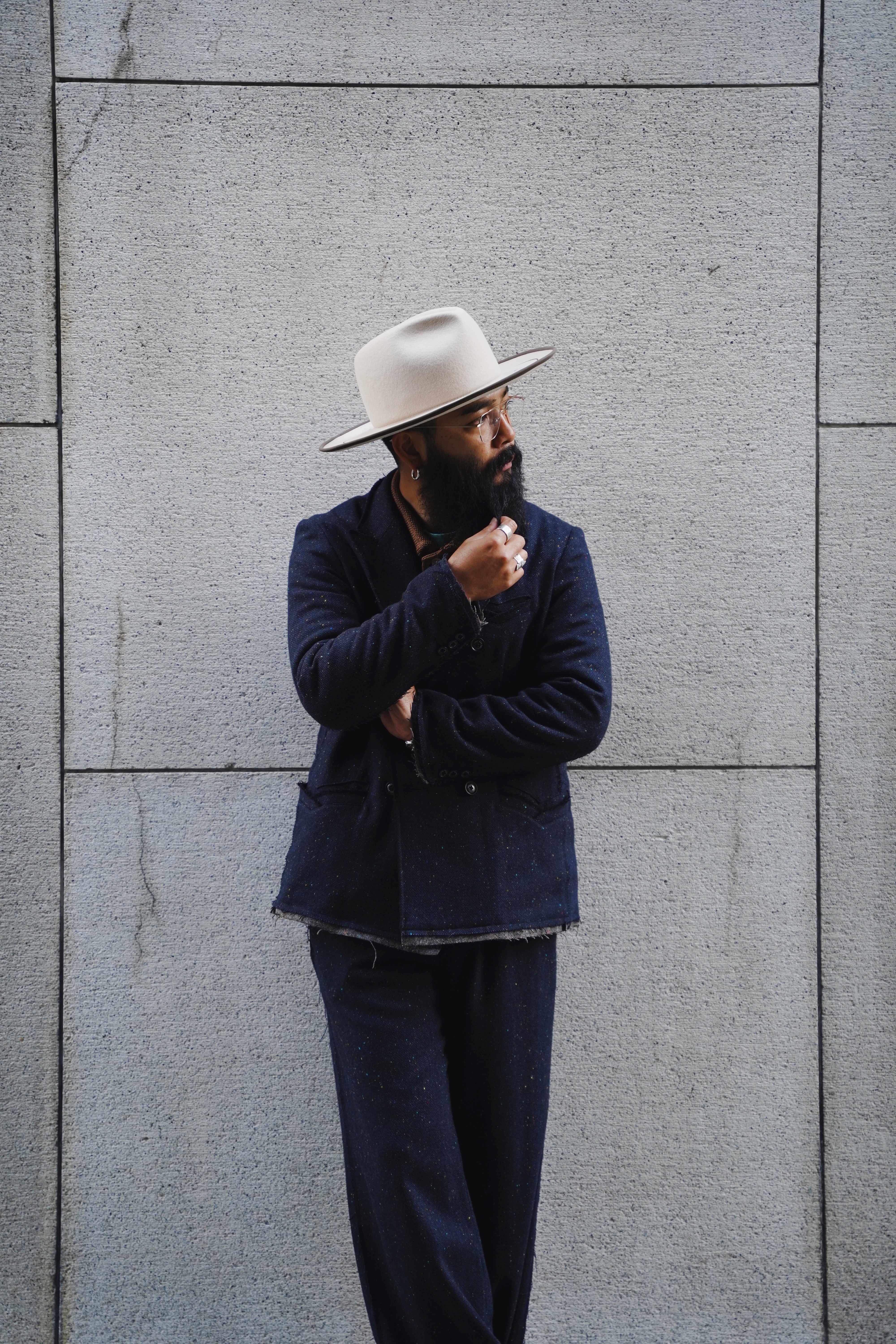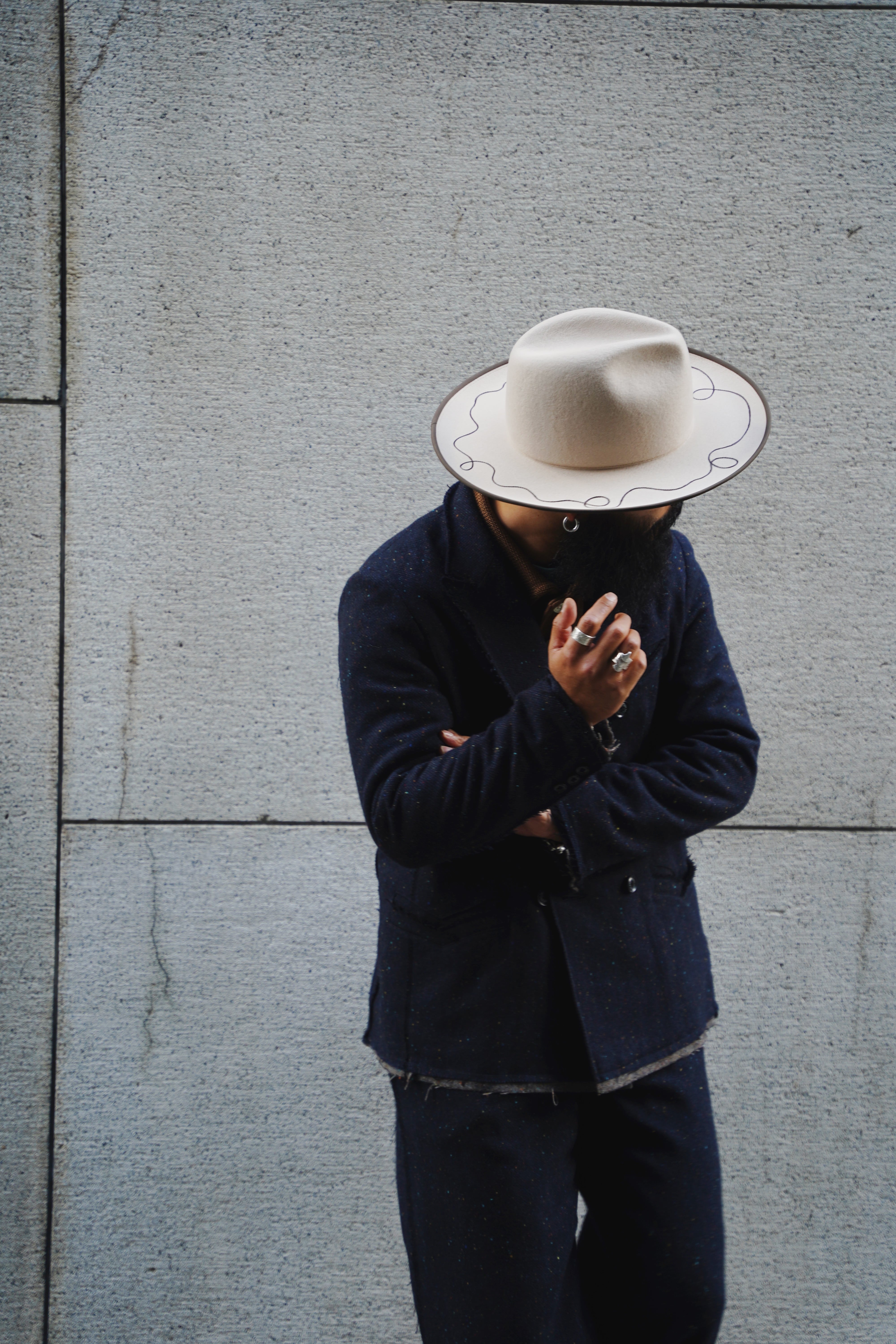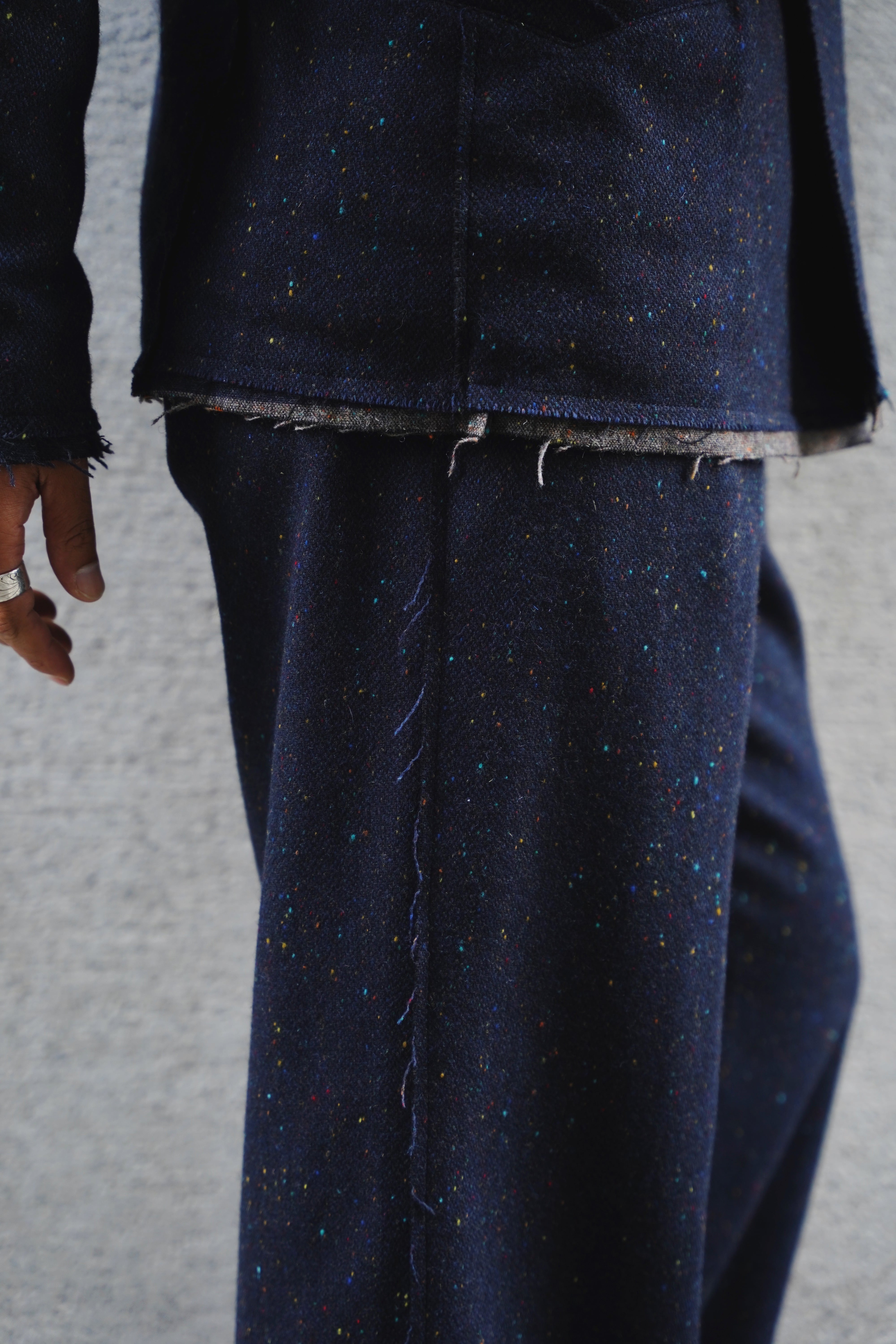 ピークドラペル、肩パッドで形成されたショルダーライン、ダブル仕様などフォーマルなディティールながら随所を断ち切りで仕上げることでフォーマルからカジュアルスタイルまで活躍する1着。