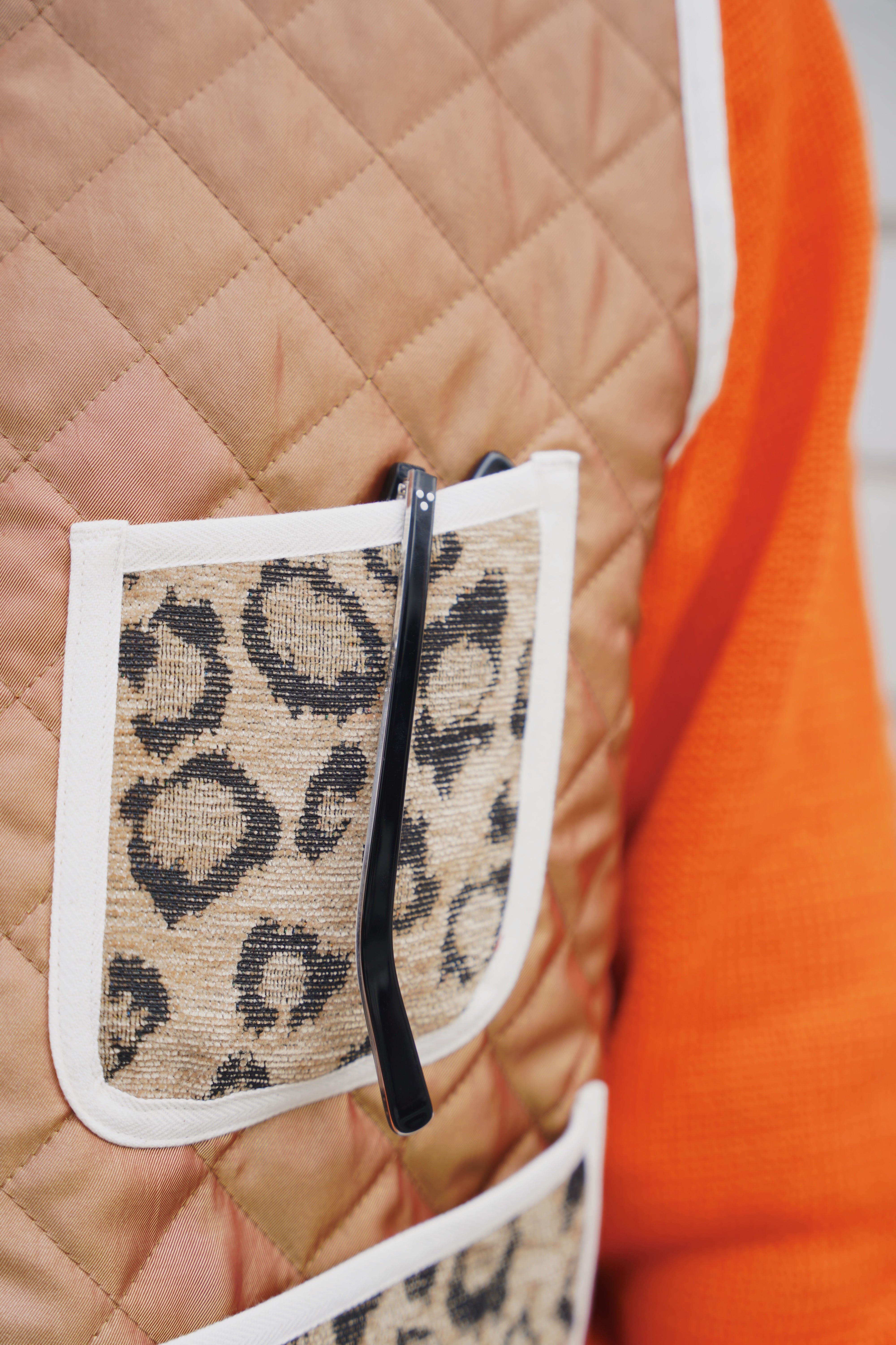 特徴的なパッチポケットは多色で織られたゴブラン織りのレオパード生地で切り替えており、ライナーには軽量で保温性に優れたボアを採用することで実用性MAX。
