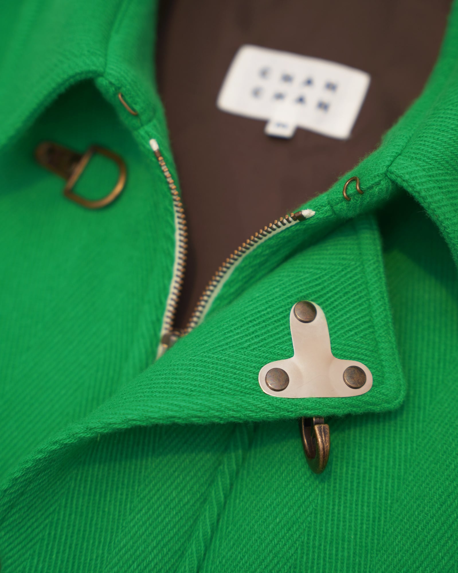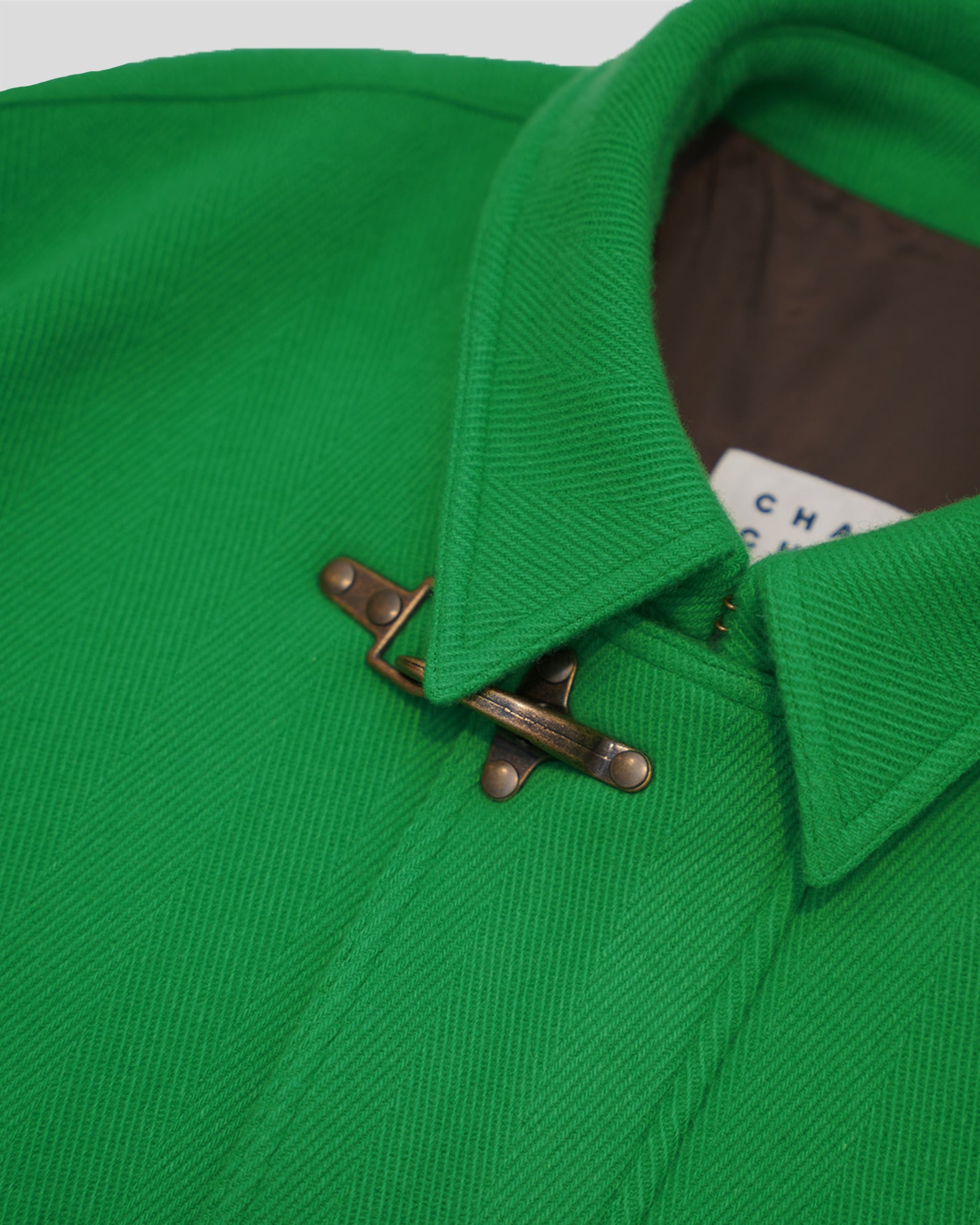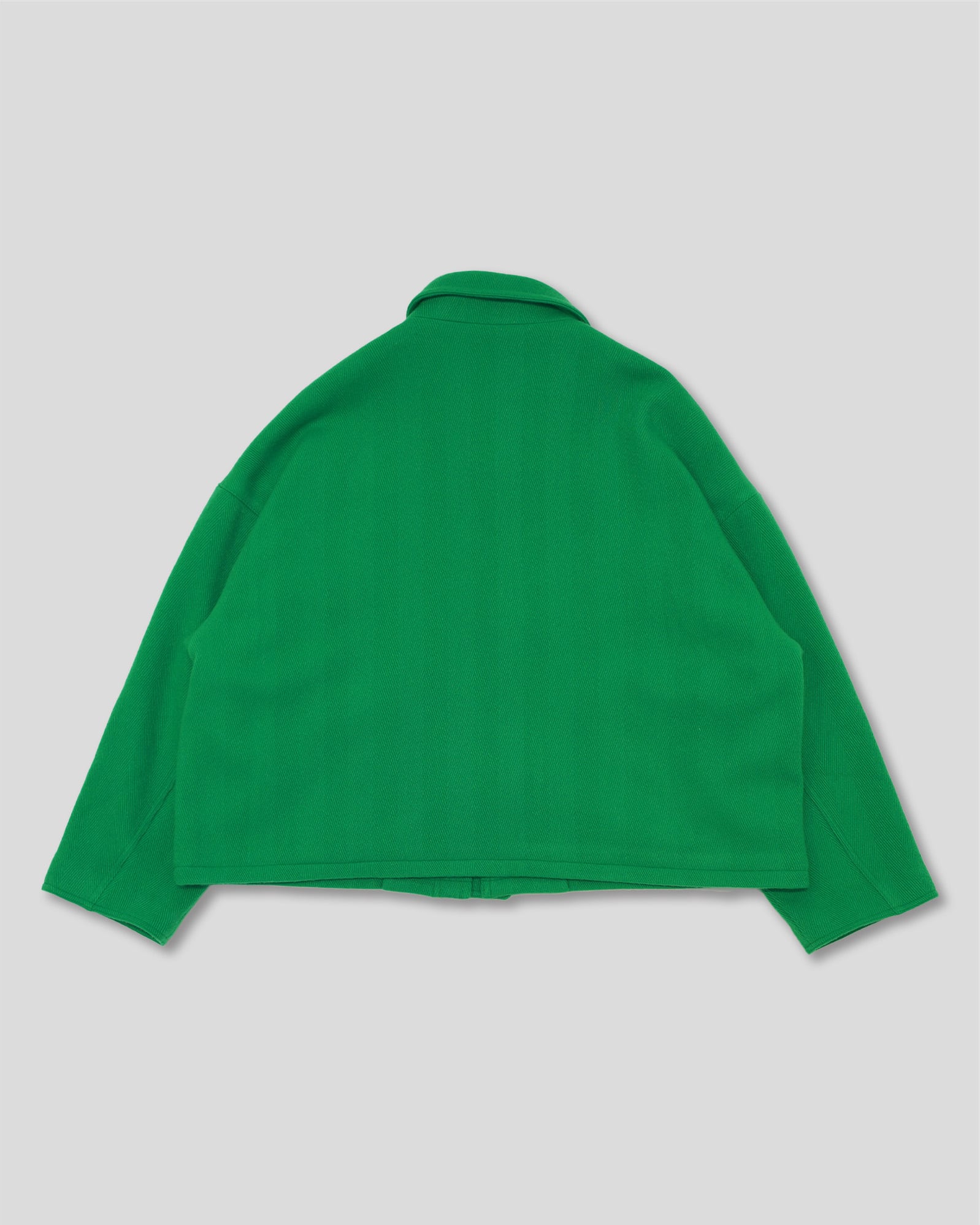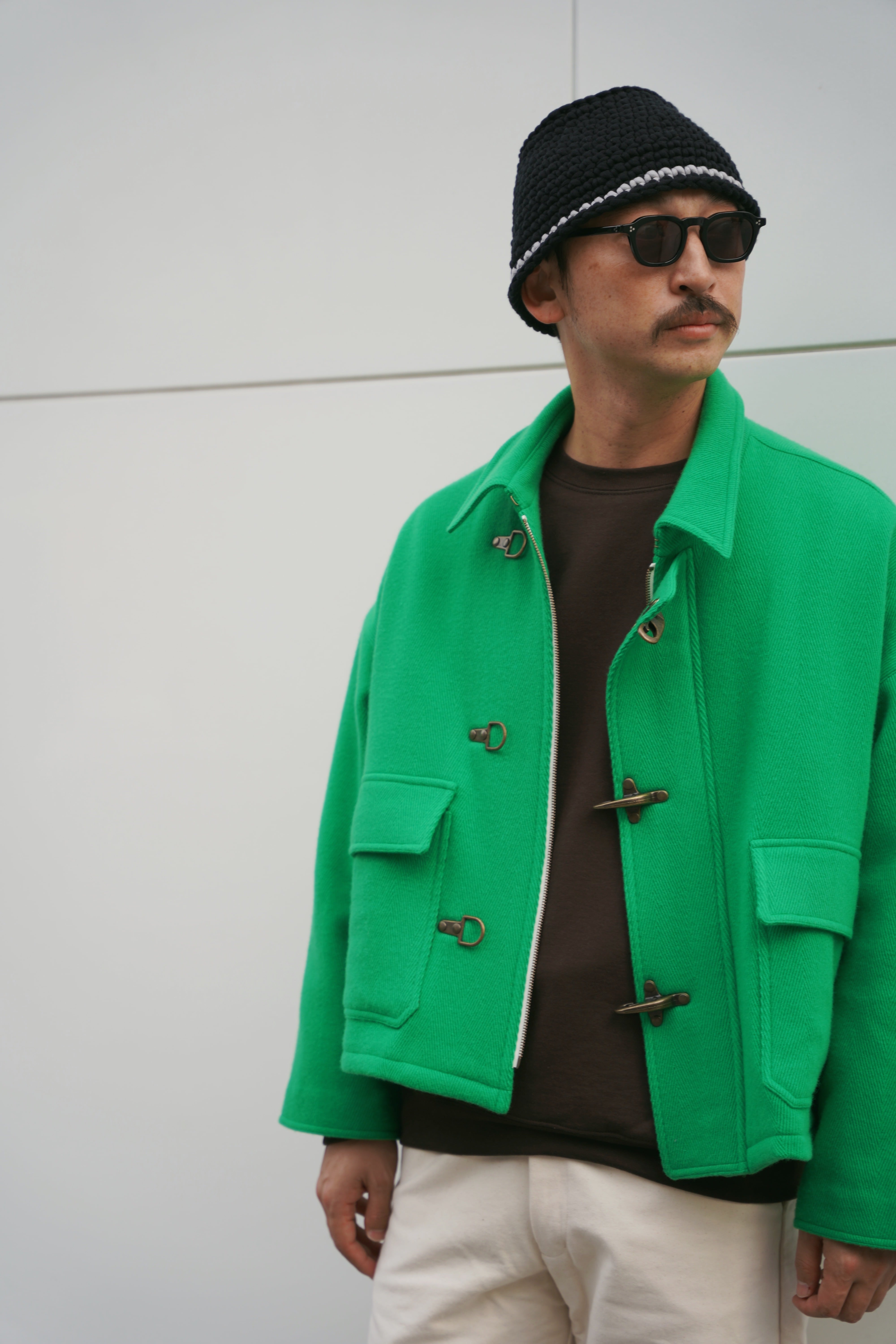 ファイアーマンコートをショートレングスに落とし込みオリジナルカラーにて染色を施したウールナイロンファブリックを使用したショートレングスのファイアーマンジャケット。