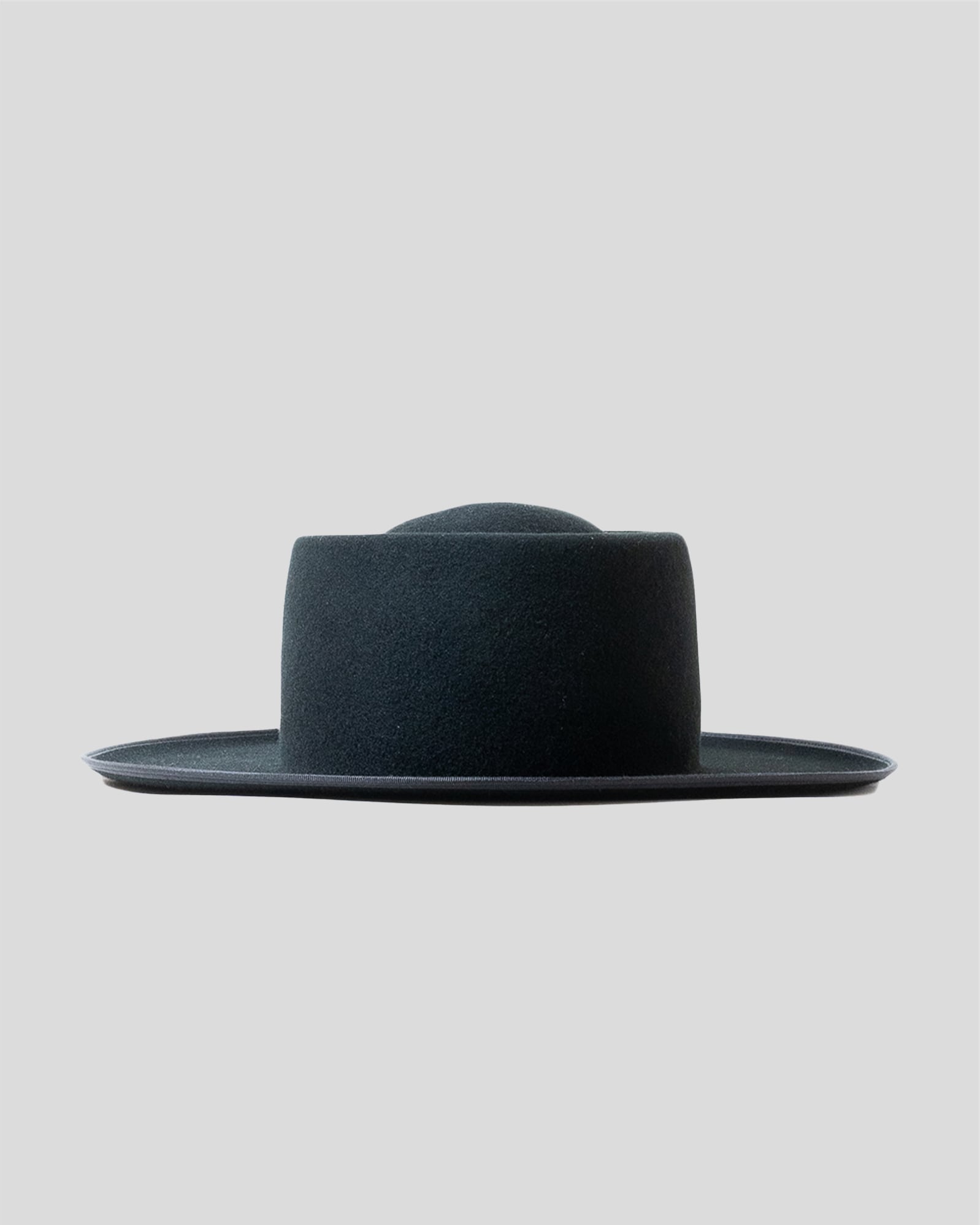 ウール(羊)素材はラビット(兎)素材と見た目はほとんど変わらず、比較するとザラっとした素材感が特徴。丁寧にケアして扱えば長い年月をかけて愛用可能。クラウンは10cmと高過ぎず低過ぎず。ブリム周りは12mmのパイピングで装飾・補強を施しており、ハット内側は伸縮性のあるゴム紐を内蔵することでサイズ調節が可能となっている。またバンダナやスカーフなどをカスタムできるようにゴム製のフープを配置。