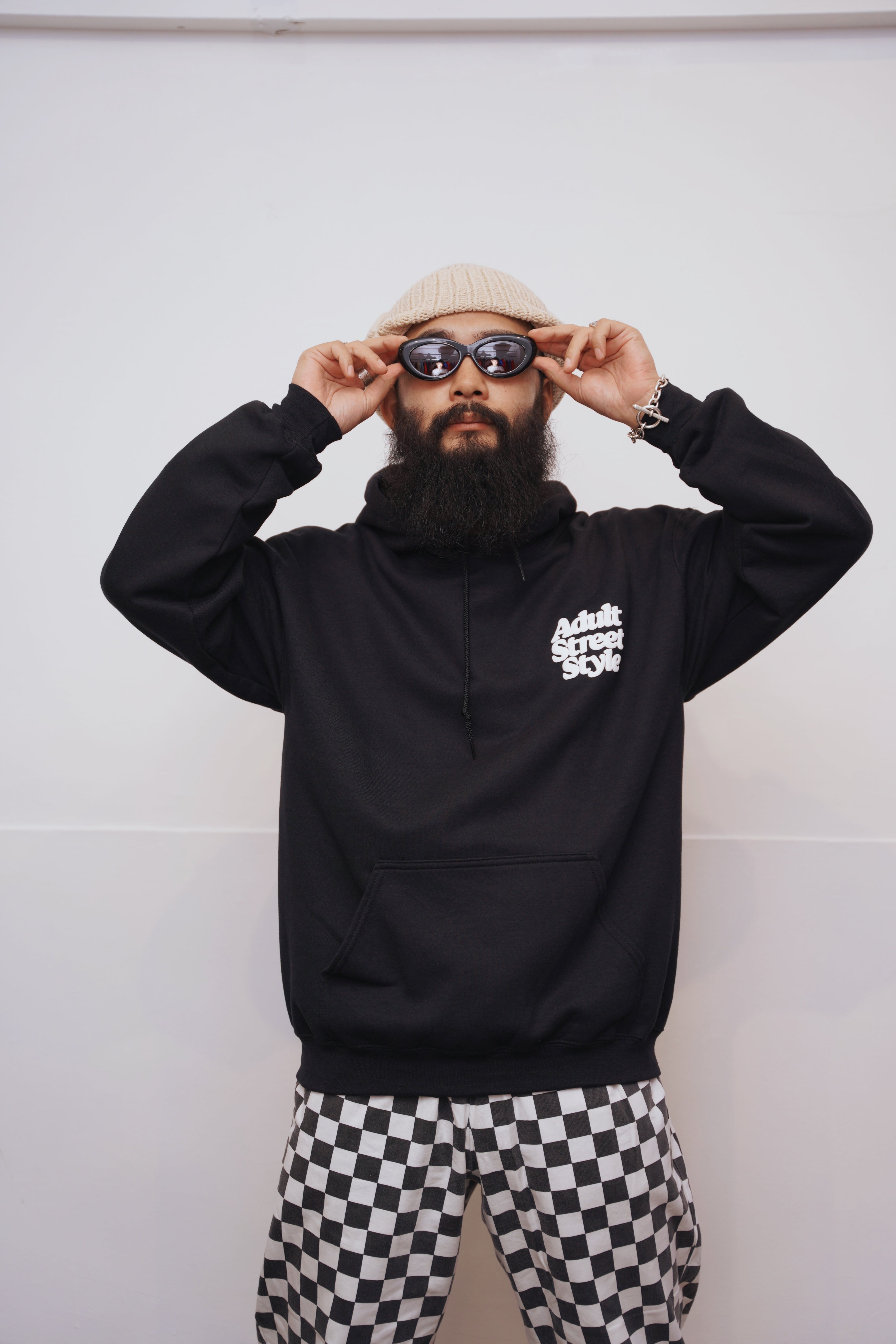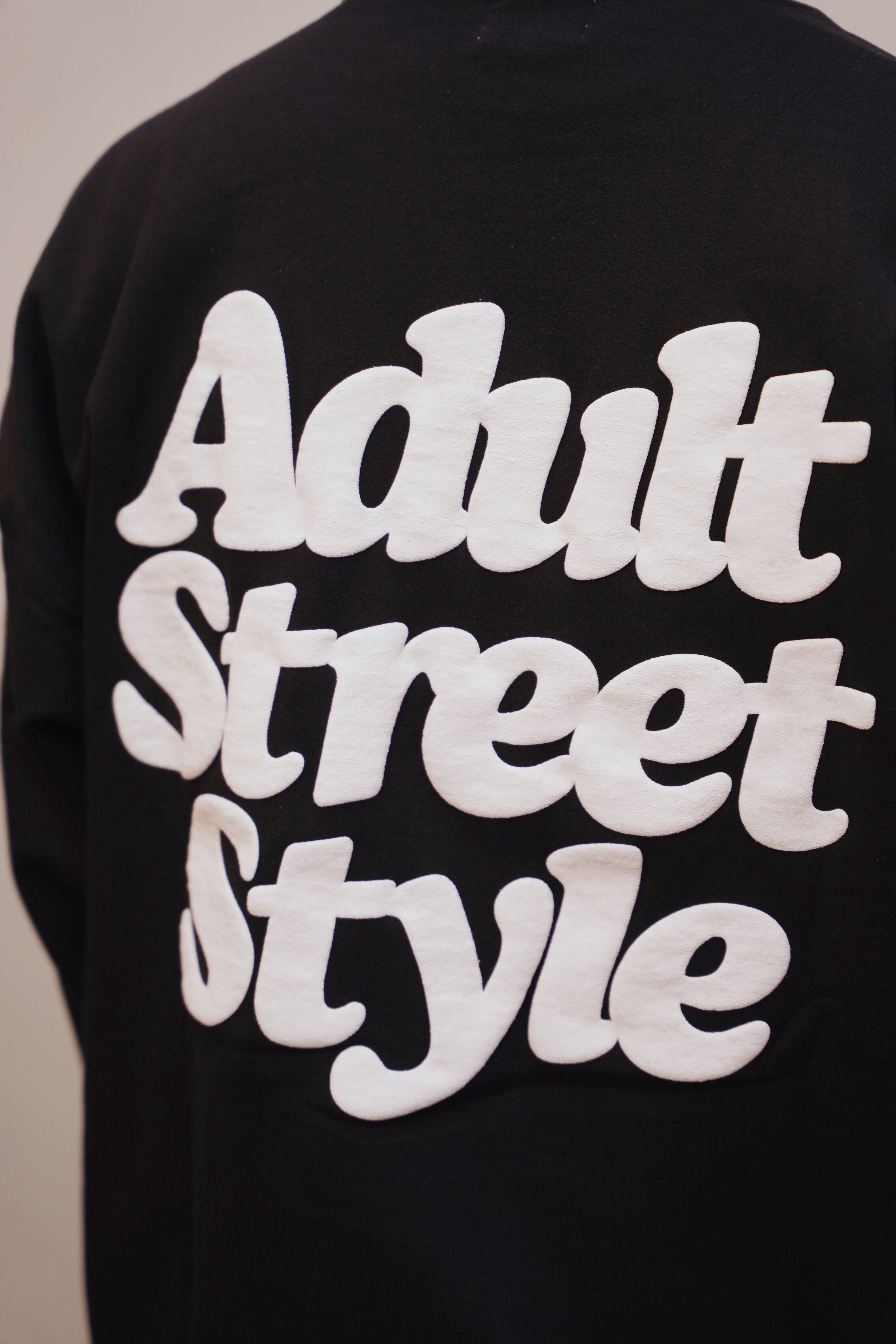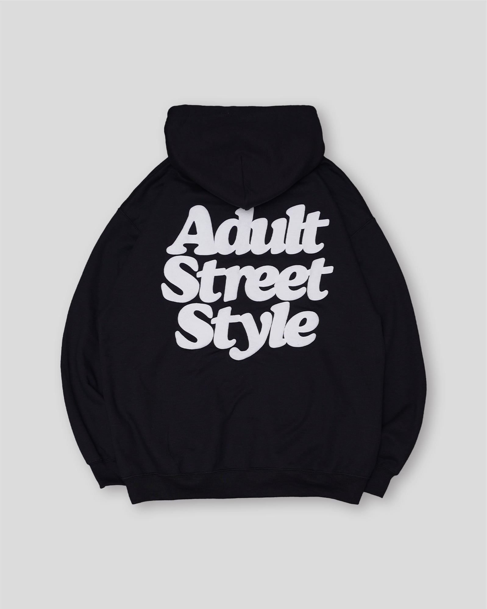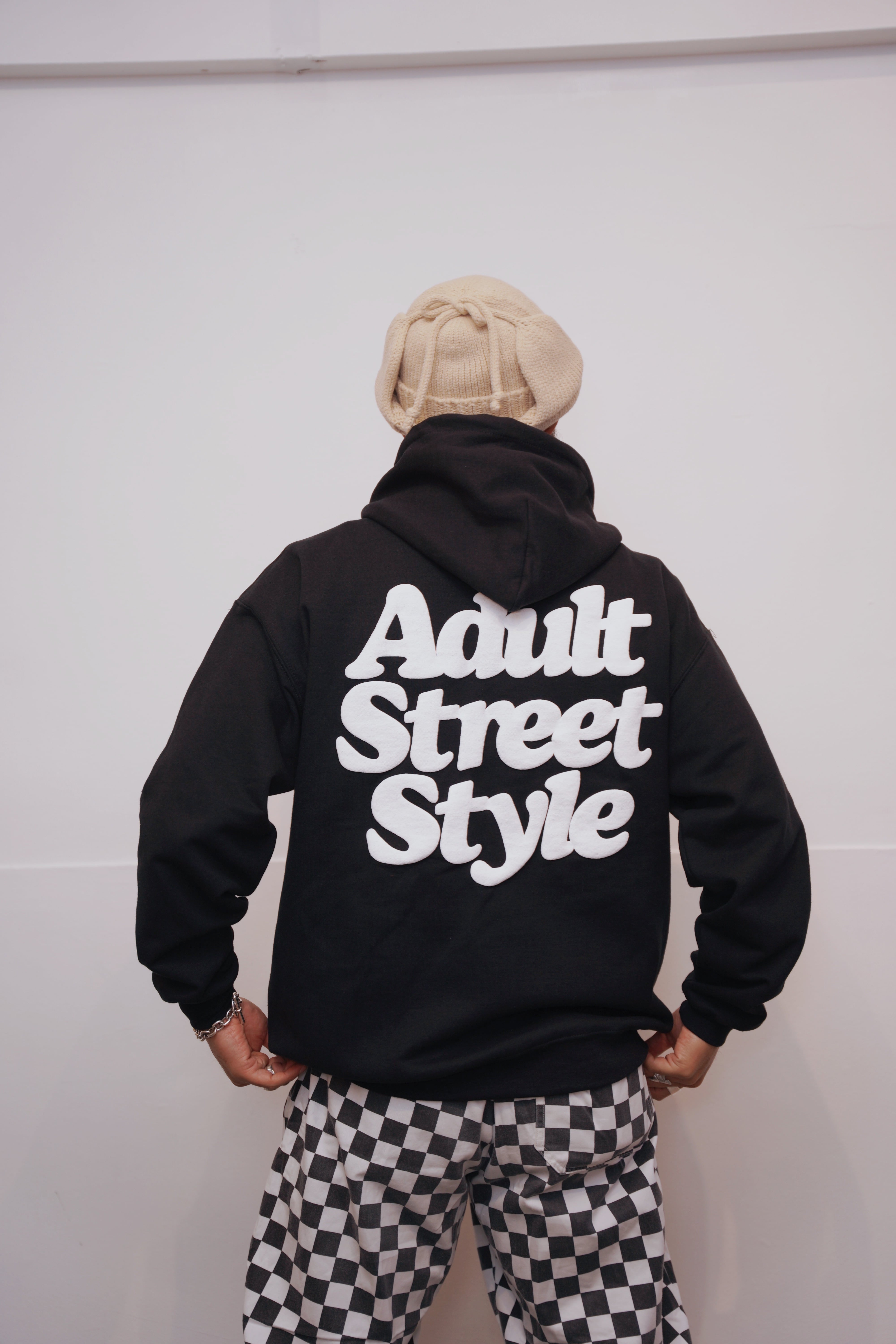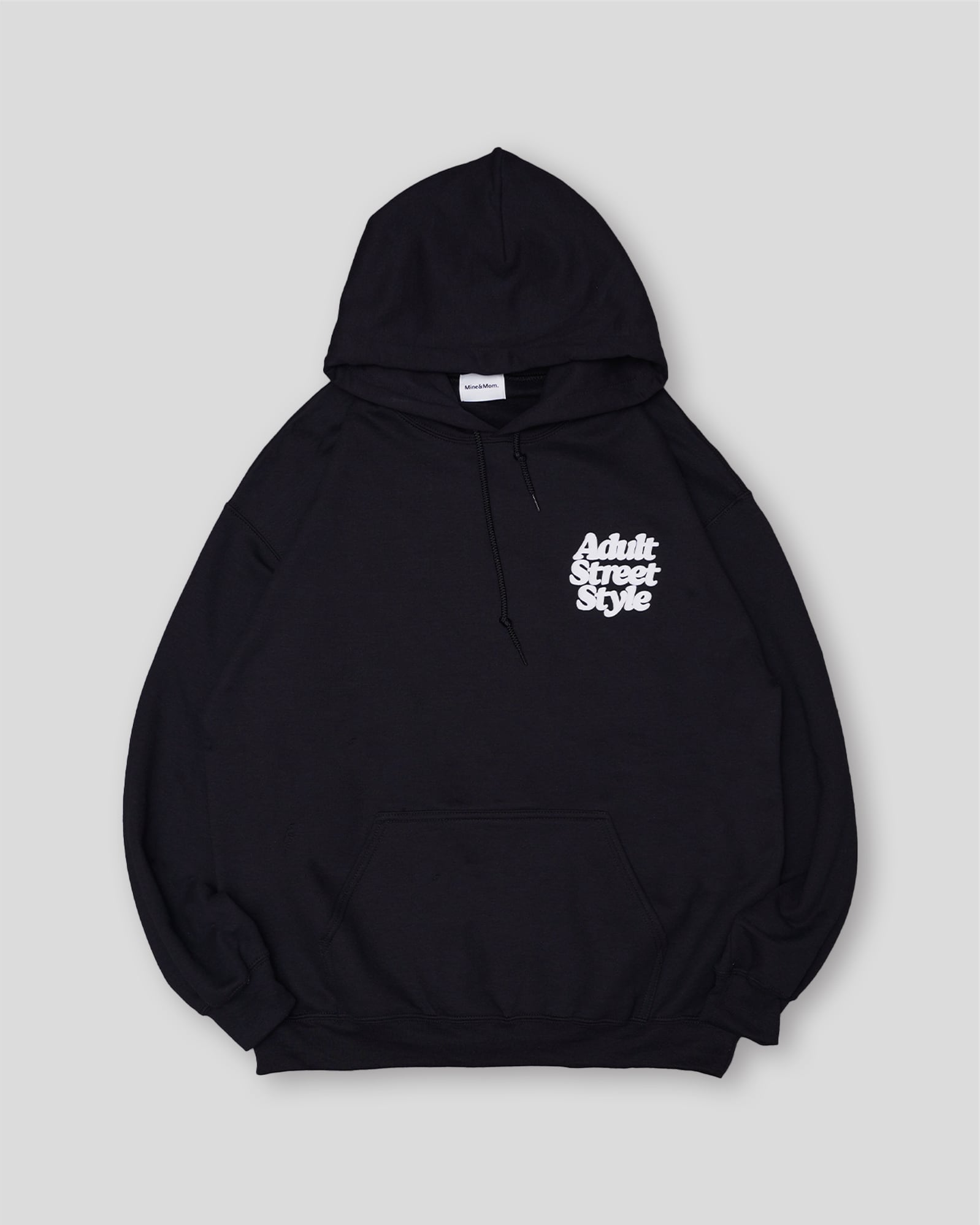 Mine&Mom.のコンセプトである"Adult Street Style"のロゴを左胸ワンポイントと大きくバックににプリントしたフーディー。