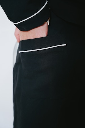 何にでも合わせやすい万能なスラックスながら、サイドとポケットに配置されたロープパイピングがアクセントに。