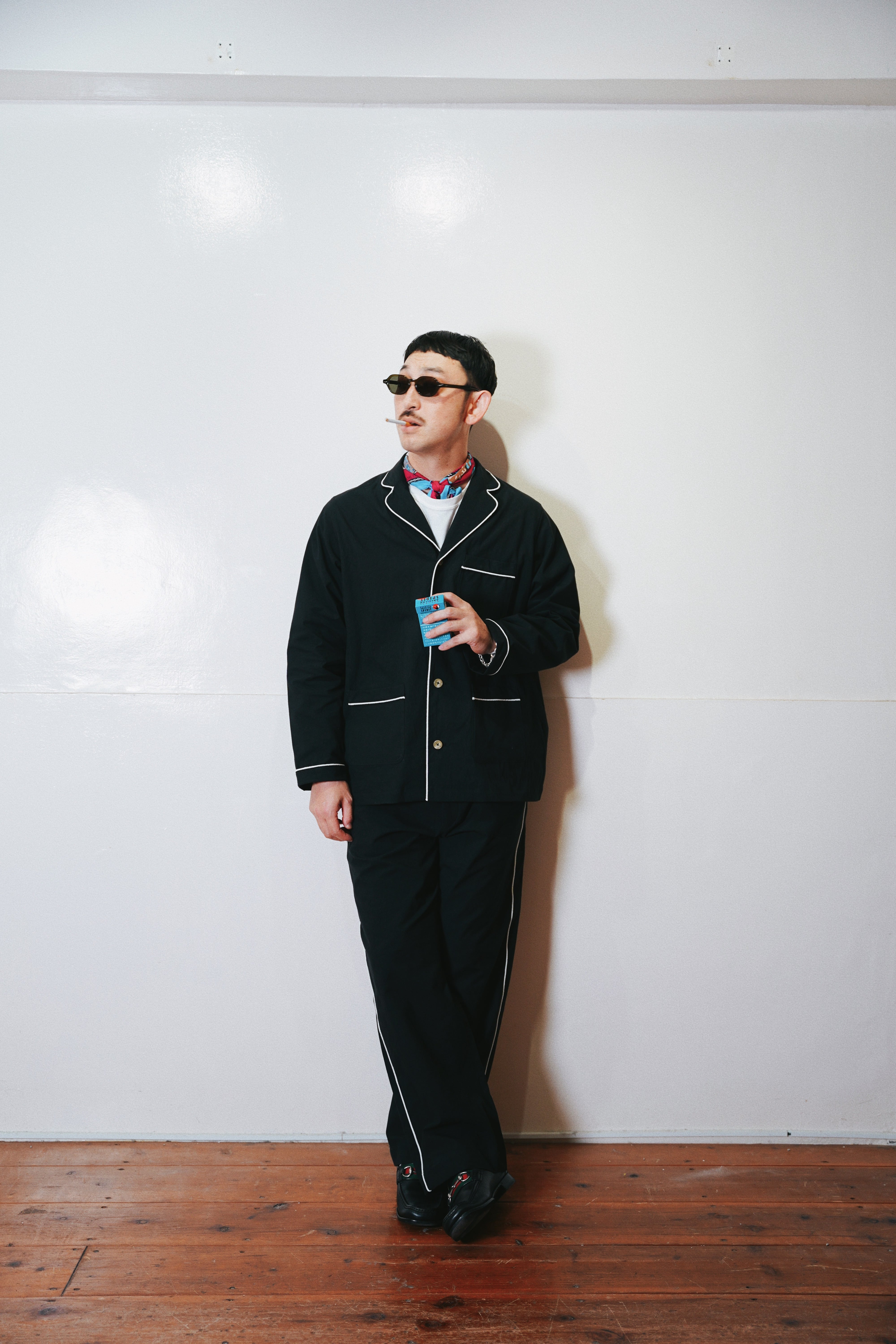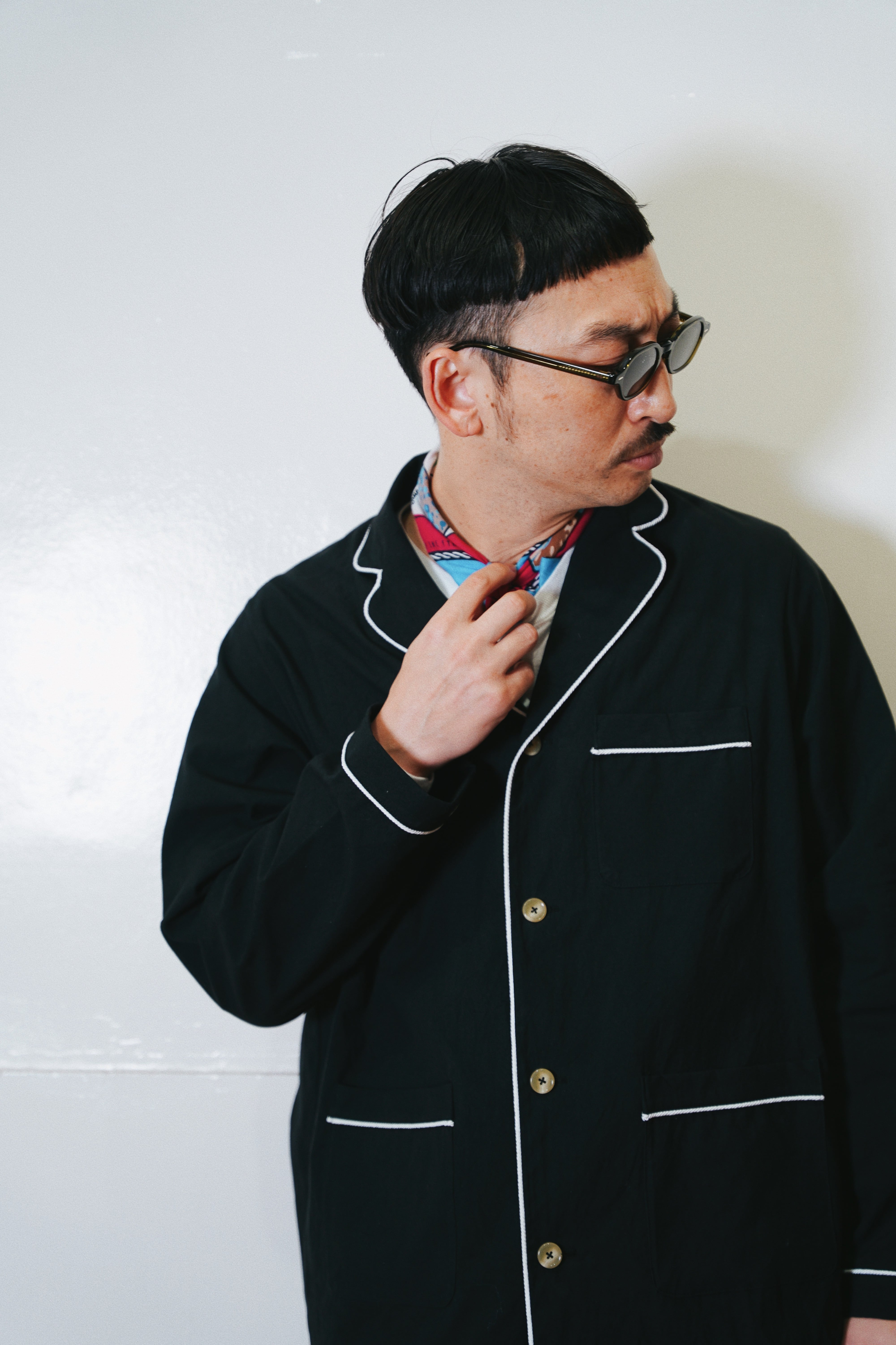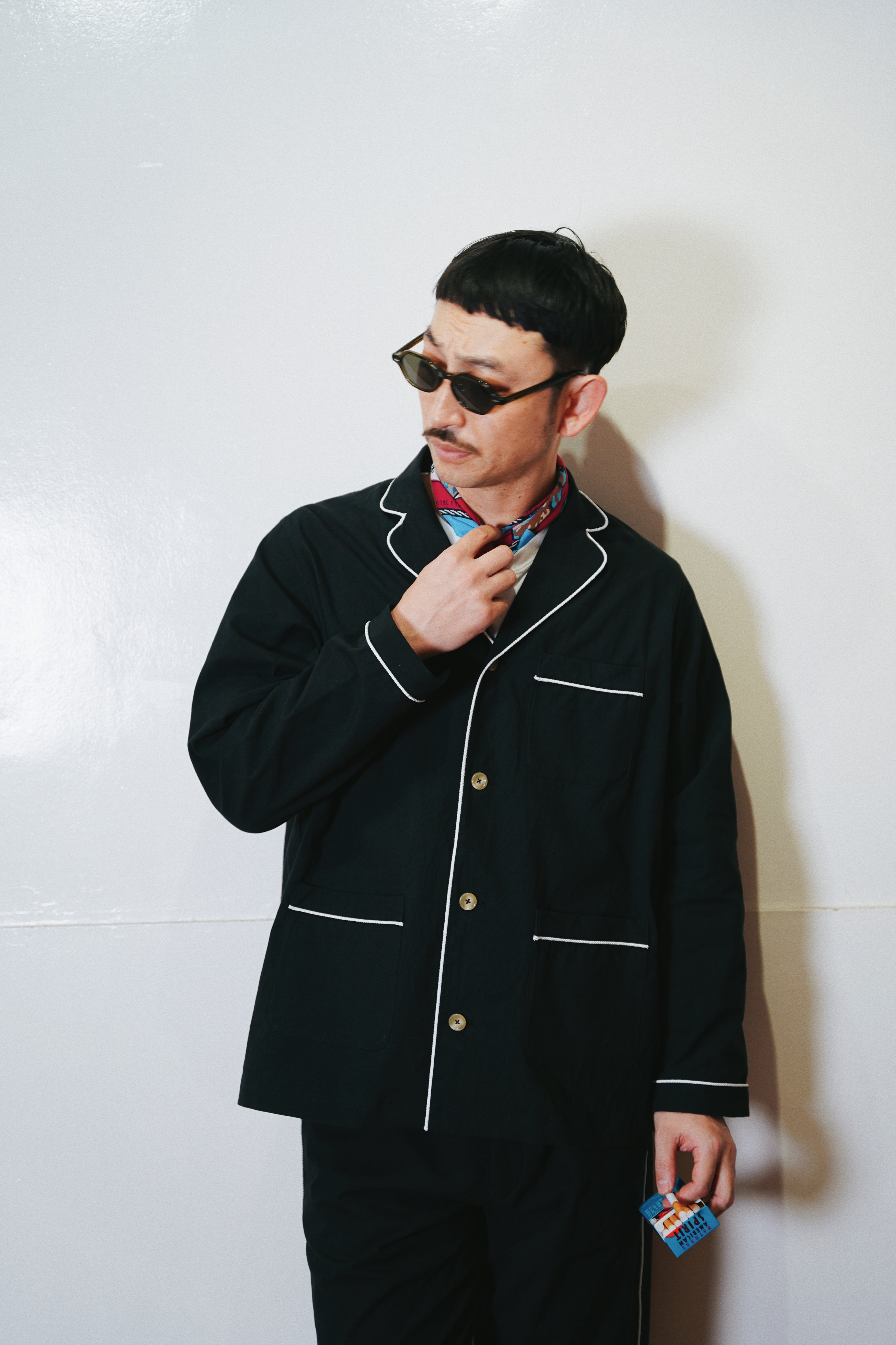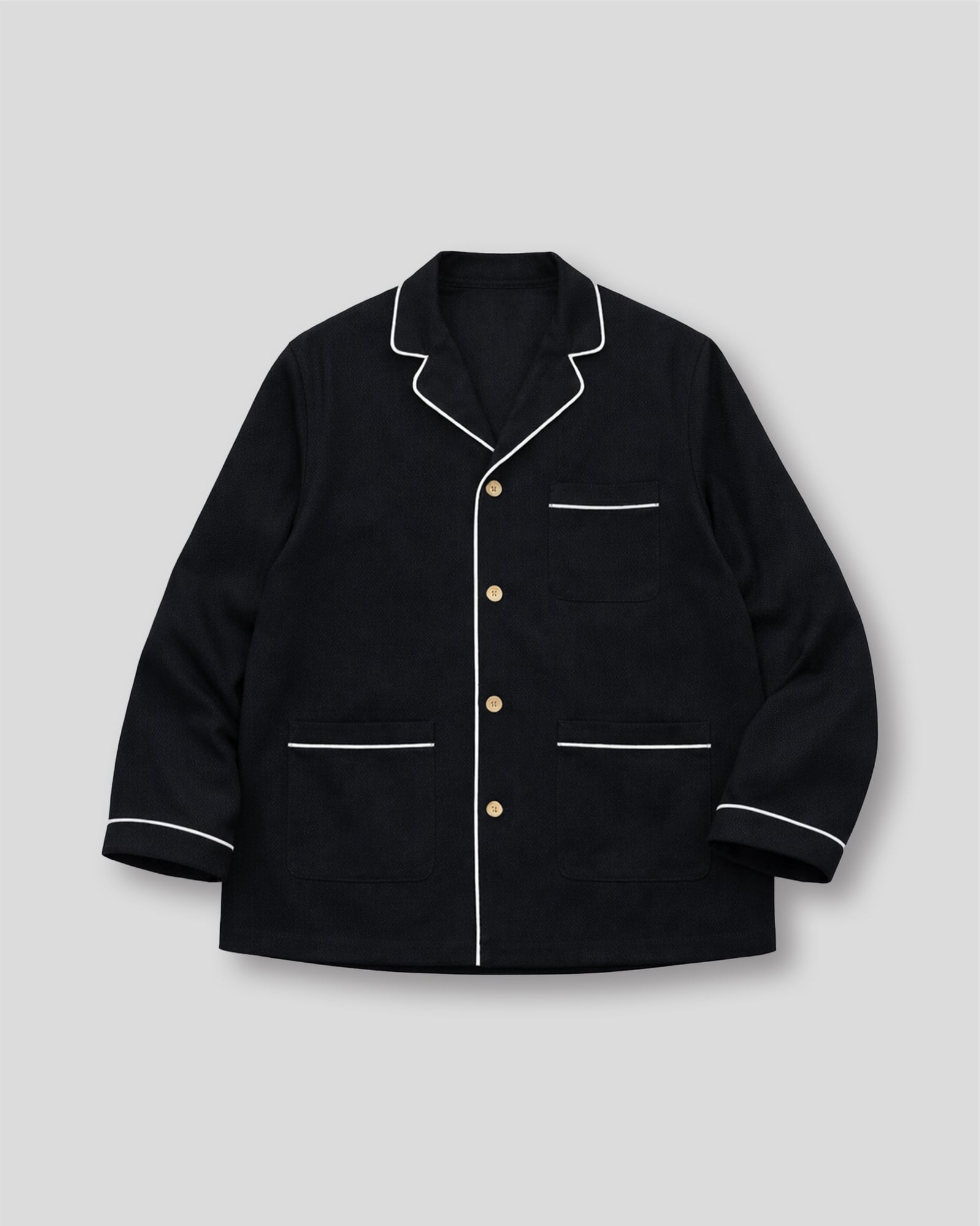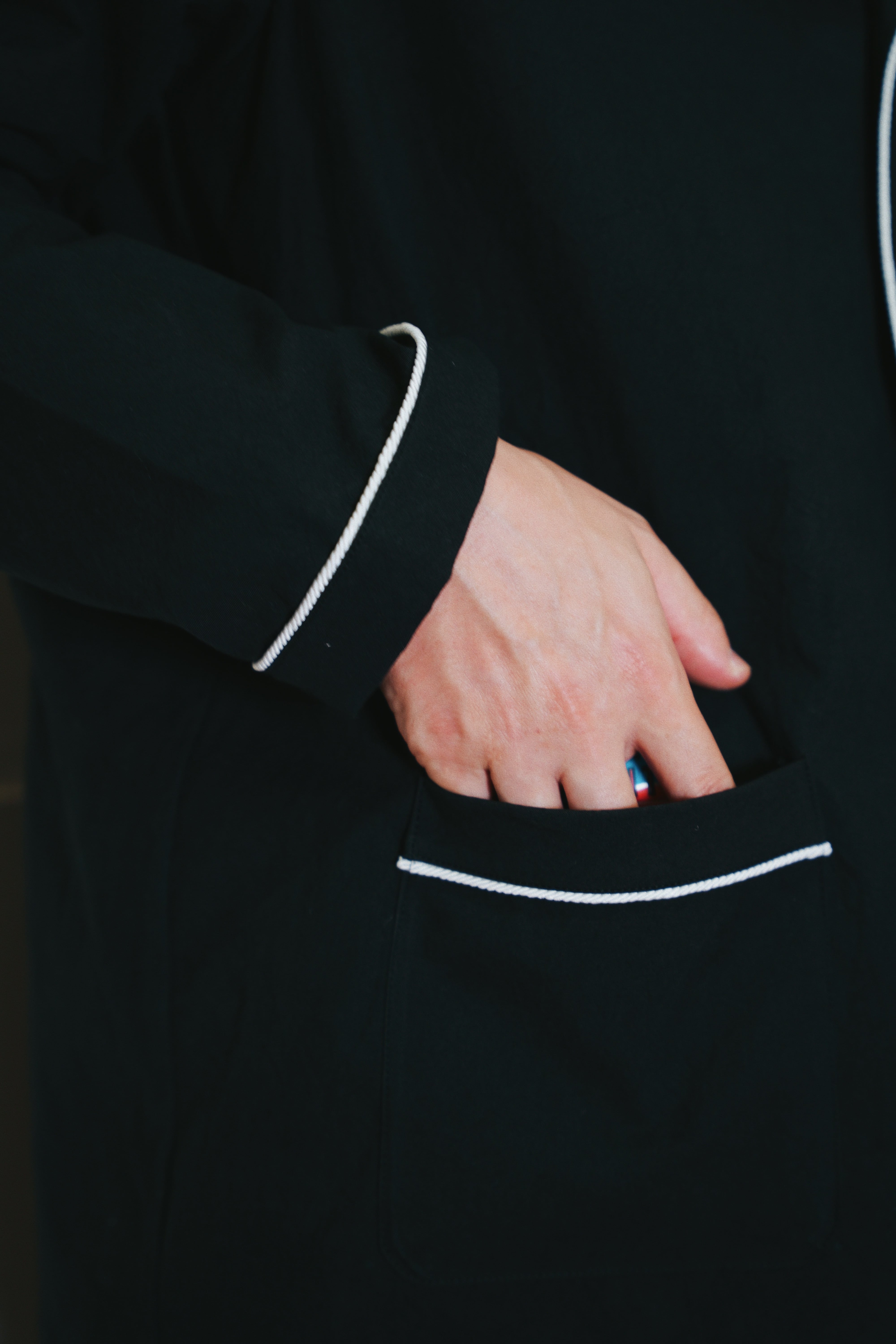 インナーとしてもアウターとしても、柄物など何にでも合わせられる万能アイテムながら通常のパジャマシャツにはないロープパイピングやポケットの配置がアクセントに。