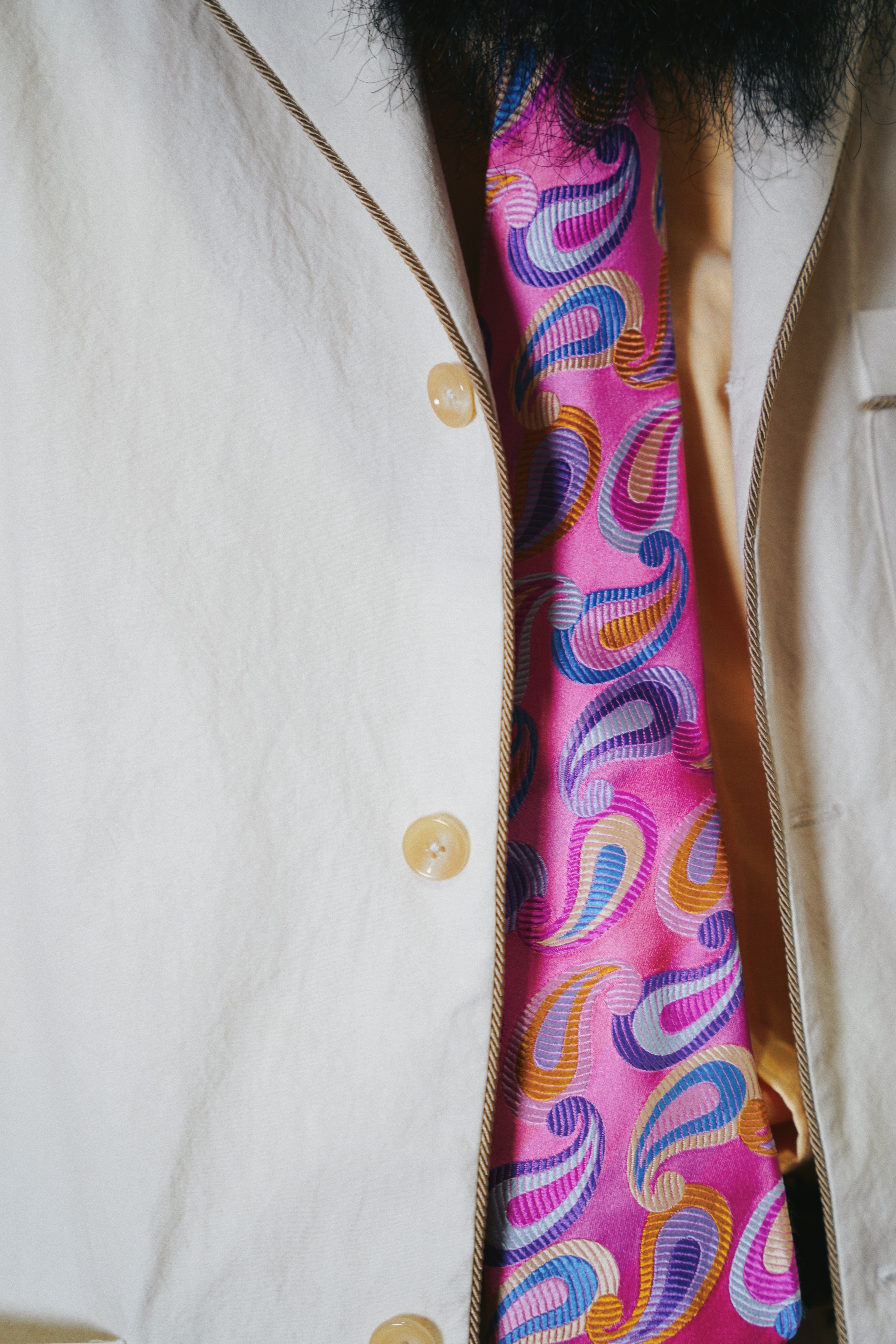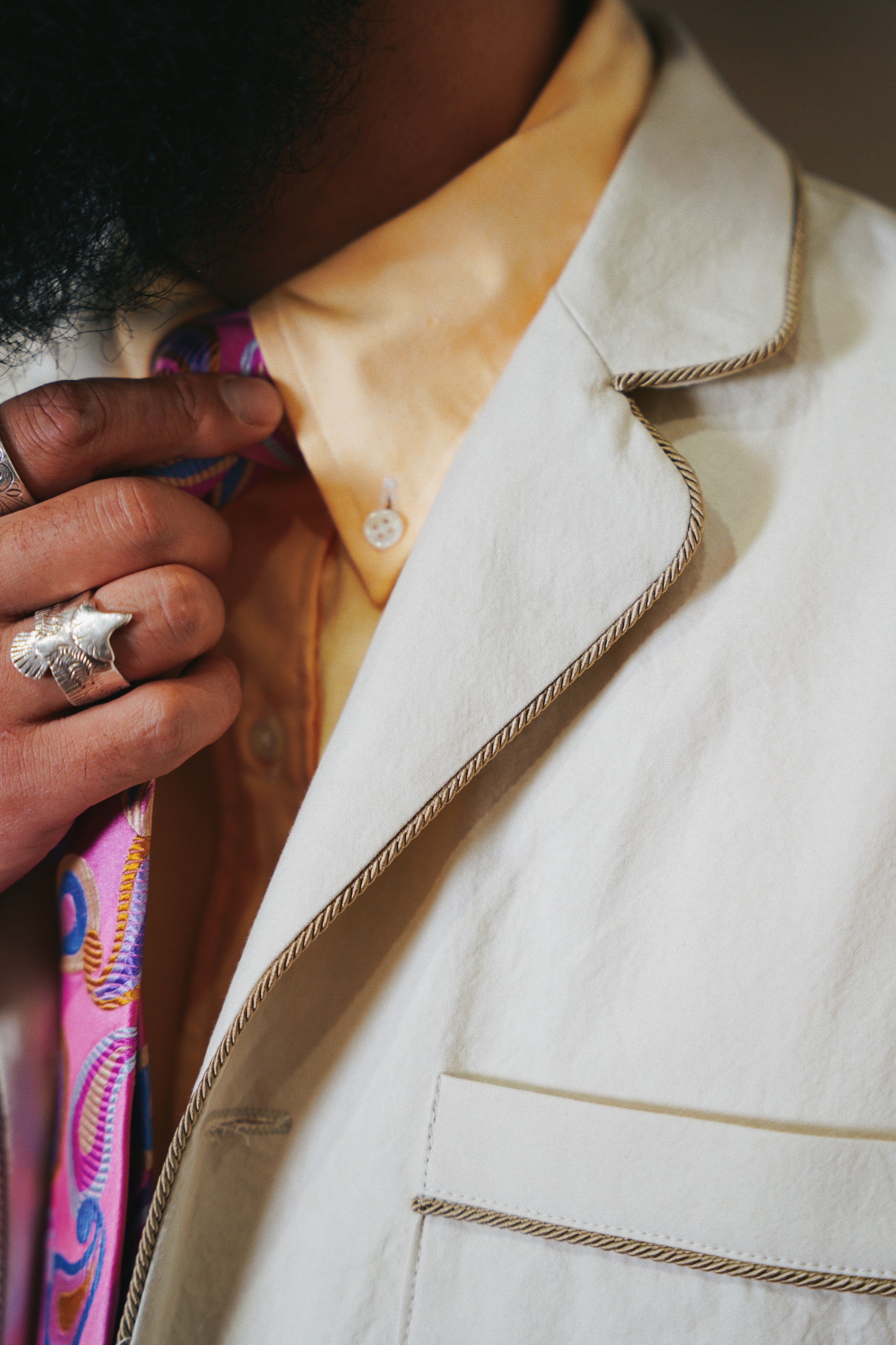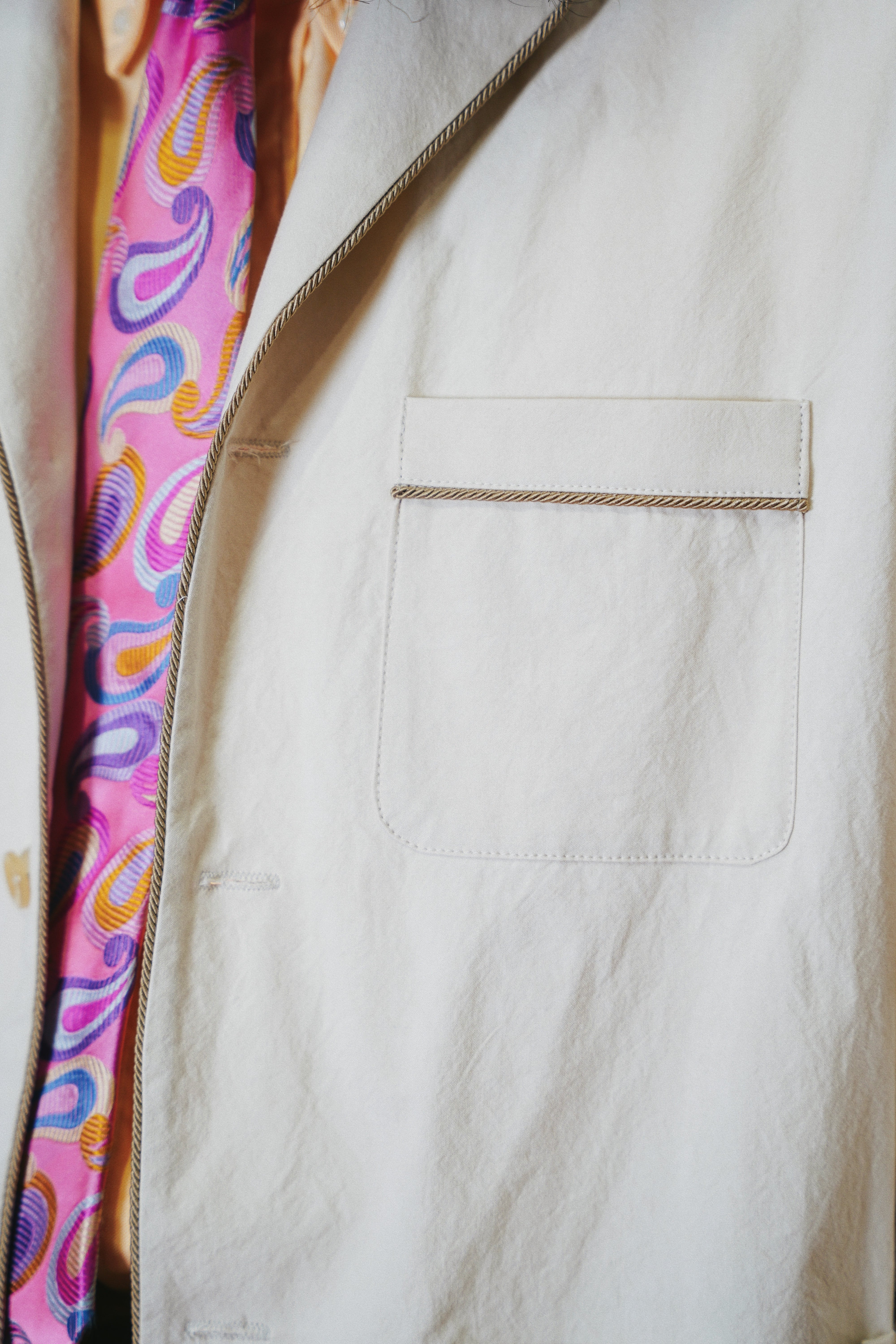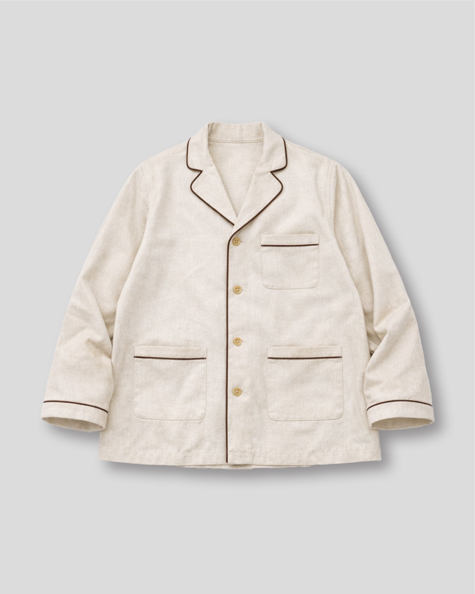 インナーとしてもアウターとしても、柄物など何にでも合わせられる万能アイテムながら通常のパジャマシャツにはないロープパイピングやポケットの配置がアクセントに。