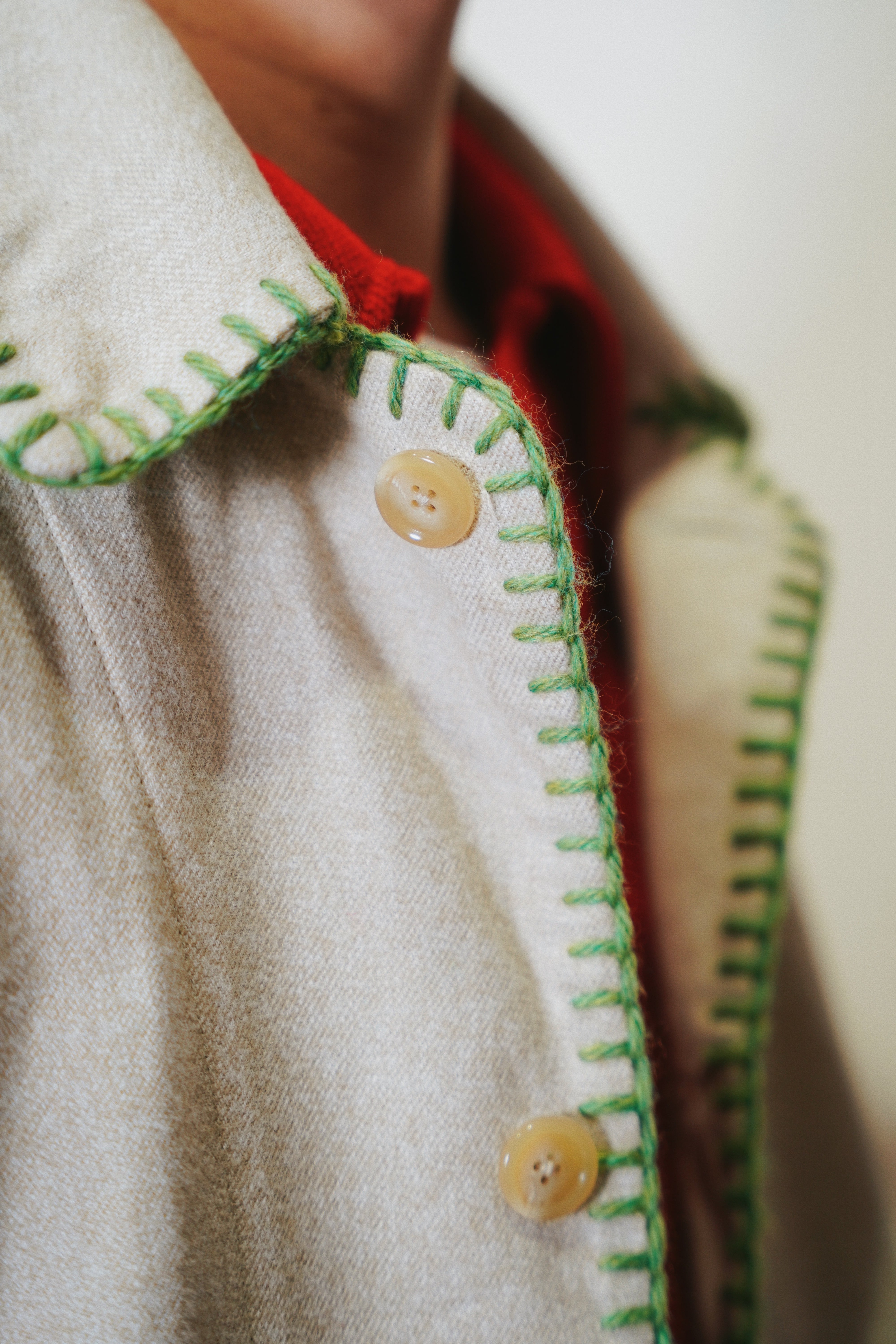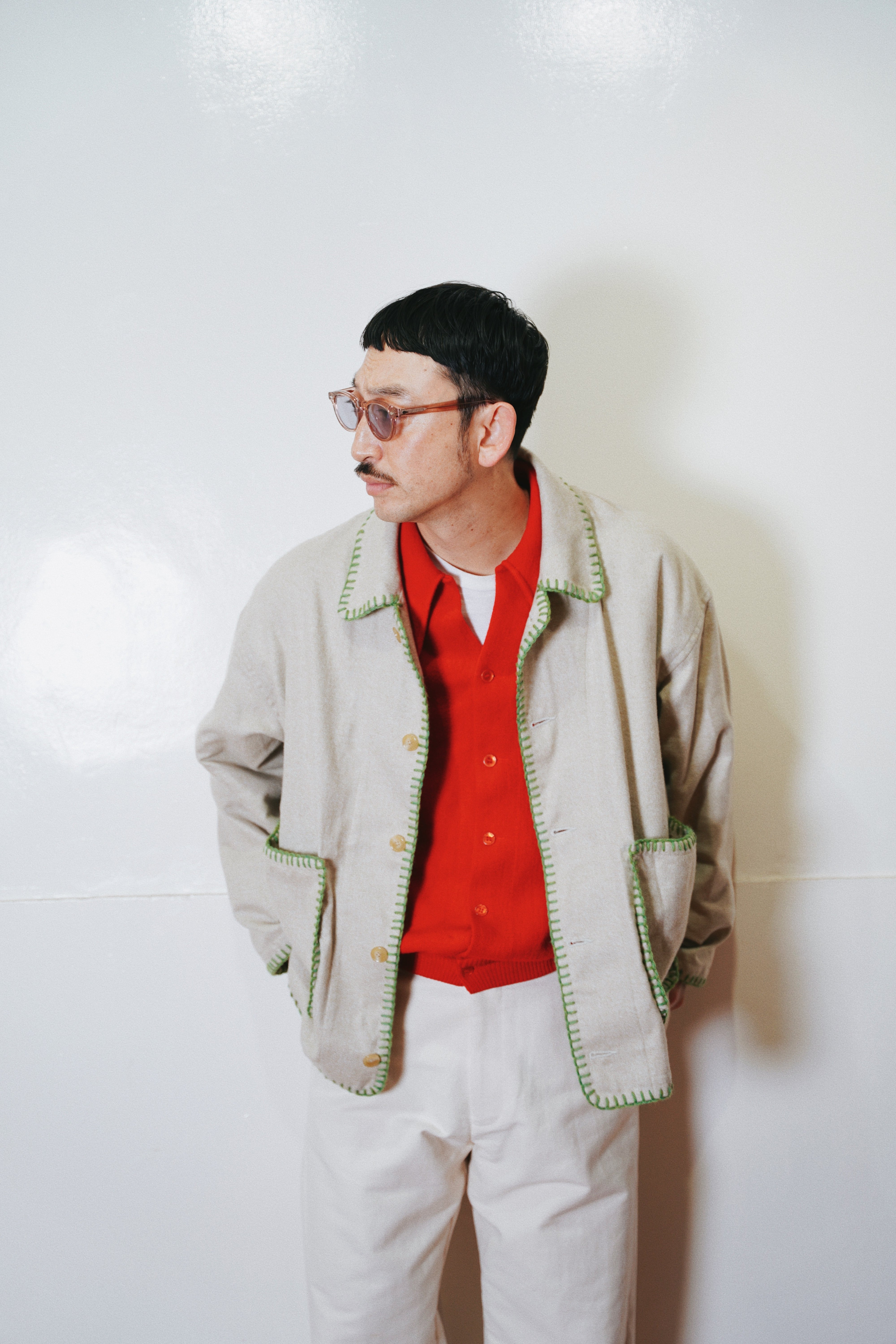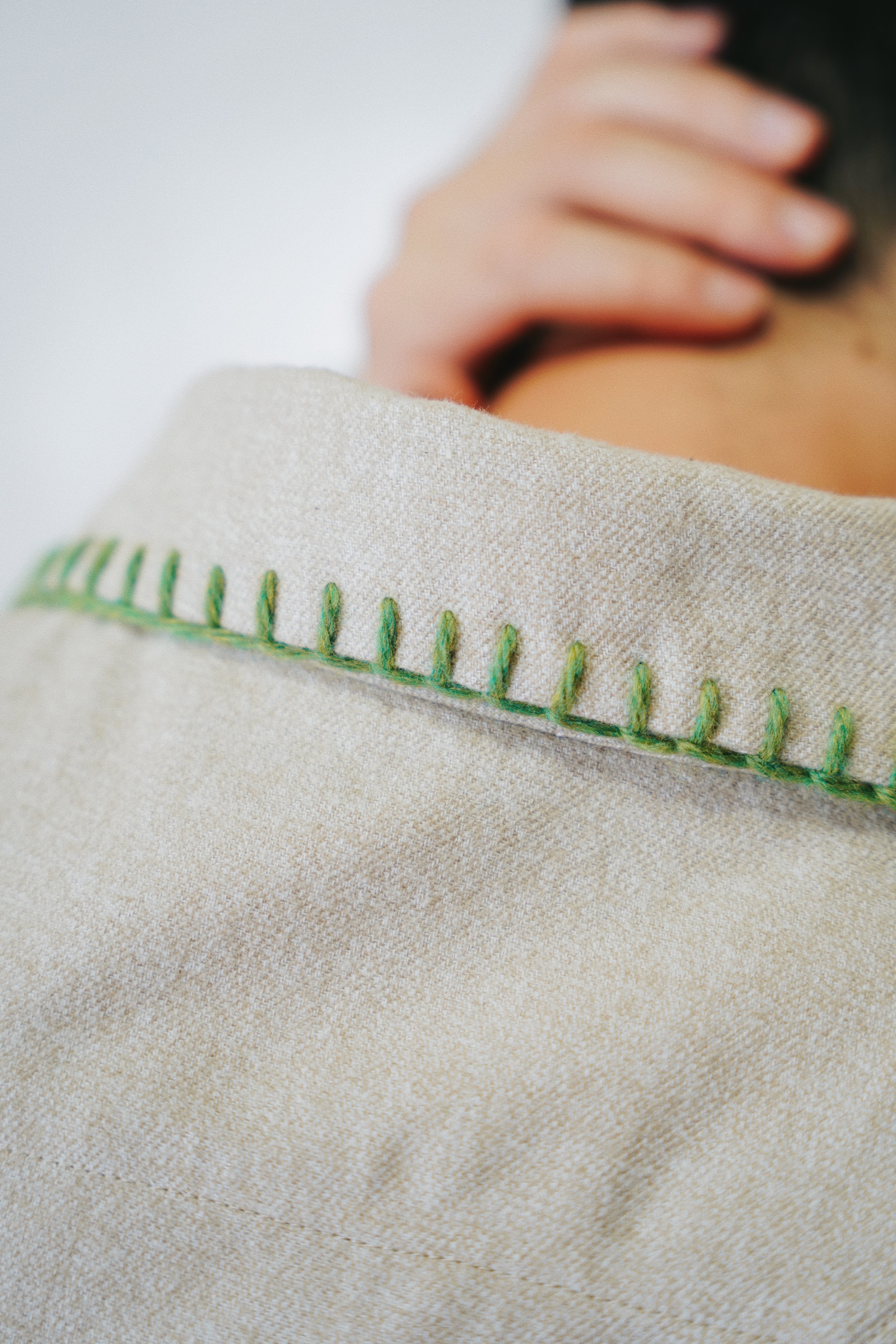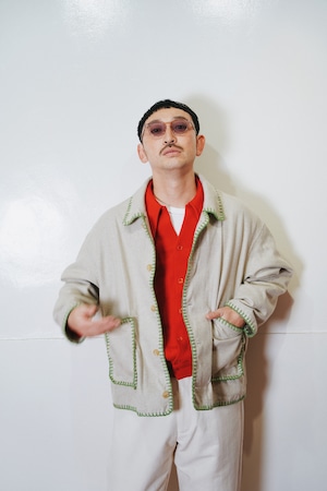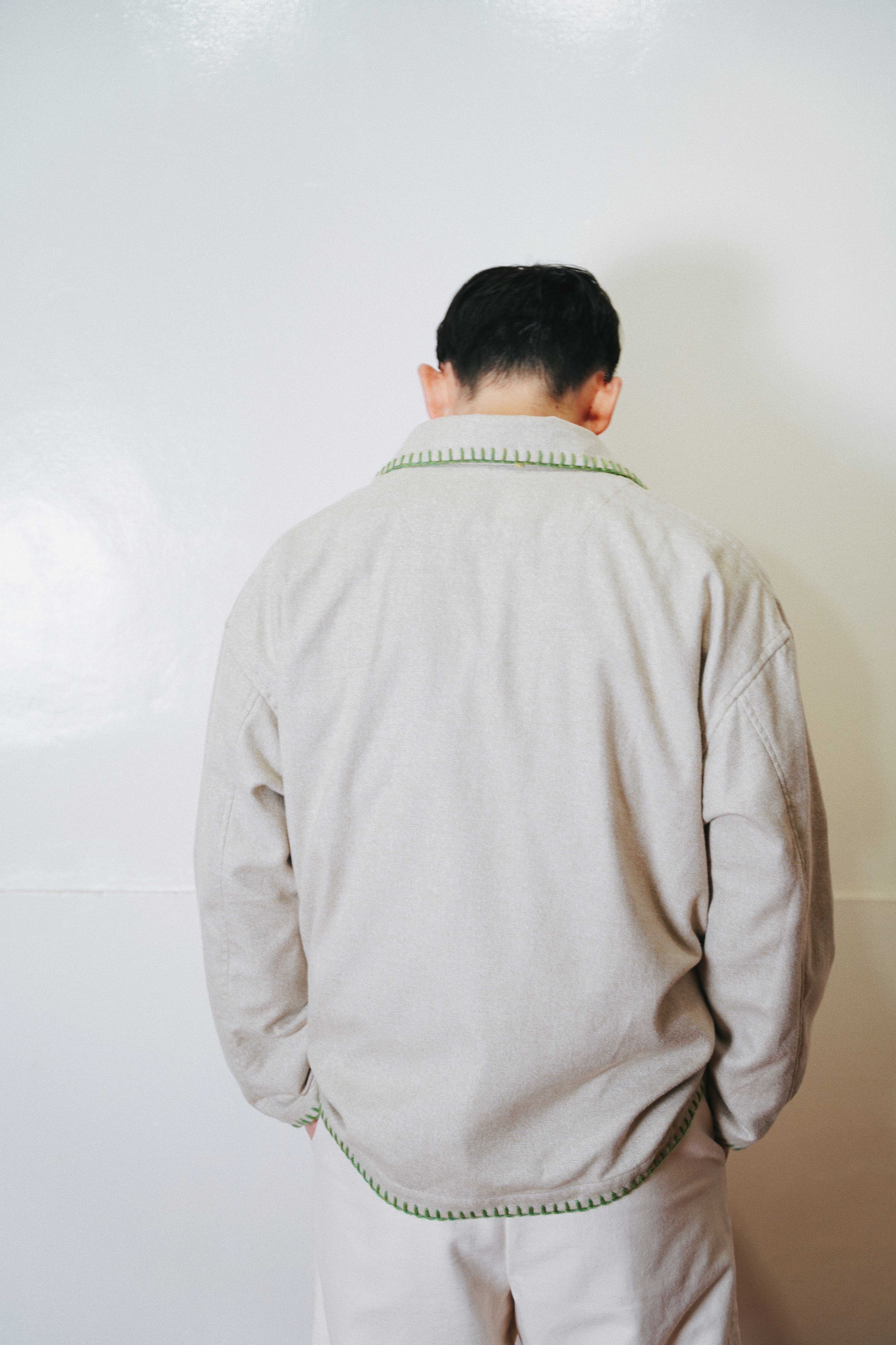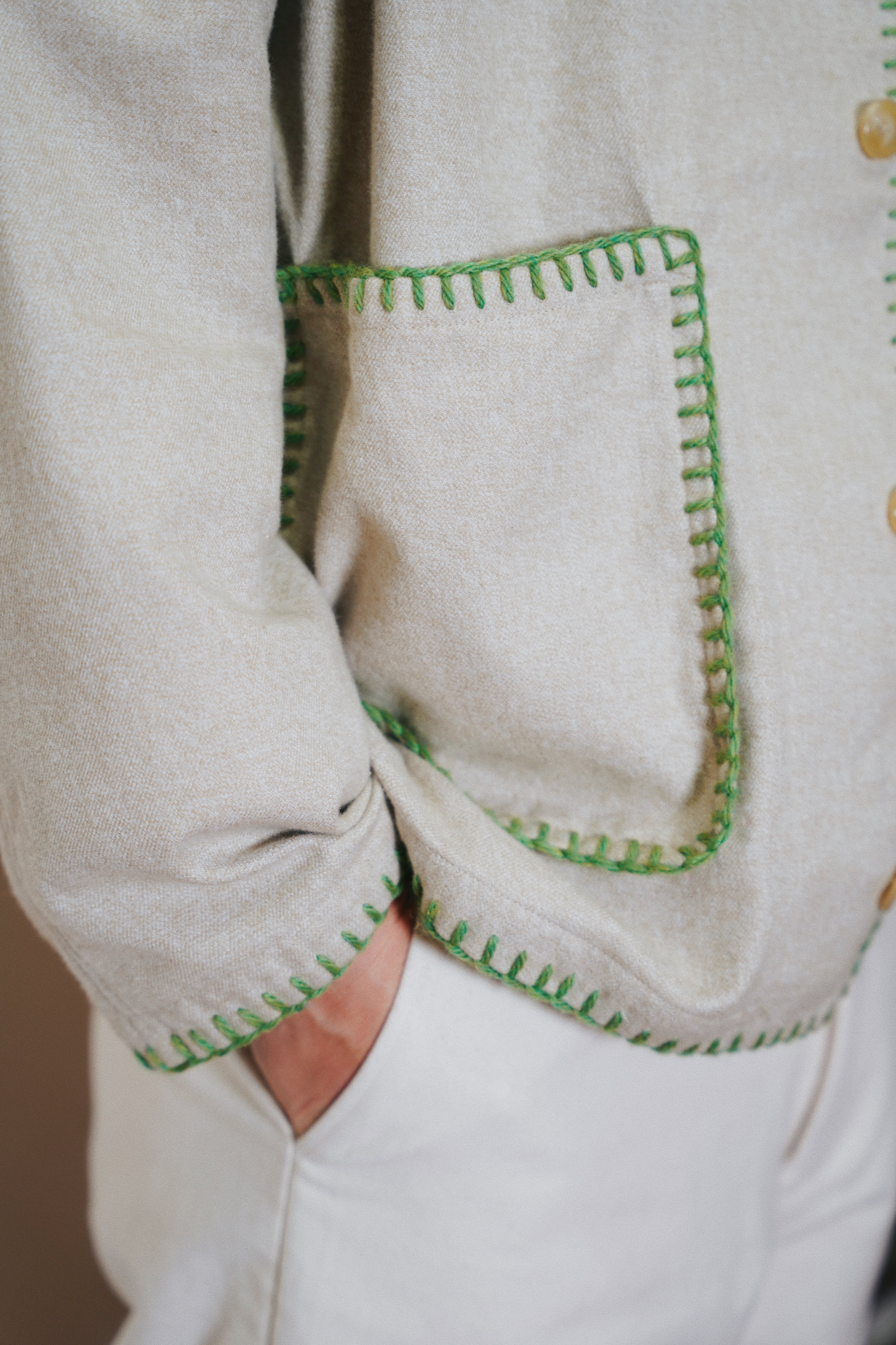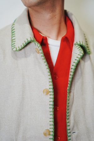 身幅とアームにゆとりを持たせたシルエット、メランジの風合い、ハンドブランケットステッチのアクセントによって唯一無二のアイテムに。