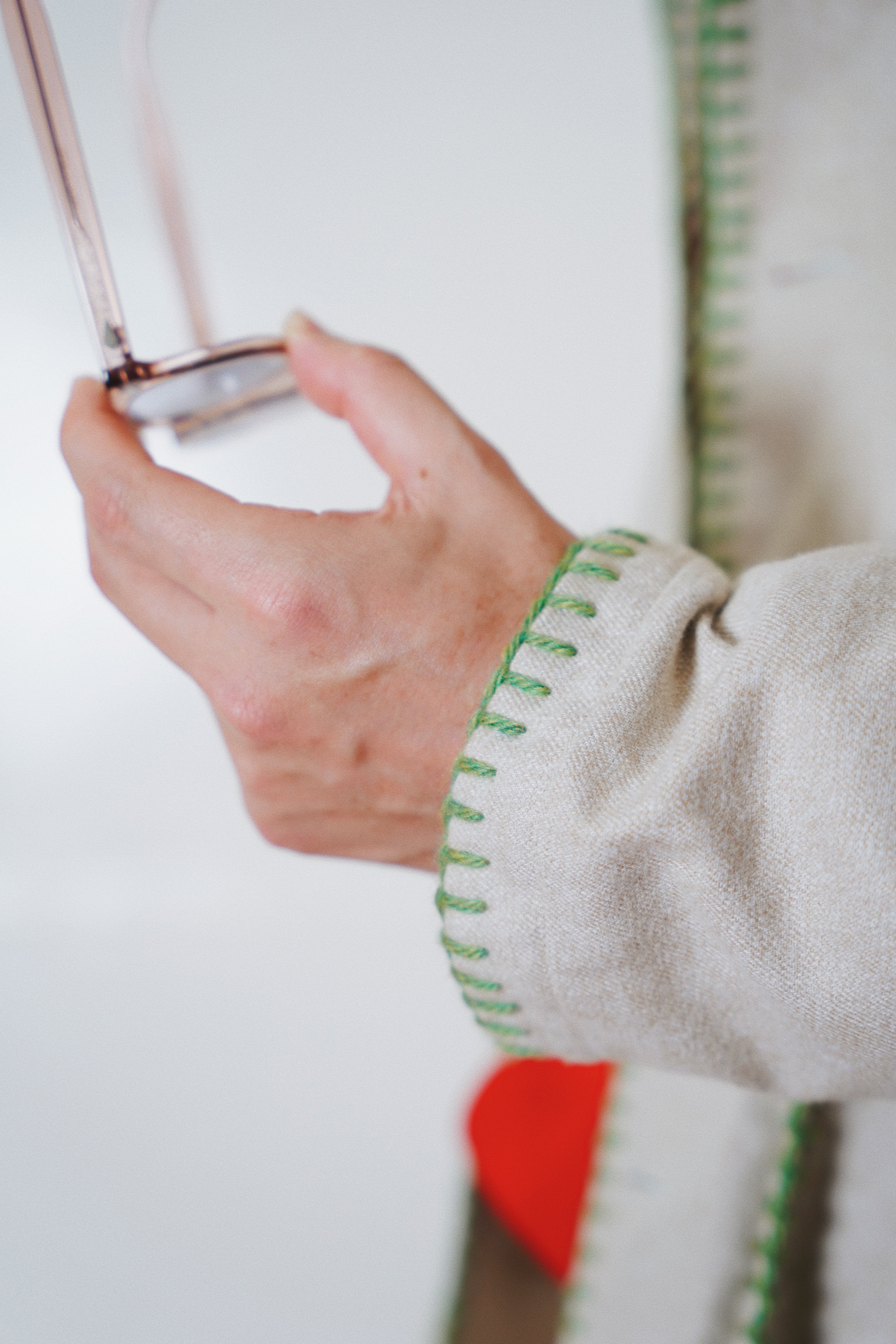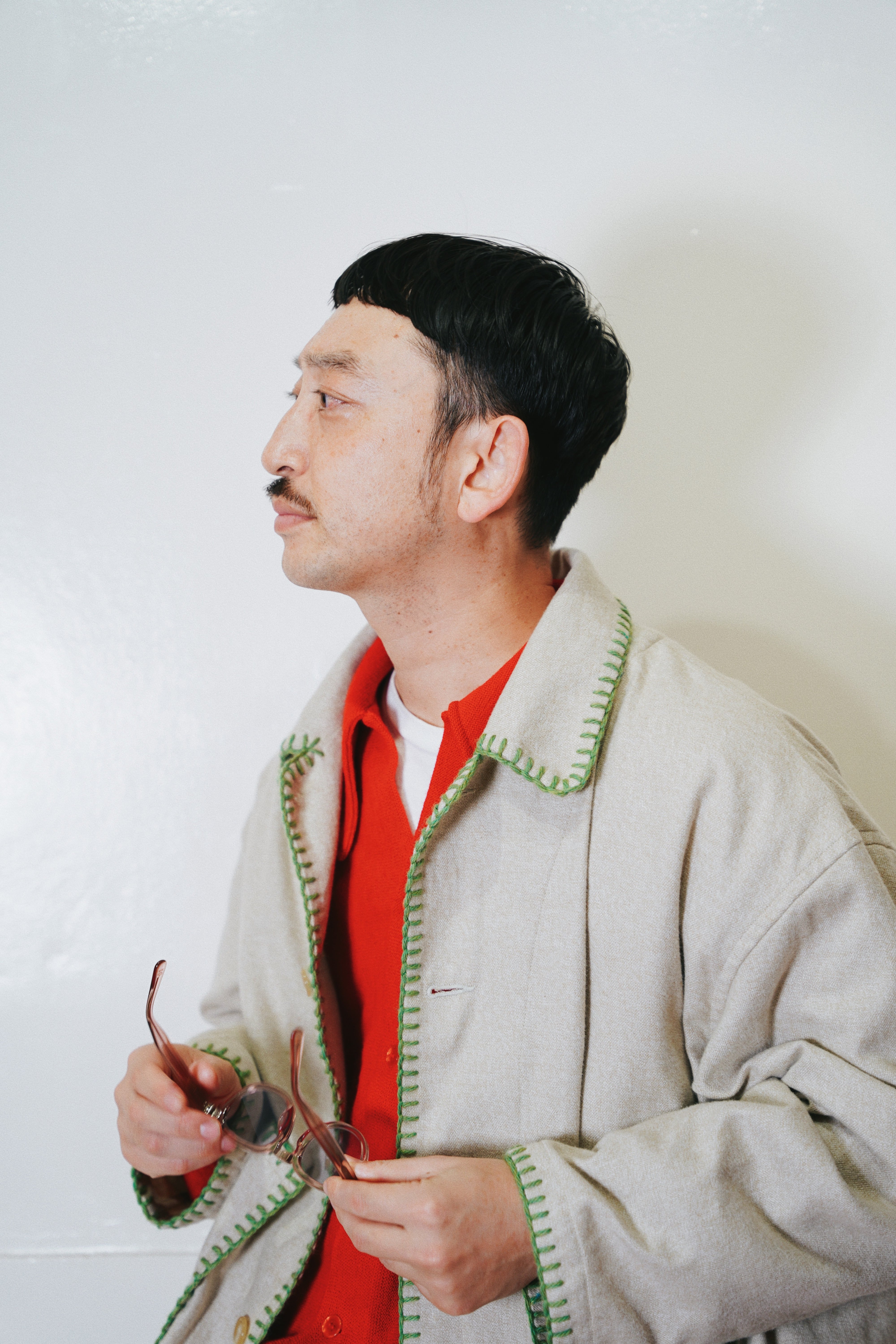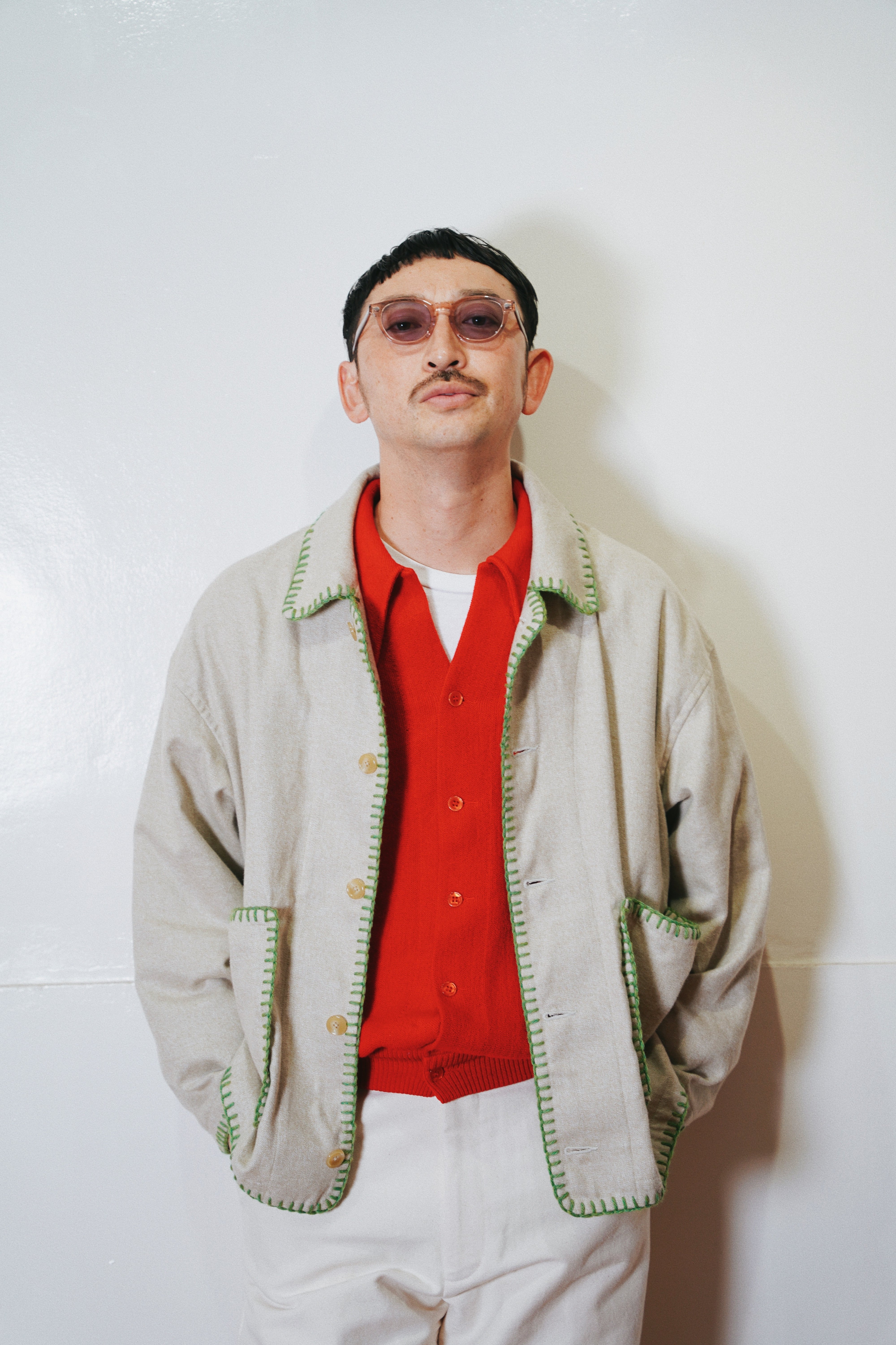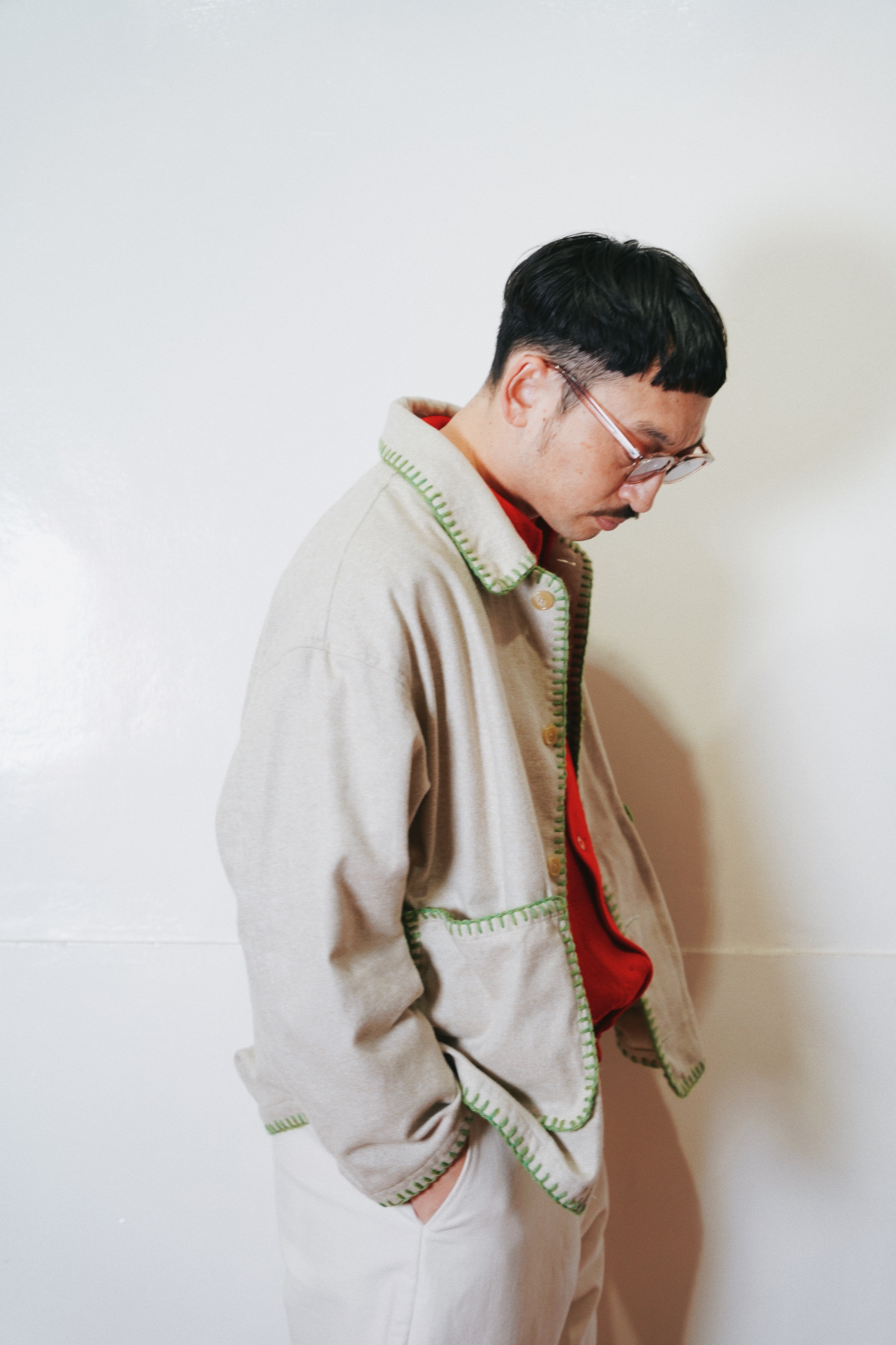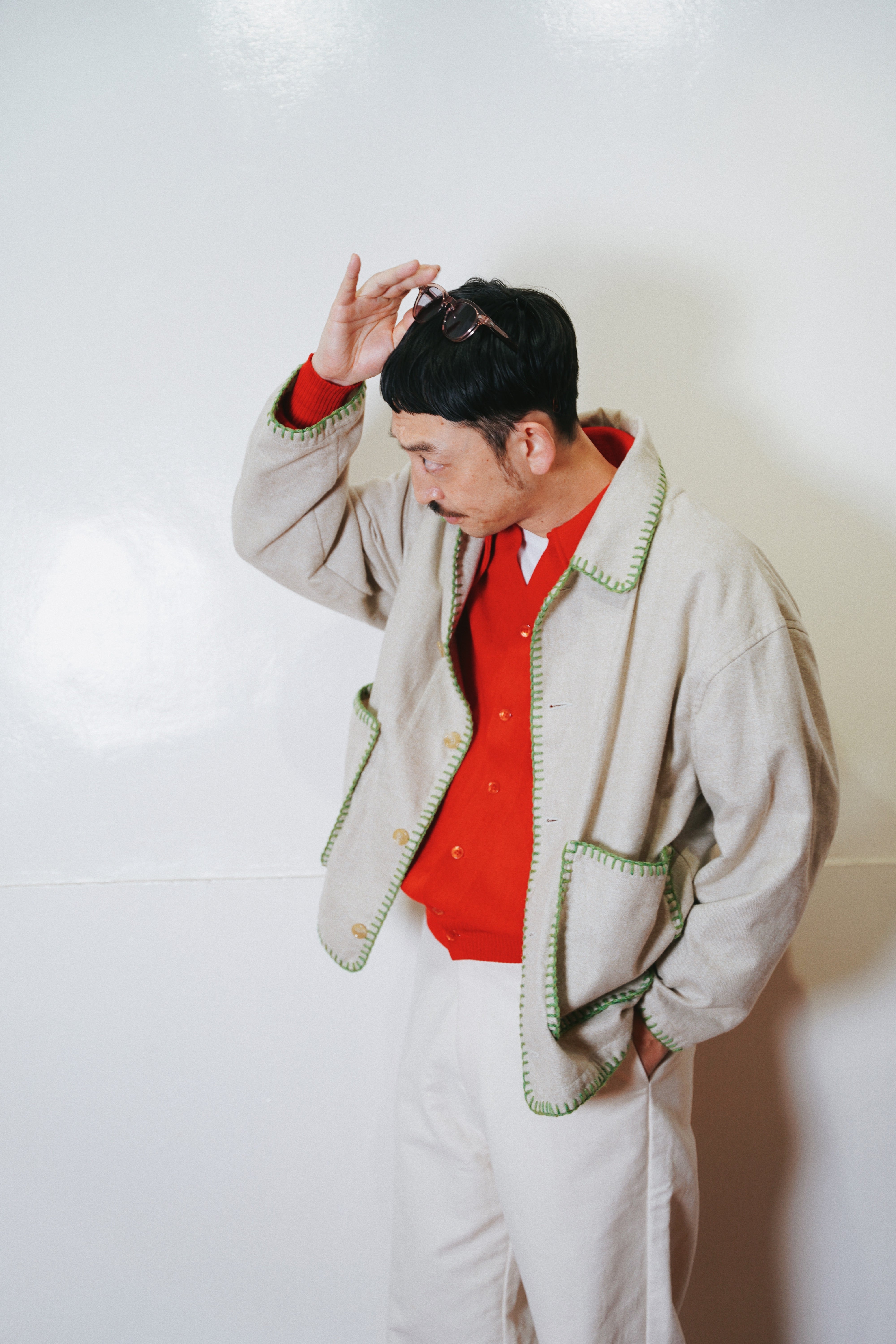 身幅とアームにゆとりを持たせたシルエット、メランジの風合い、ハンドブランケットステッチのアクセントによって唯一無二のアイテムに。