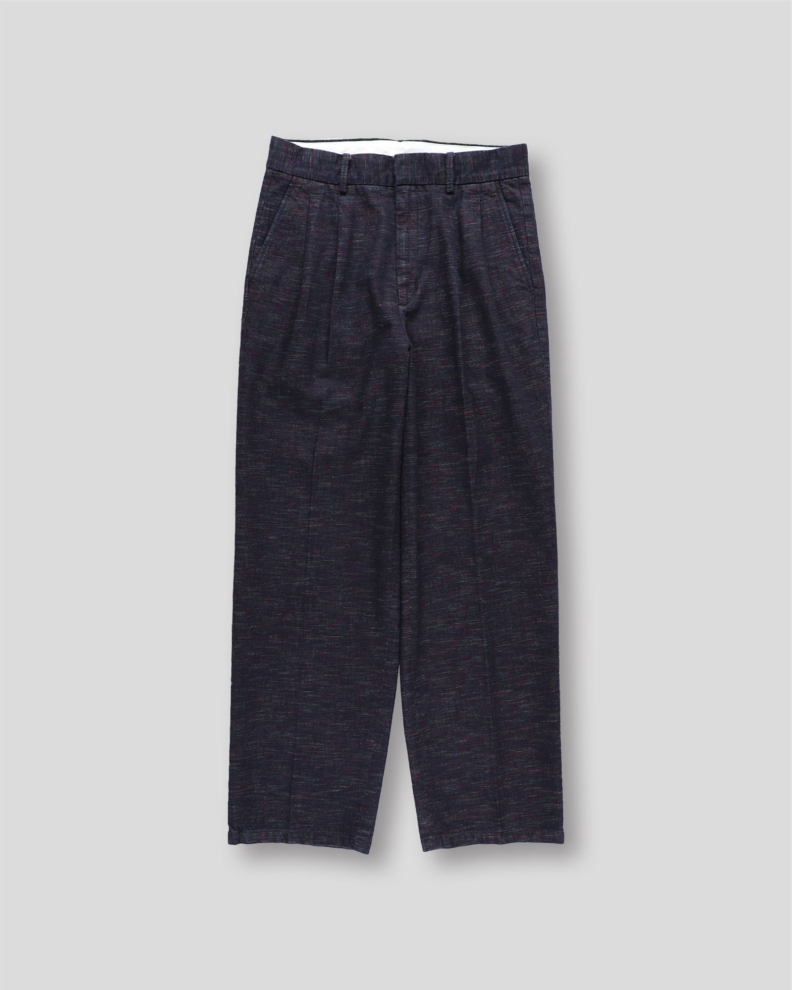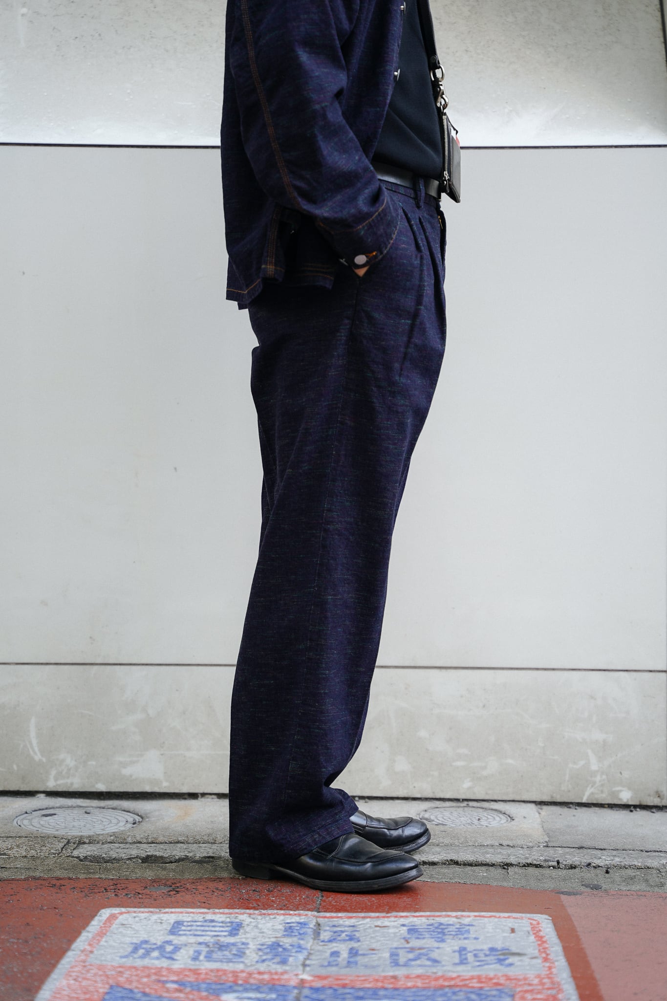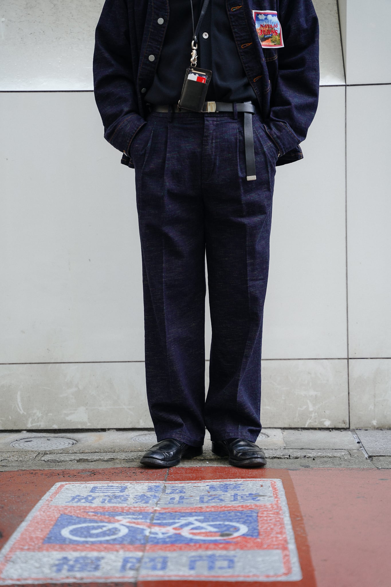ナローとワイドの中間ほどのボリュームを持たせ、裾に向けテーパードしていくスラックスタイプの“Morenci(モレンシ)”。腰裏のマーベルト、センタープリーツなど、スラックスらしいフォーマルな仕様、ディテールで仕立てている。
