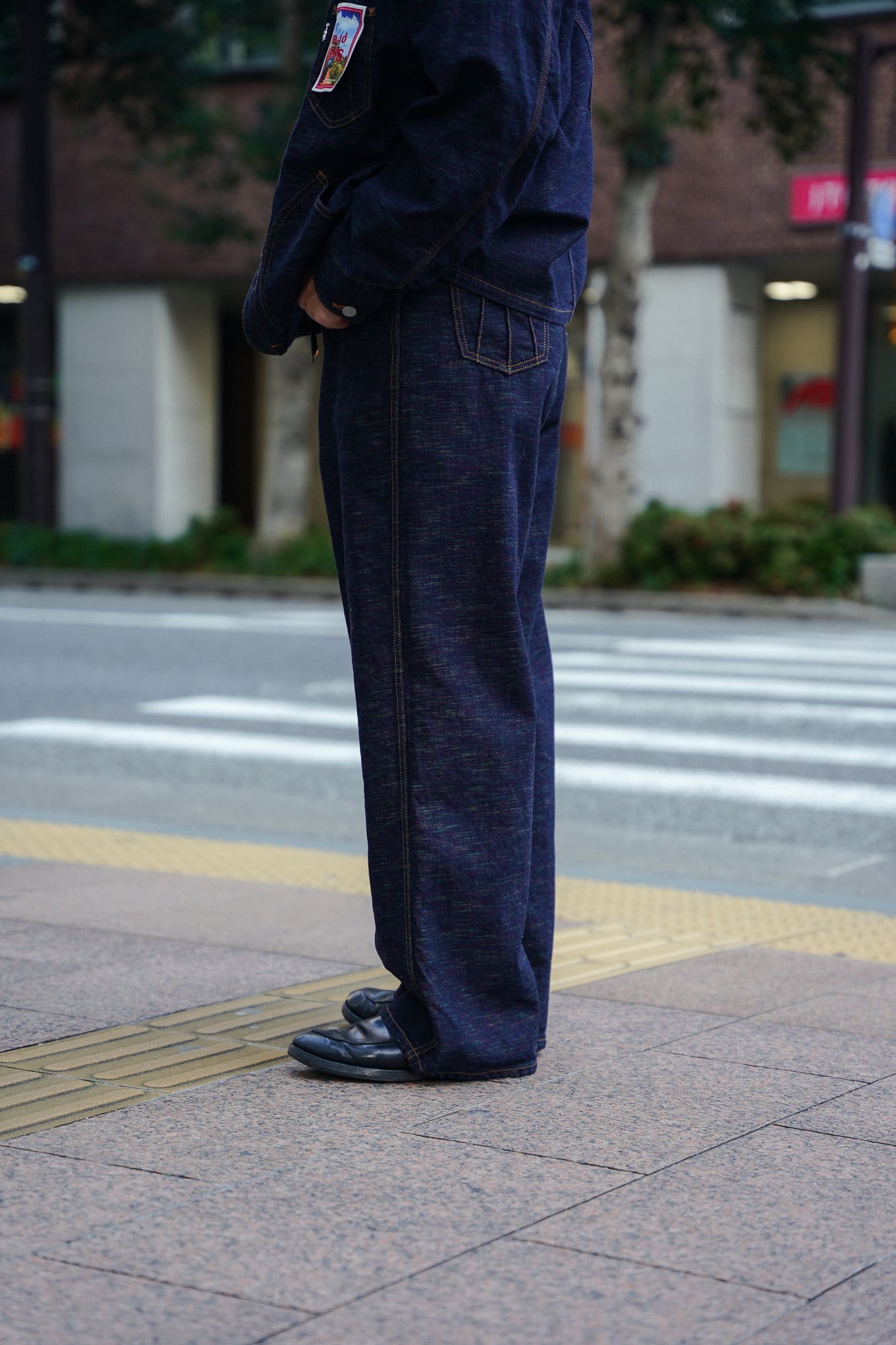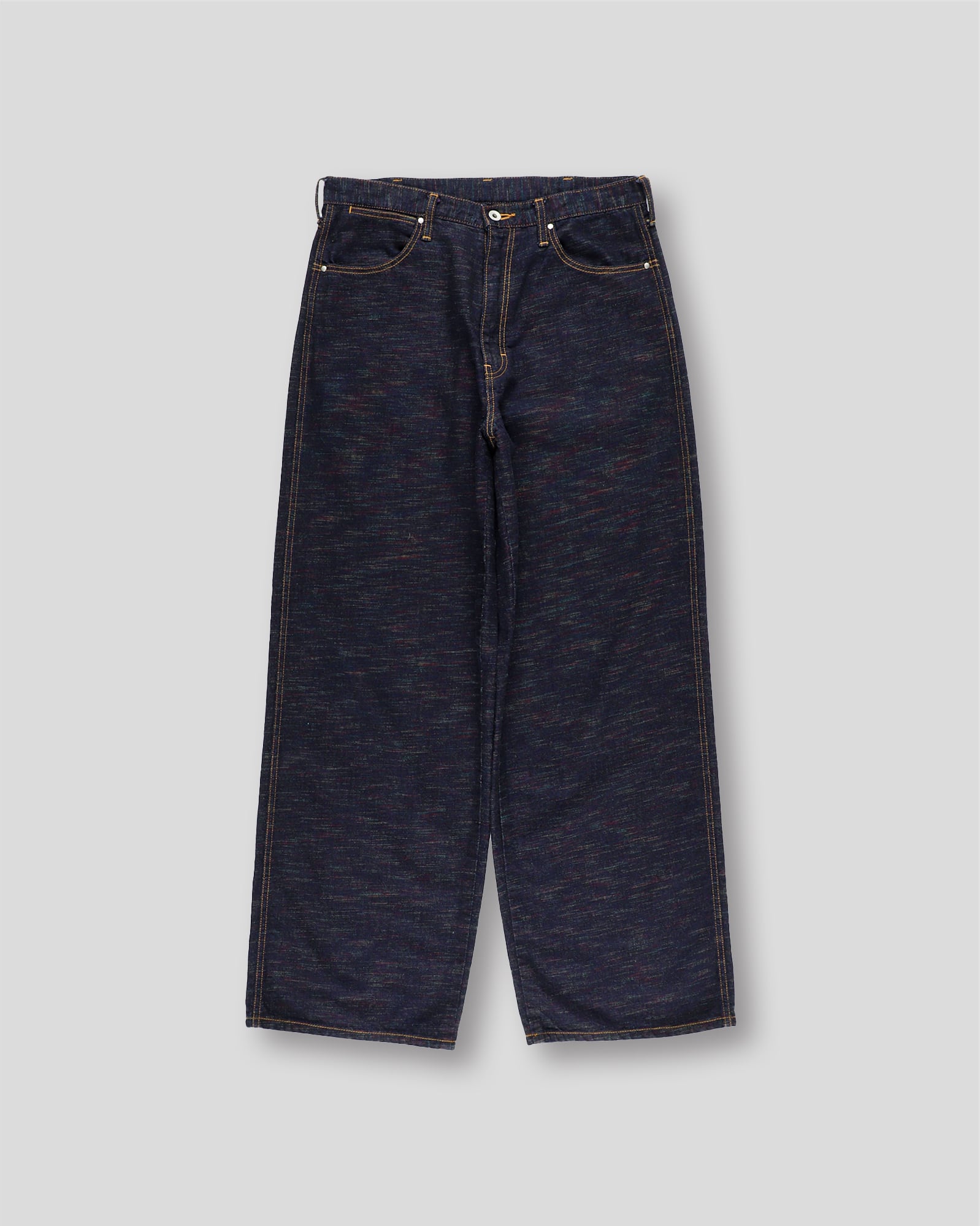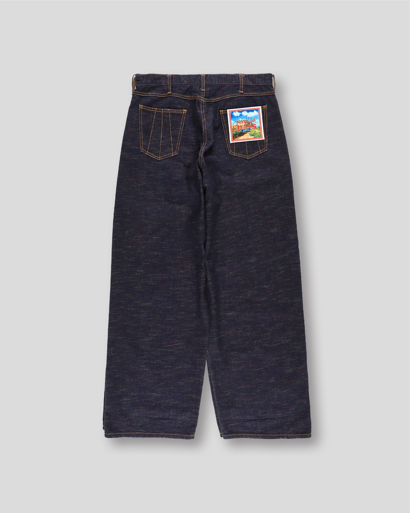 インディアンジュエリーのインレイワーク(はめ込み技法)をイメージし、カラフルなカスリ糸を使用した11.5ozデニムシリーズ。サンバースト(太陽光線)を思わせる随所のピンタック、スタッズワークをイメージしたリベット使いなど、ジュエリーにおけるナバホの技法やデザインをディテールとして採用。生地の製作から縫製まで全行程をデニムの産地岡山にて製造。縦糸にインディゴ、横糸にカスリ糸を使用しており、履き込むごとに色落ち、ムラ感がコントラストとして現れる一本。