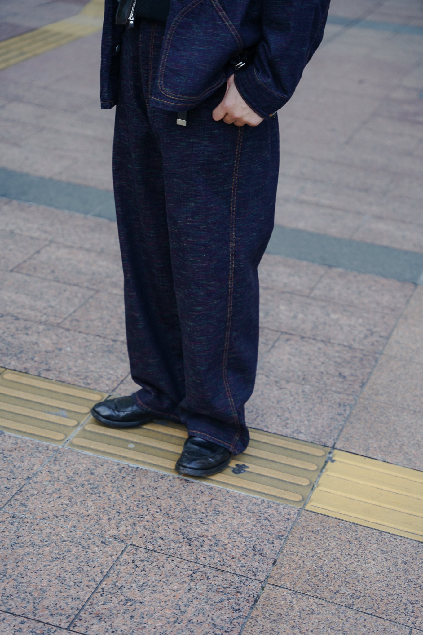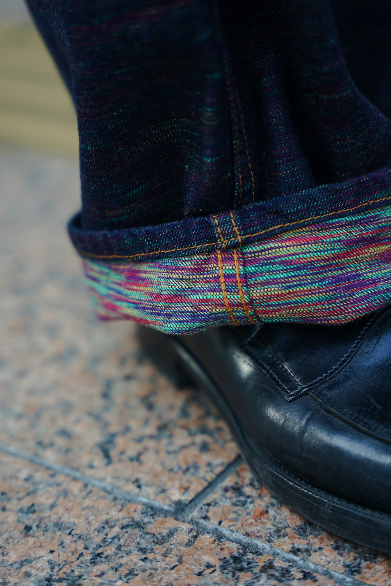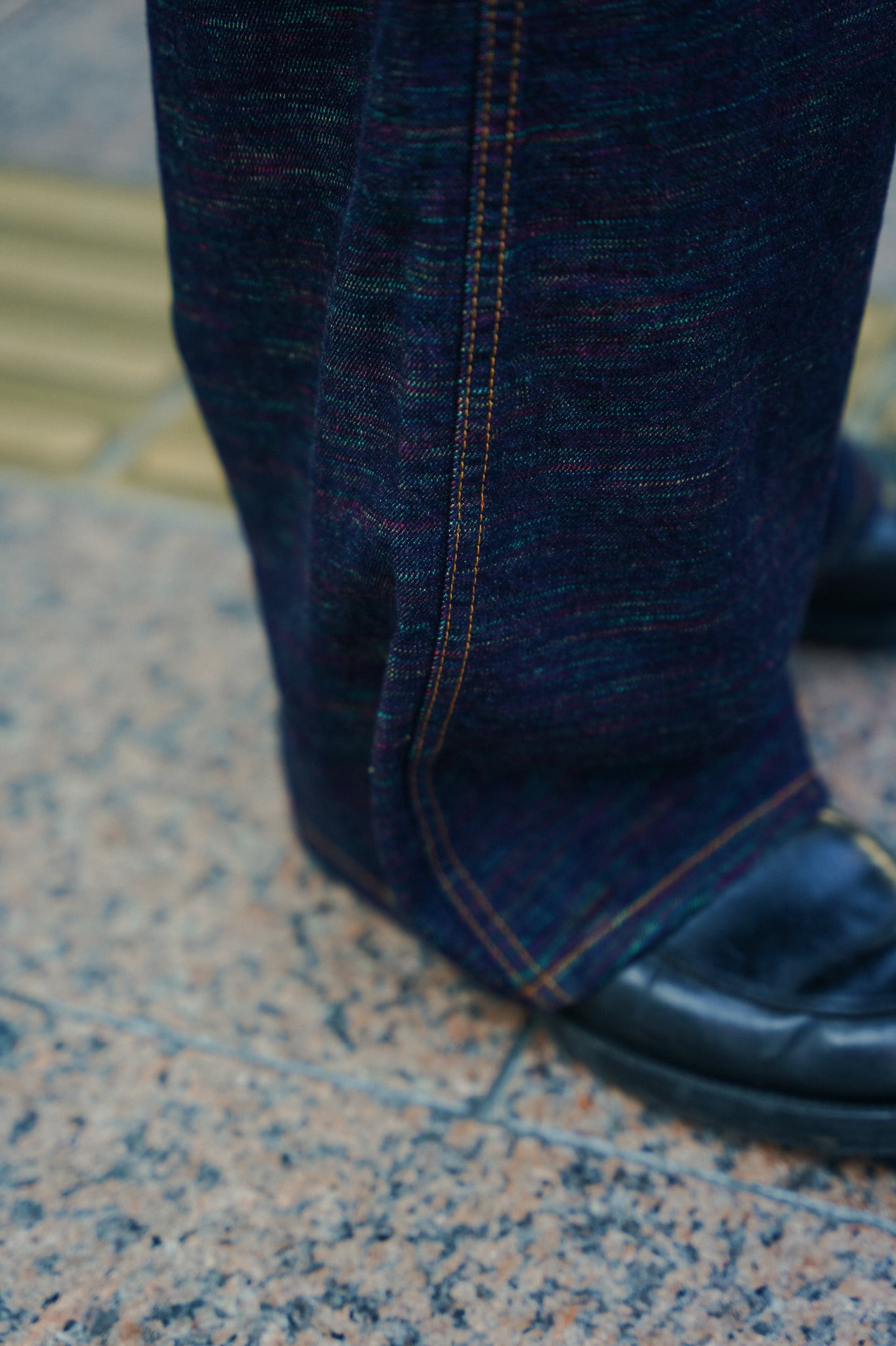 インディアンジュエリーのインレイワーク(はめ込み技法)をイメージし、カラフルなカスリ糸を使用した11.5ozデニムシリーズ。サンバースト(太陽光線)を思わせる随所のピンタック、スタッズワークをイメージしたリベット使いなど、ジュエリーにおけるナバホの技法やデザインをディテールとして採用。生地の製作から縫製まで全行程をデニムの産地岡山にて製造。縦糸にインディゴ、横糸にカスリ糸を使用しており、履き込むごとに色落ち、ムラ感がコントラストとして現れる一本。