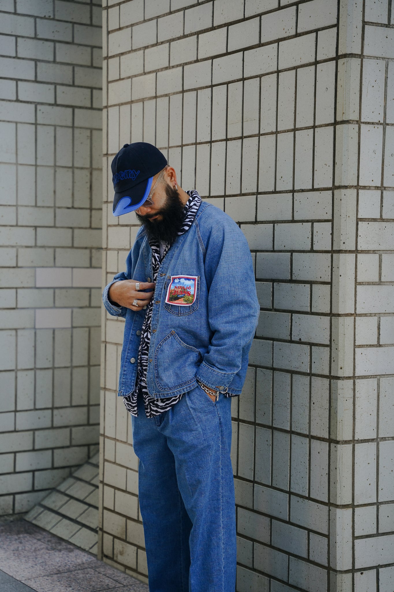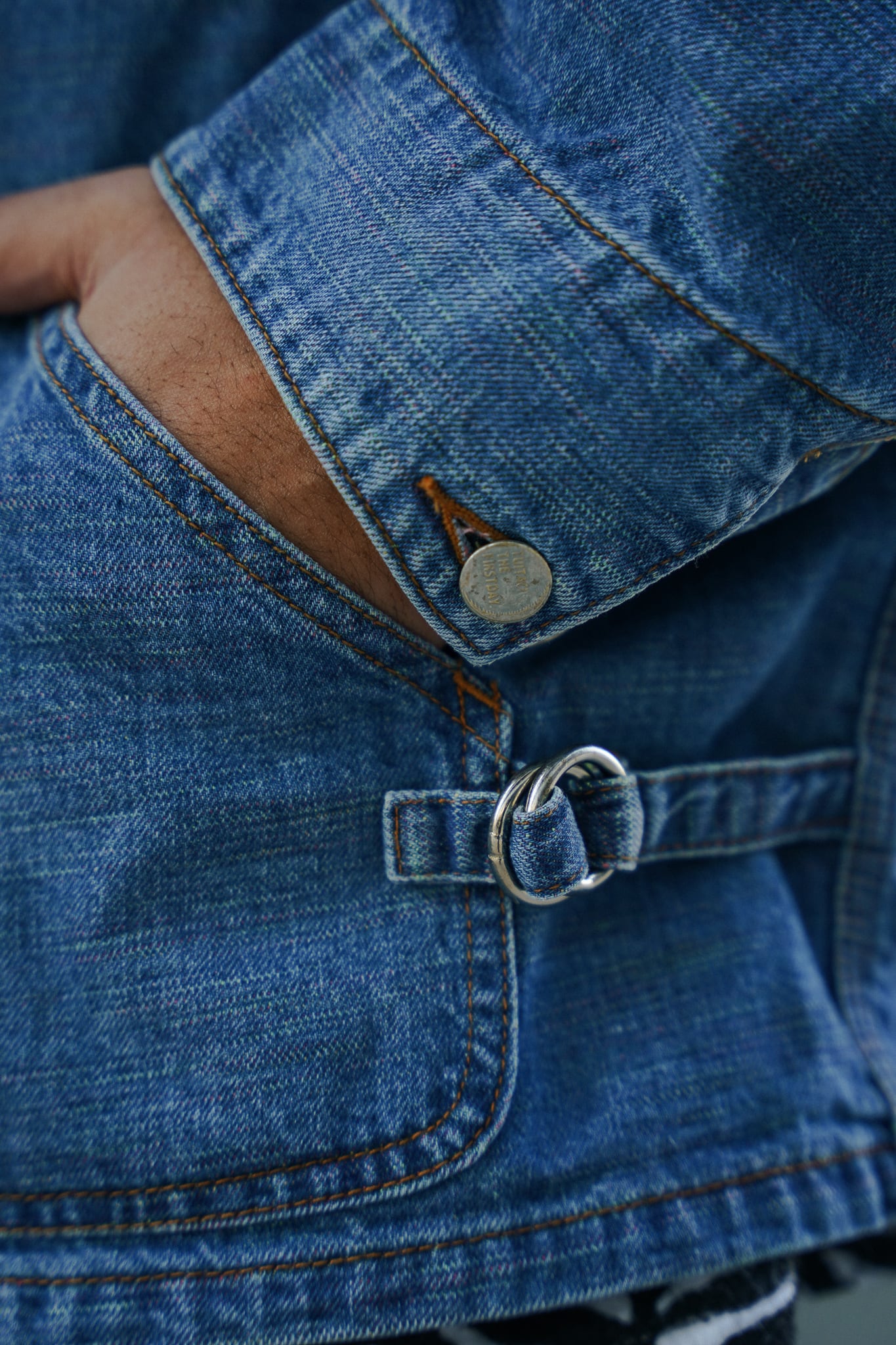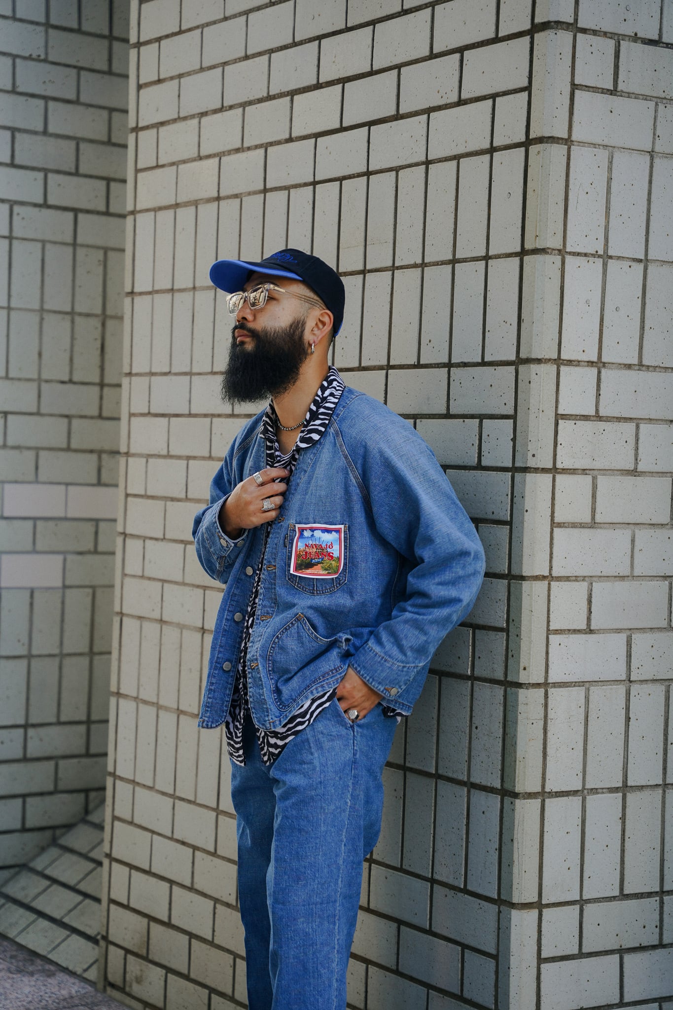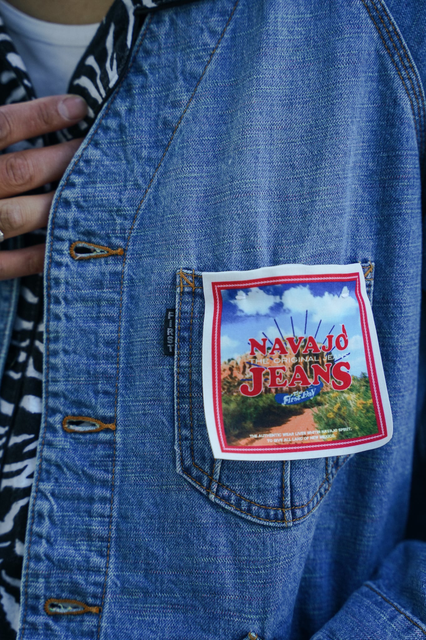 インディアンジュエリーのインレイワーク(はめ込み技法)をイメージし、カラフルなカスリ糸を使用した11.5ozデニムシリーズ。サンバースト(太陽光線)を思わせる随所のピンタック、スタッズワークをイメージしたリベット使いなど、ジュエリーにおけるナバホの技法やデザインをディテールとして採用。生地の製作から縫製まで全行程をデニムの産地岡山にて製造。縦糸にインディゴ、横糸にカスリ糸を使用しており、履き込むごとに色落ち、ムラ感がコントラストとして現れる一着。