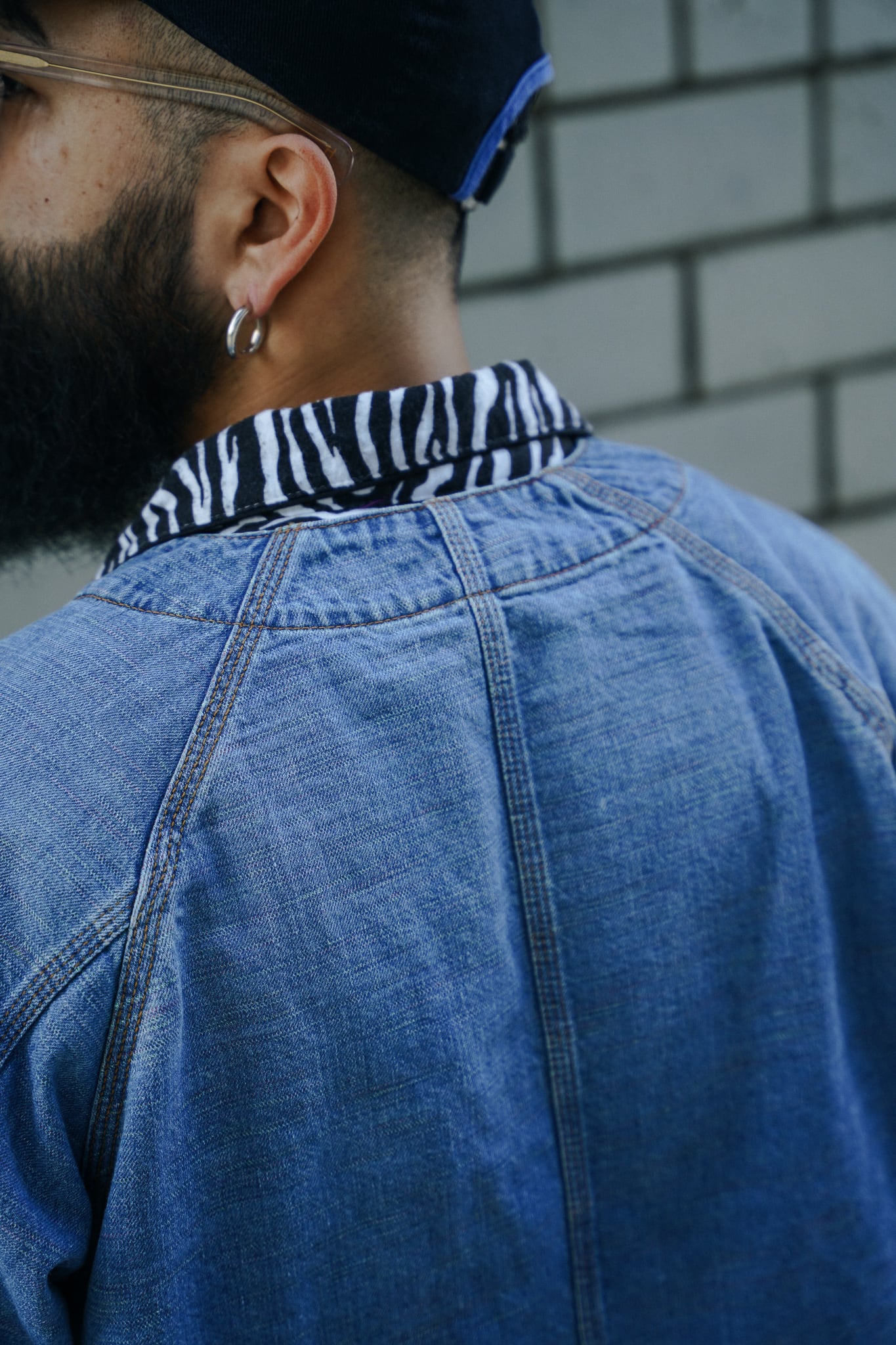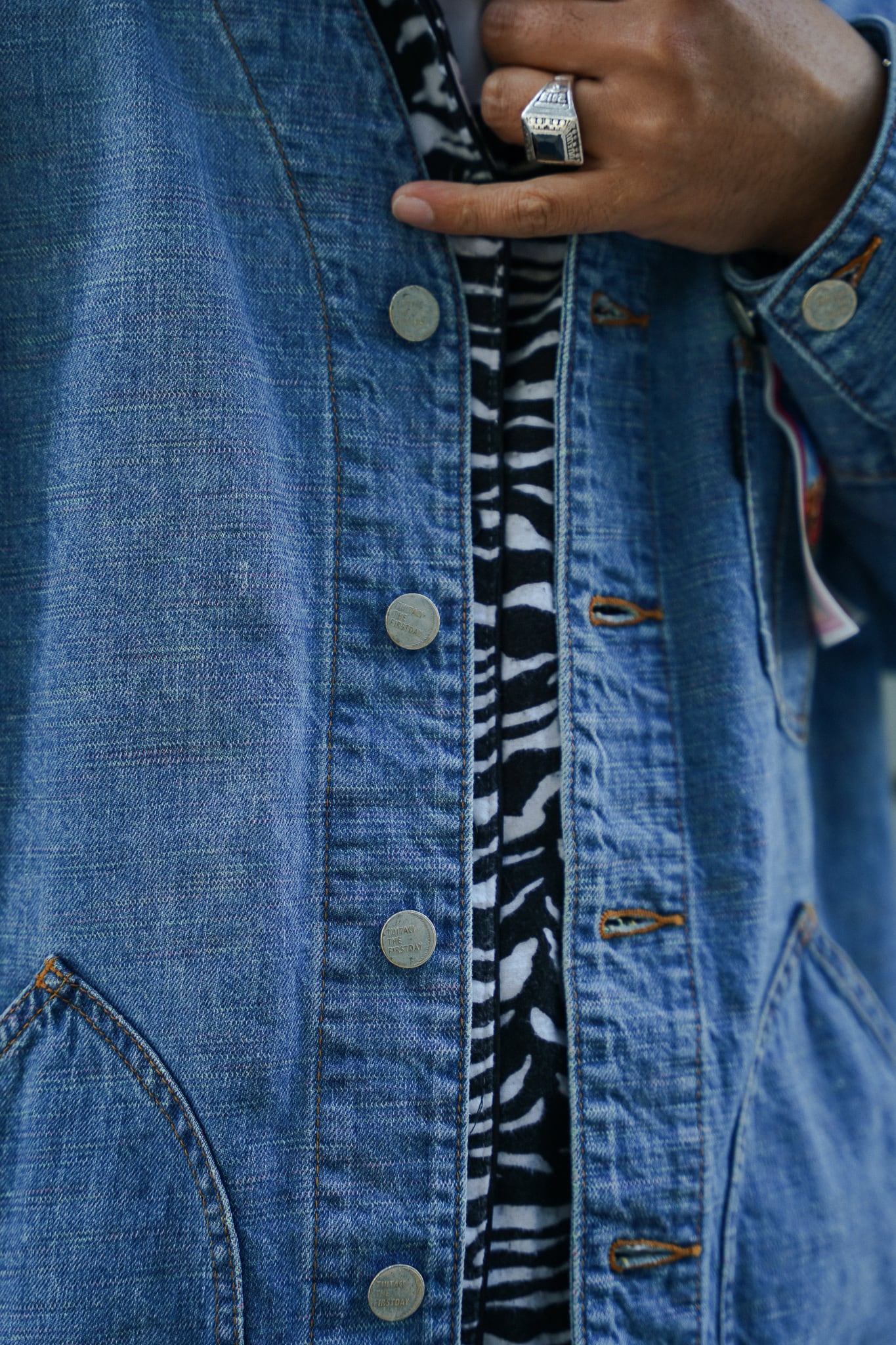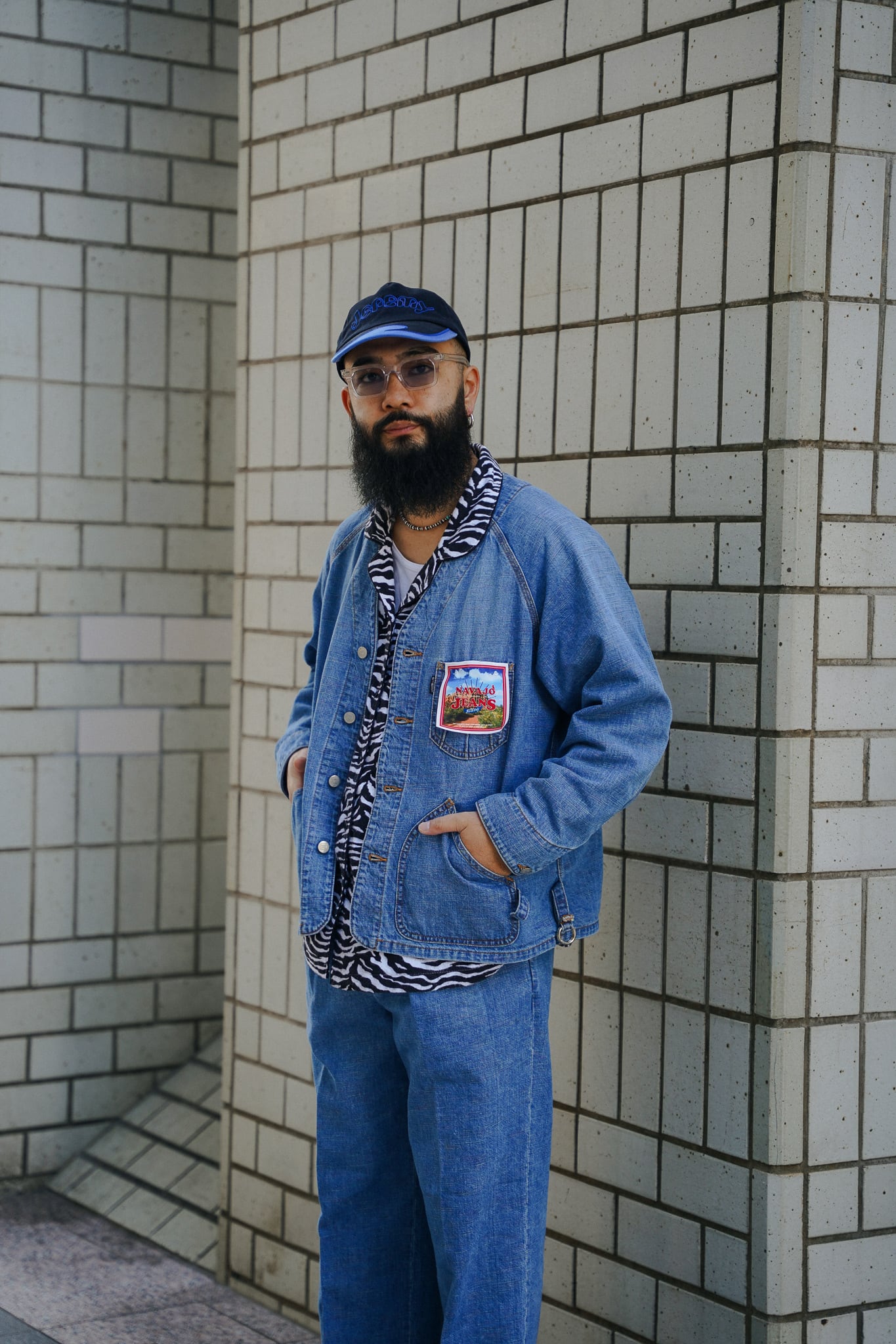 インディアンジュエリーのインレイワーク(はめ込み技法)をイメージし、カラフルなカスリ糸を使用した11.5ozデニムシリーズ。サンバースト(太陽光線)を思わせる随所のピンタック、スタッズワークをイメージしたリベット使いなど、ジュエリーにおけるナバホの技法やデザインをディテールとして採用。生地の製作から縫製まで全行程をデニムの産地岡山にて製造。縦糸にインディゴ、横糸にカスリ糸を使用しており、履き込むごとに色落ち、ムラ感がコントラストとして現れる一着。