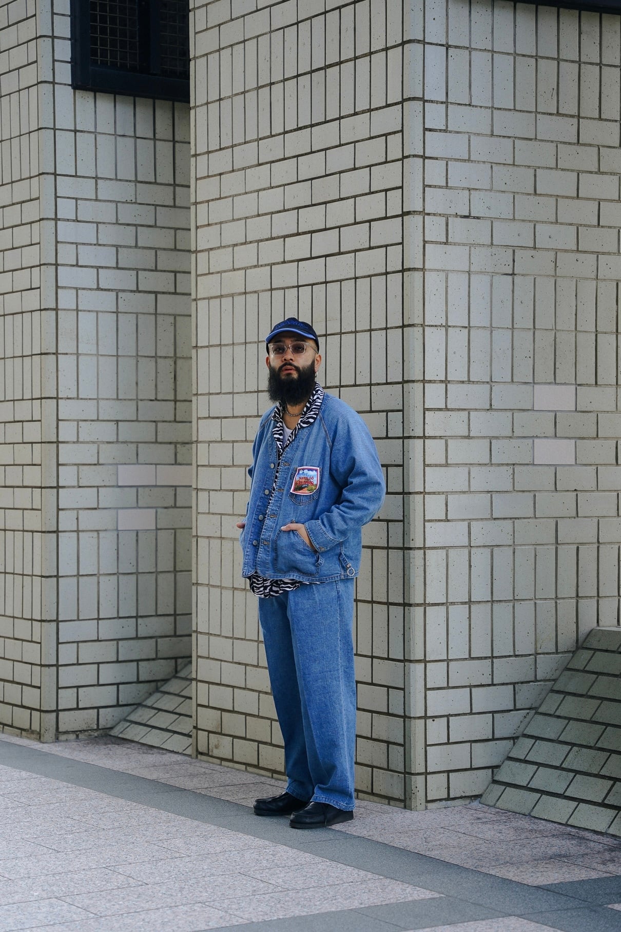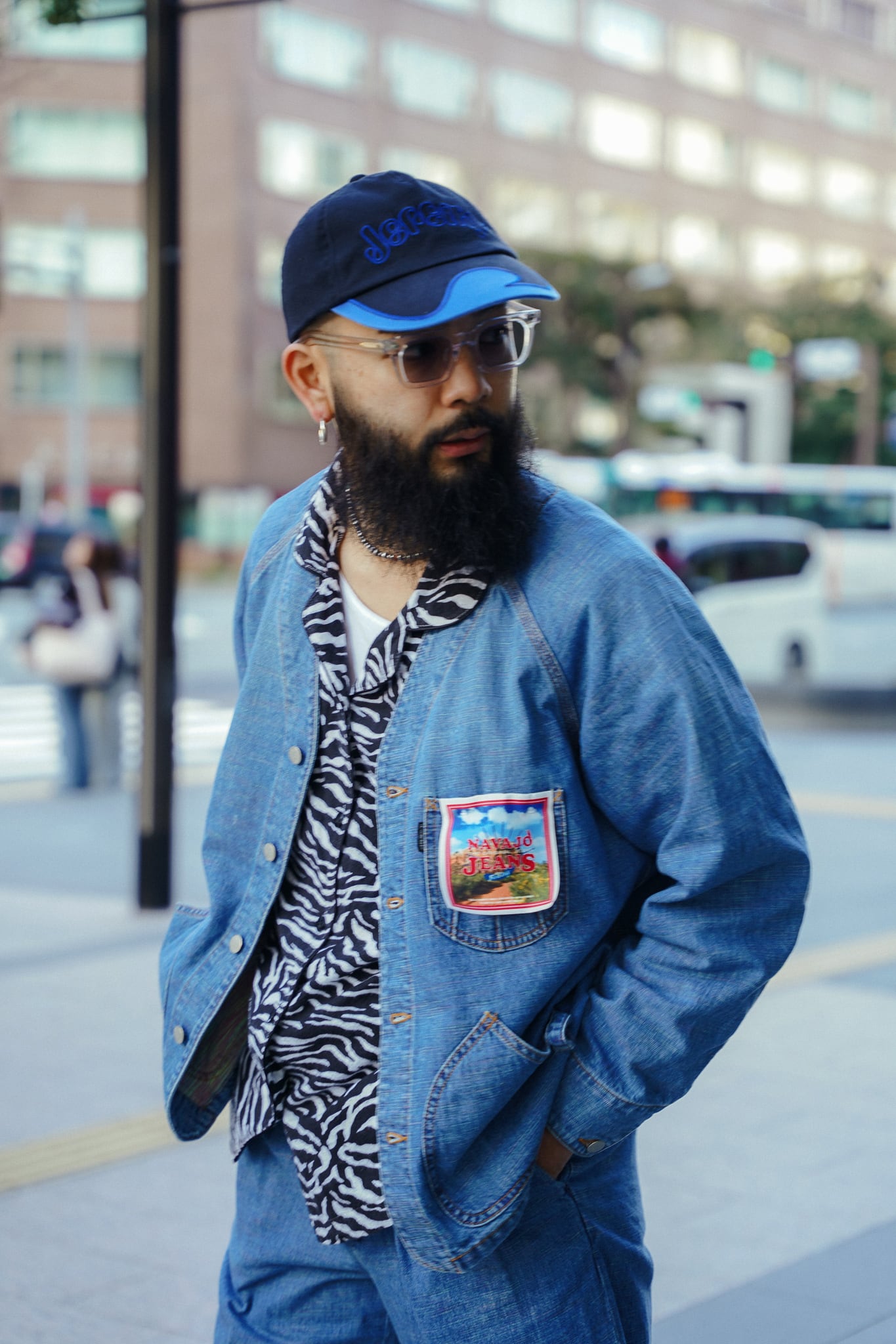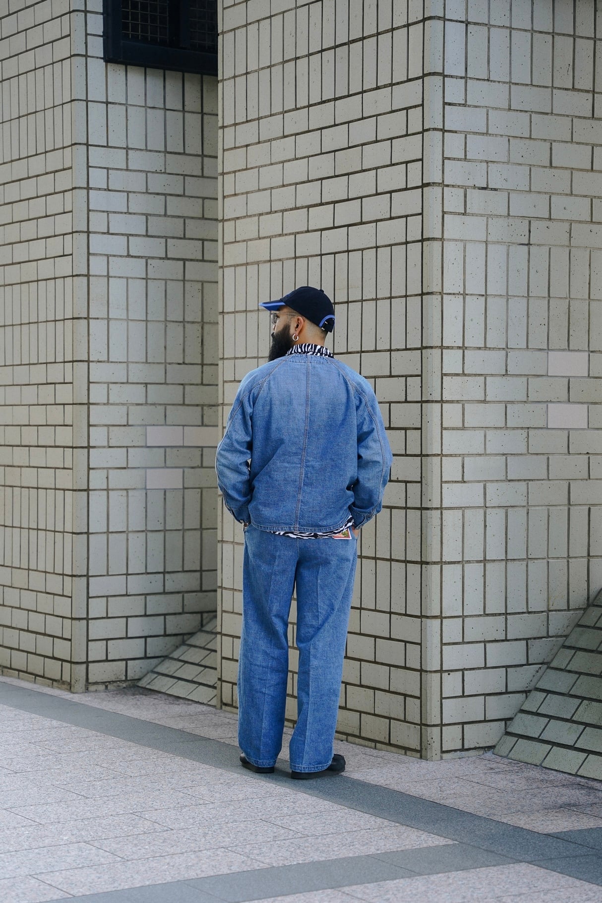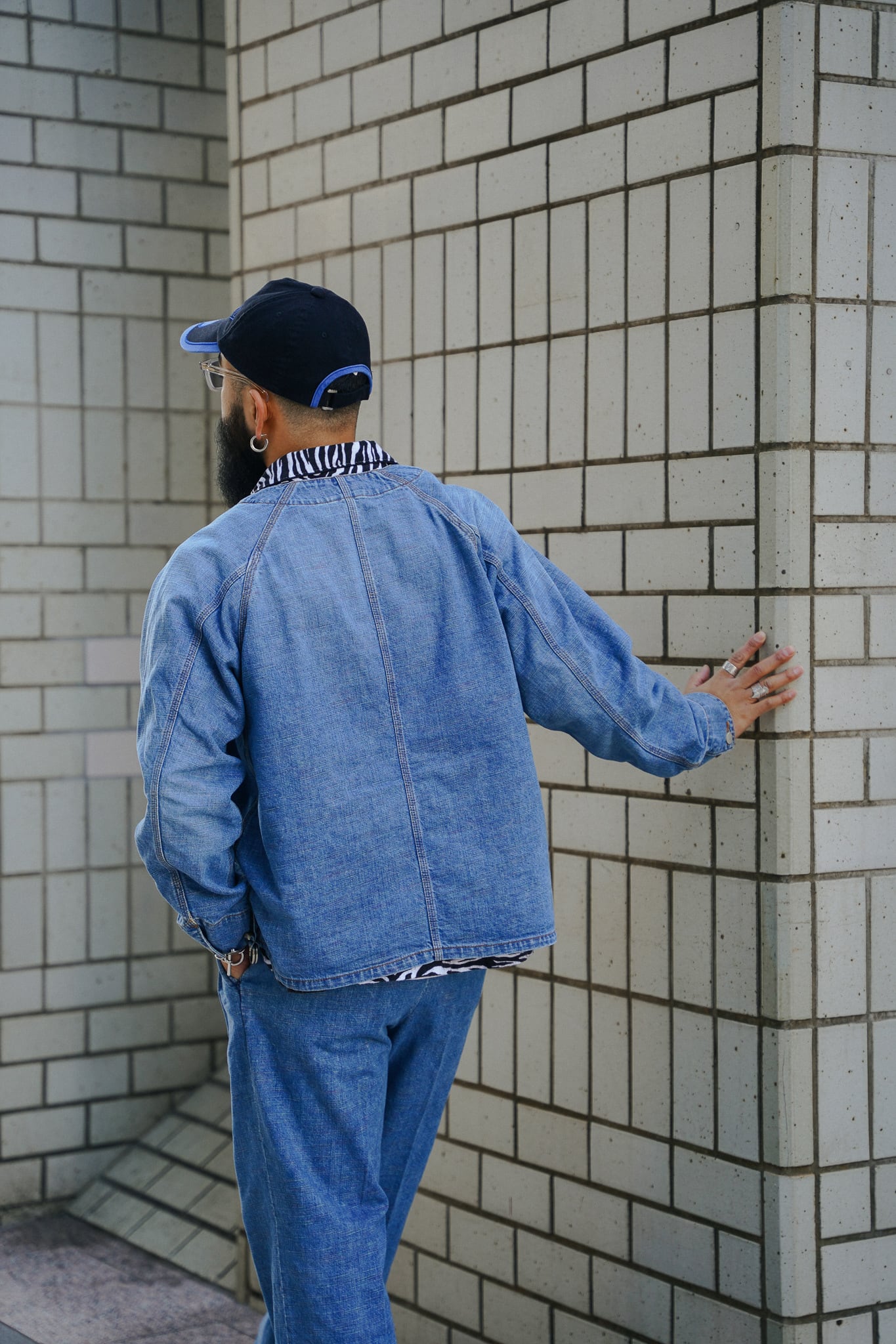 インディアンジュエリーのインレイワーク(はめ込み技法)をイメージし、カラフルなカスリ糸を使用した11.5ozデニムシリーズ。サンバースト(太陽光線)を思わせる随所のピンタック、スタッズワークをイメージしたリベット使いなど、ジュエリーにおけるナバホの技法やデザインをディテールとして採用。生地の製作から縫製まで全行程をデニムの産地岡山にて製造。縦糸にインディゴ、横糸にカスリ糸を使用しており、履き込むごとに色落ち、ムラ感がコントラストとして現れる一着。