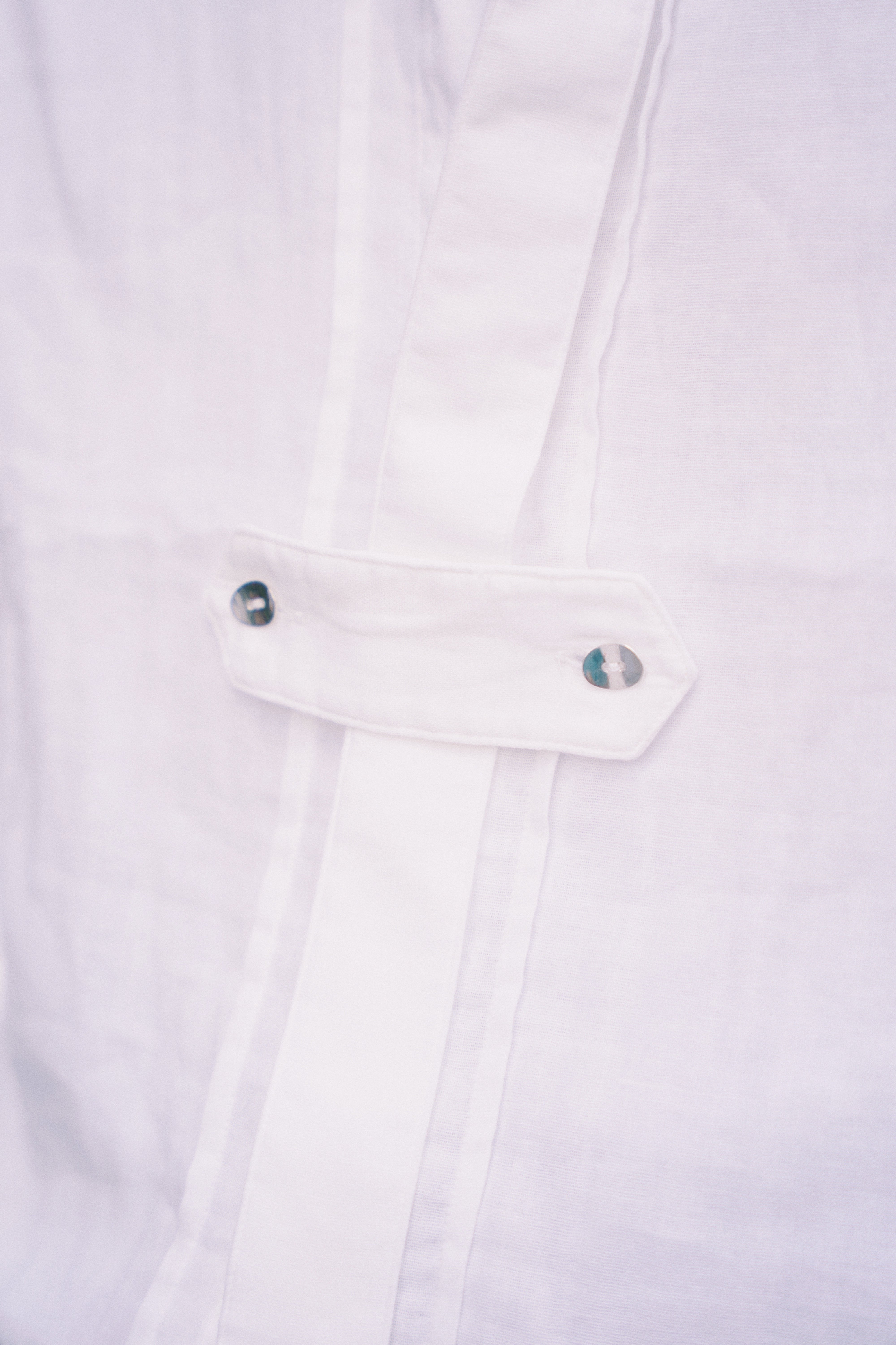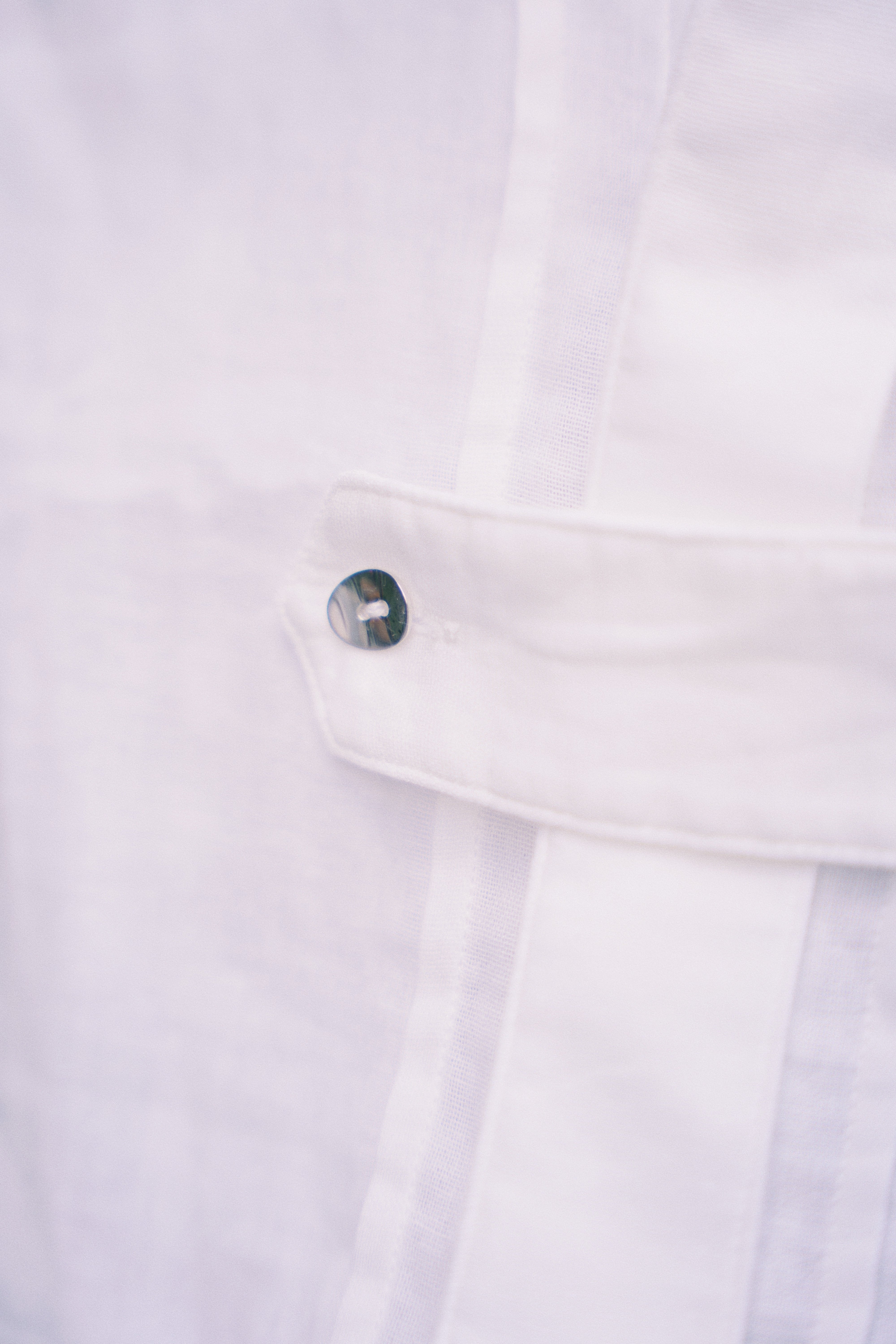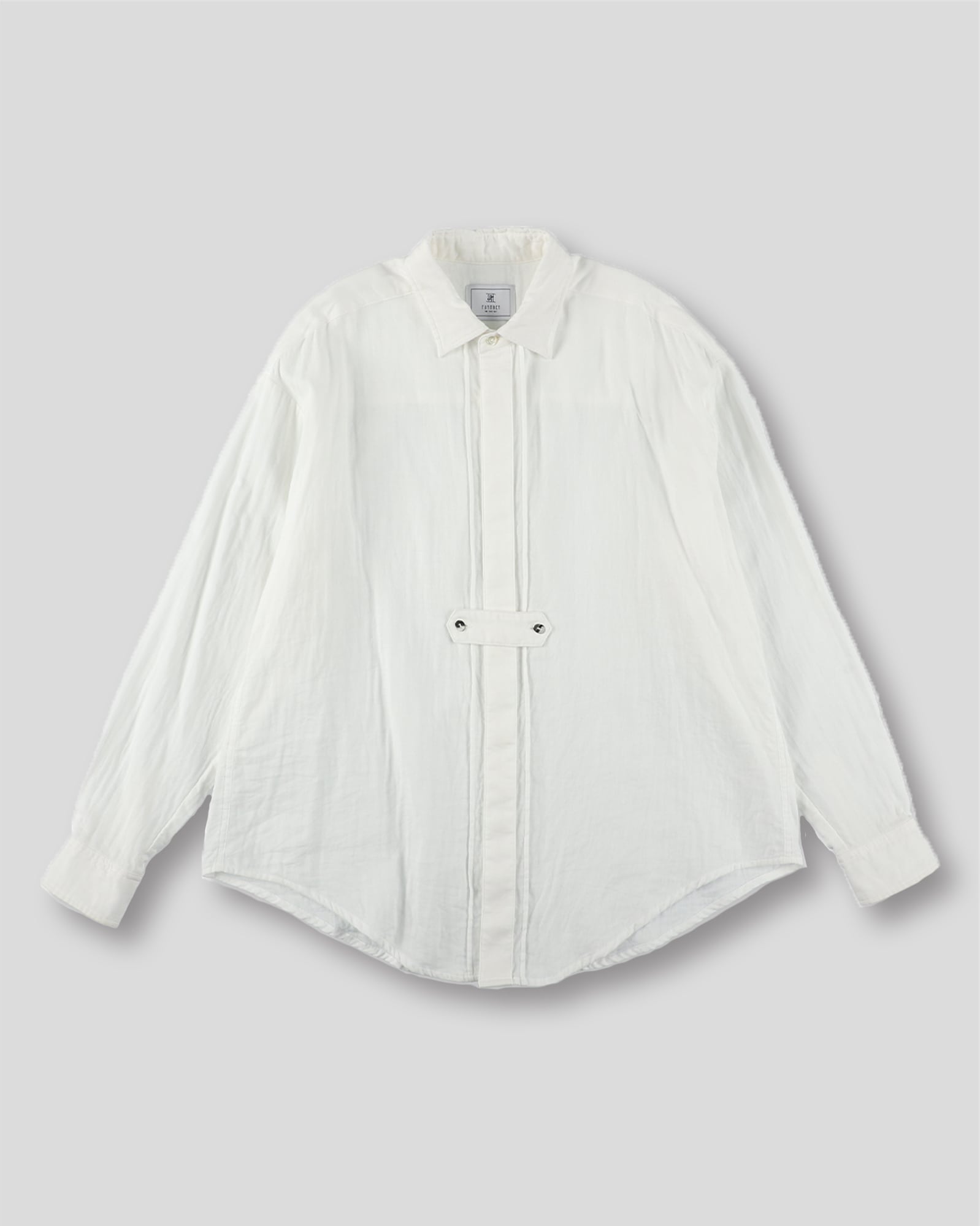 ダブルガーゼの柔らかな風合いが特徴の比翼シャツ。インディアンジュエリーをイメージしたシルバー925製の釦を付属し、ミニマルなデザインの中に美しい輝きがアクセント。