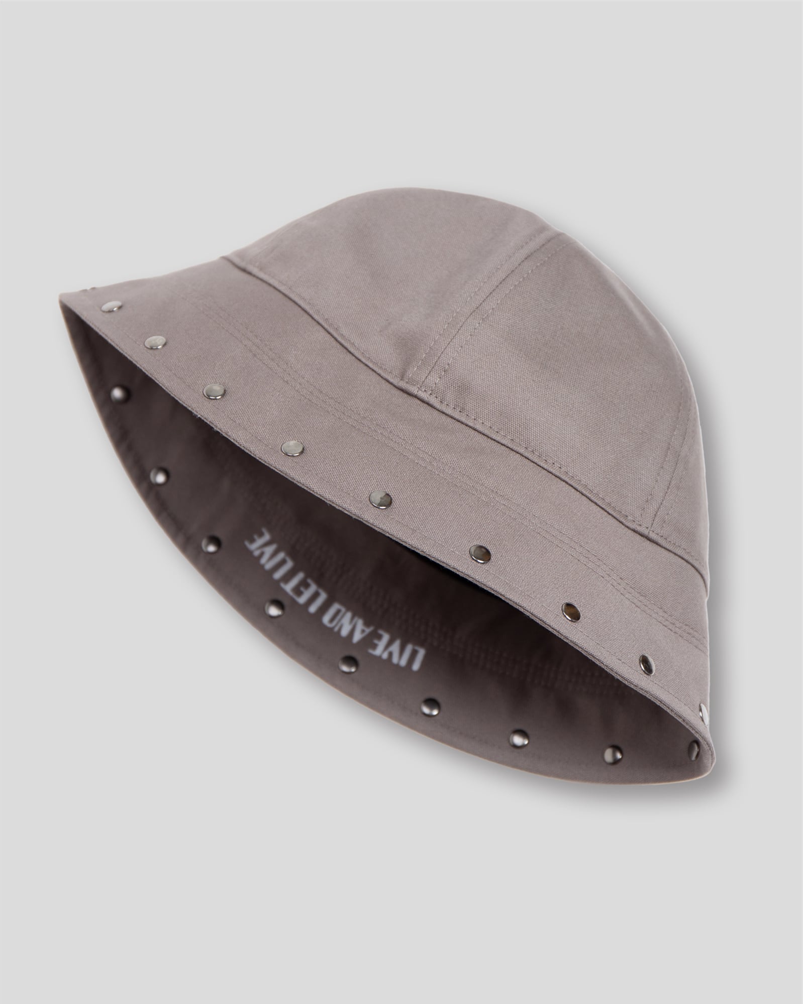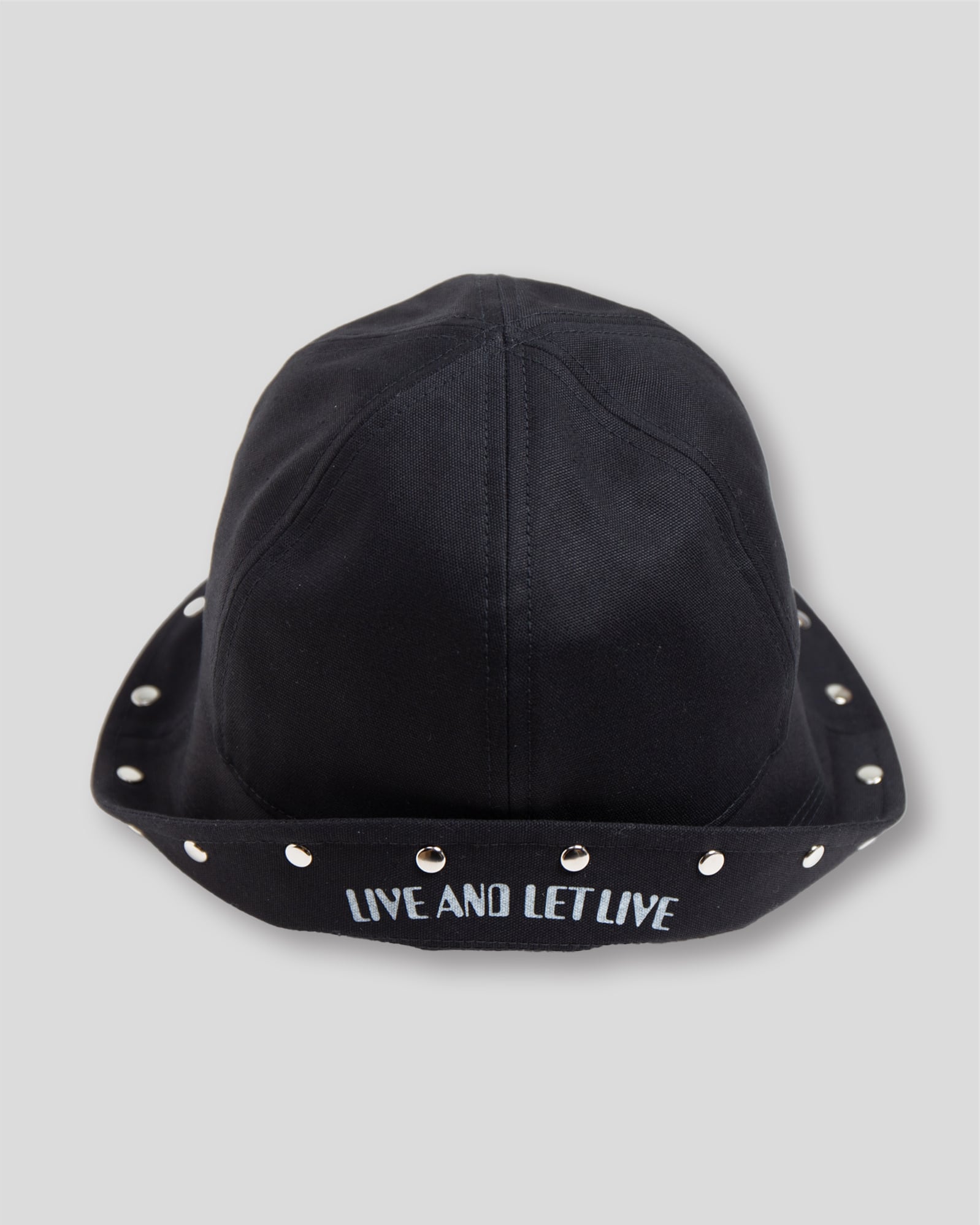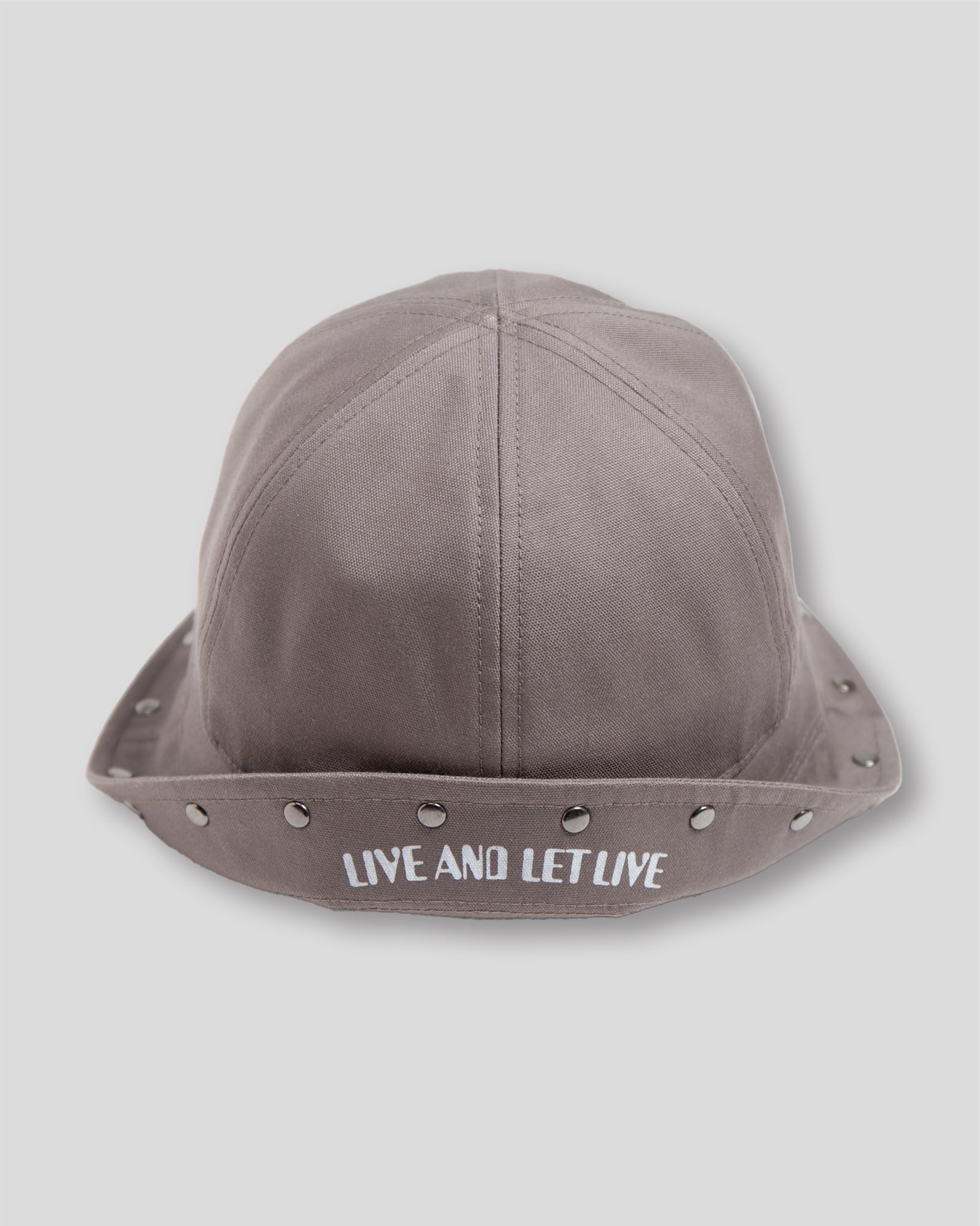 ライトダック生地を使用したセーラーハットです。ブリム裏にはシーズンテーマ『LIVE AND LET LIVE』のプリント施しています。セーラーハットのミリタリー要素にあえてポジティブなメッセージを施すことで、様々な争いへのアンチテーゼとしての平和を表現しています。ブリム淵にはカシメを施したデザインが特徴になっています。サイズ調整スベリを採用しているため、フィット感の調整が可能です。中性洗剤を使用してぬるま湯で手洗いすることが可能です。