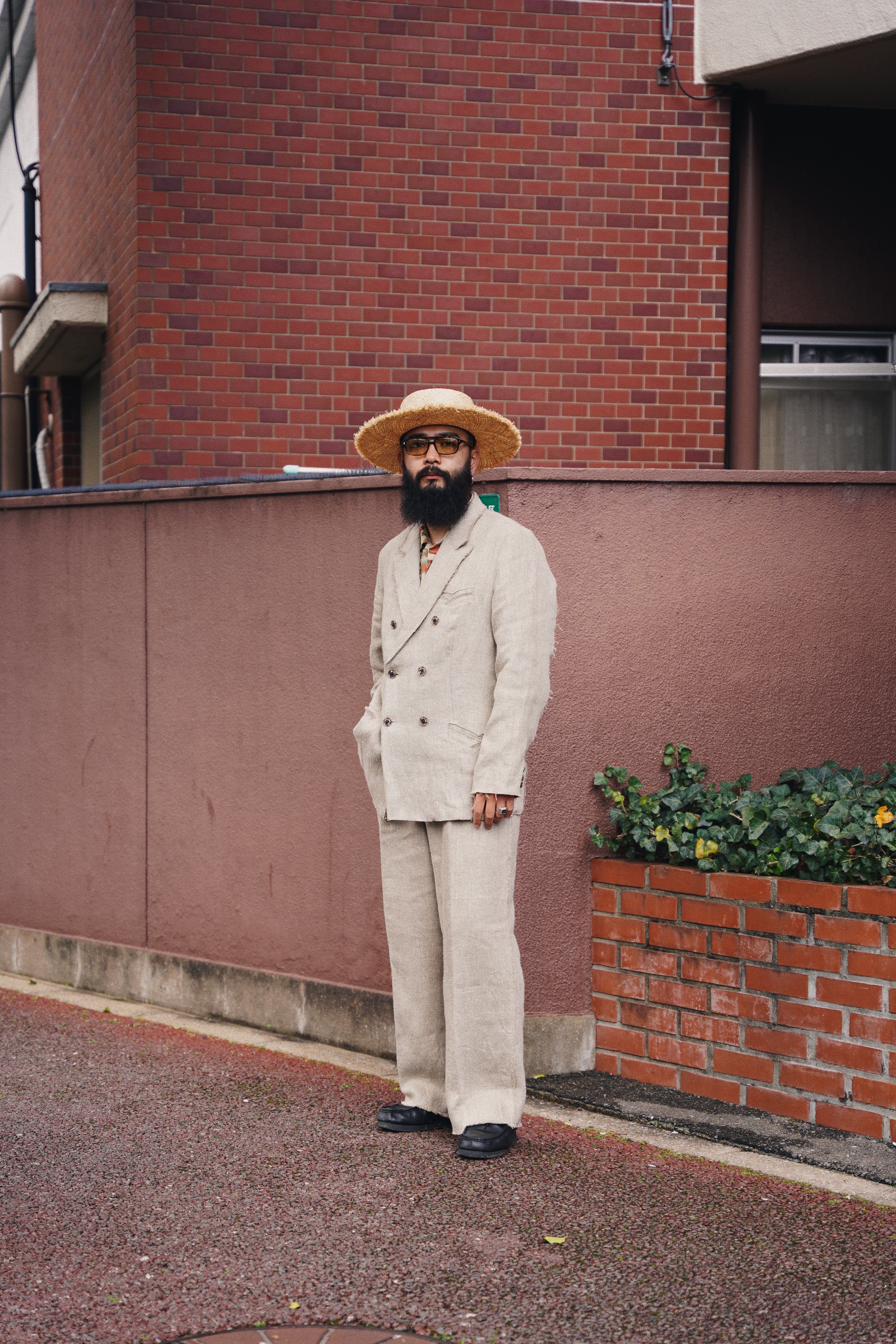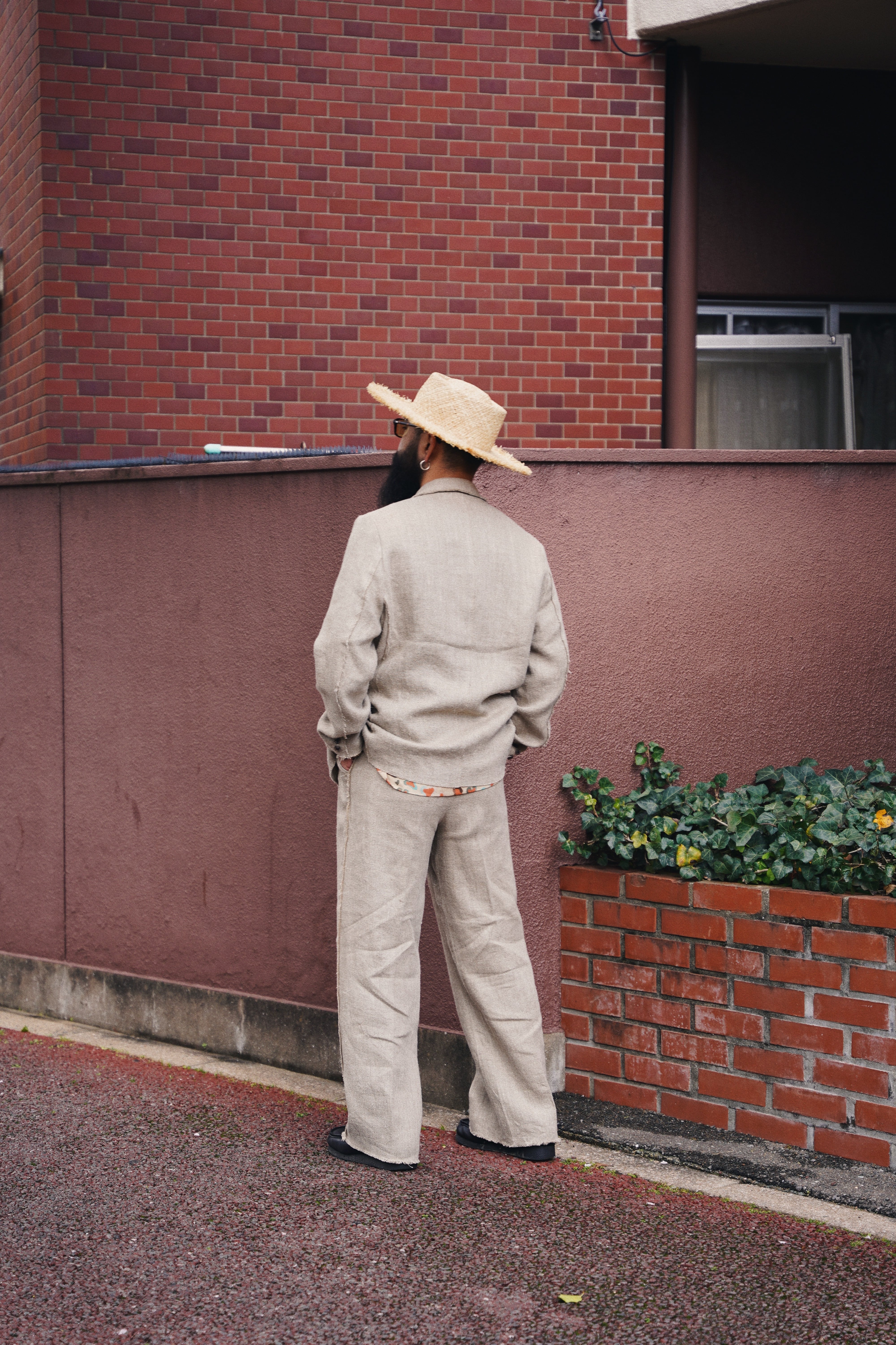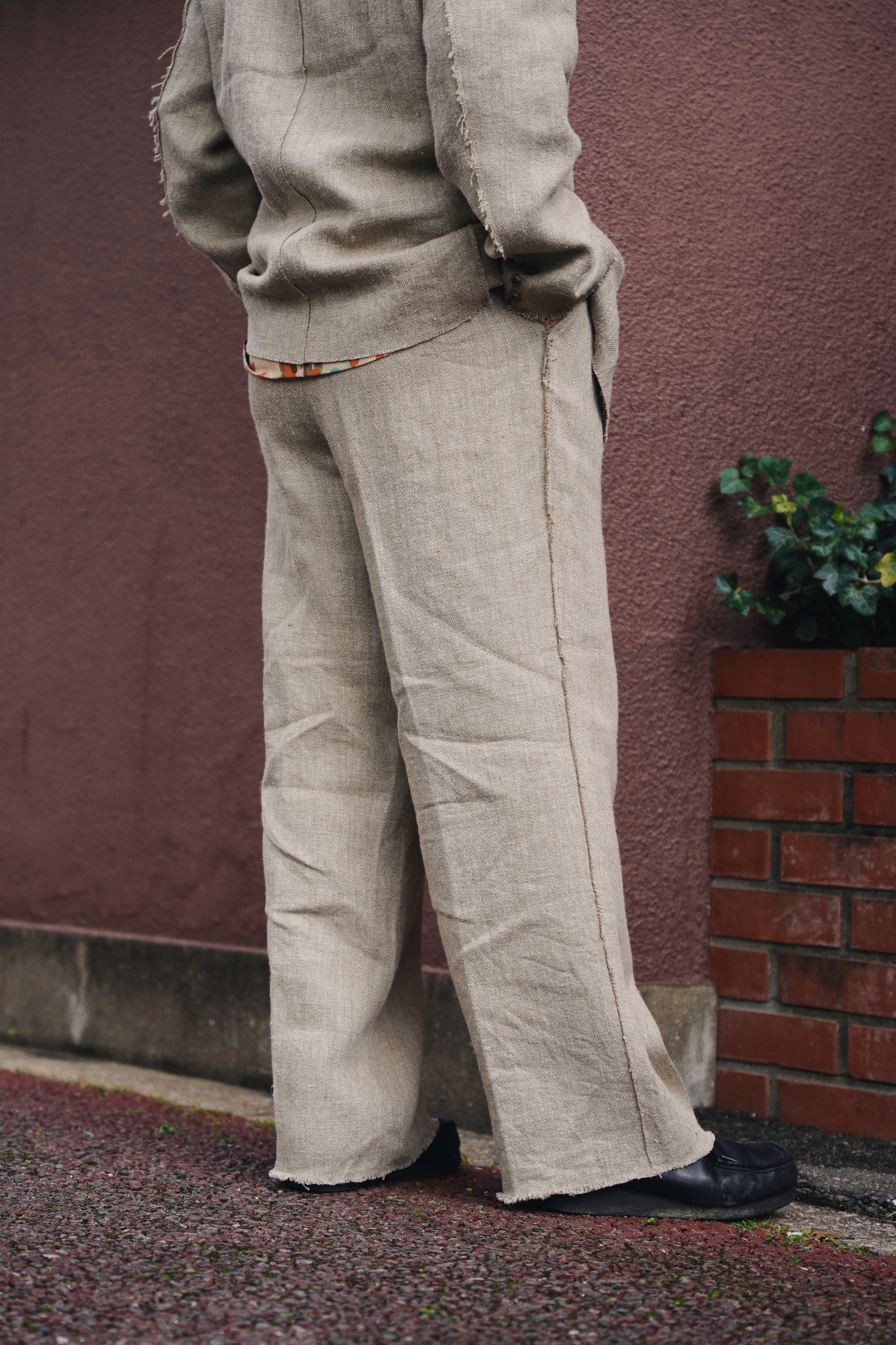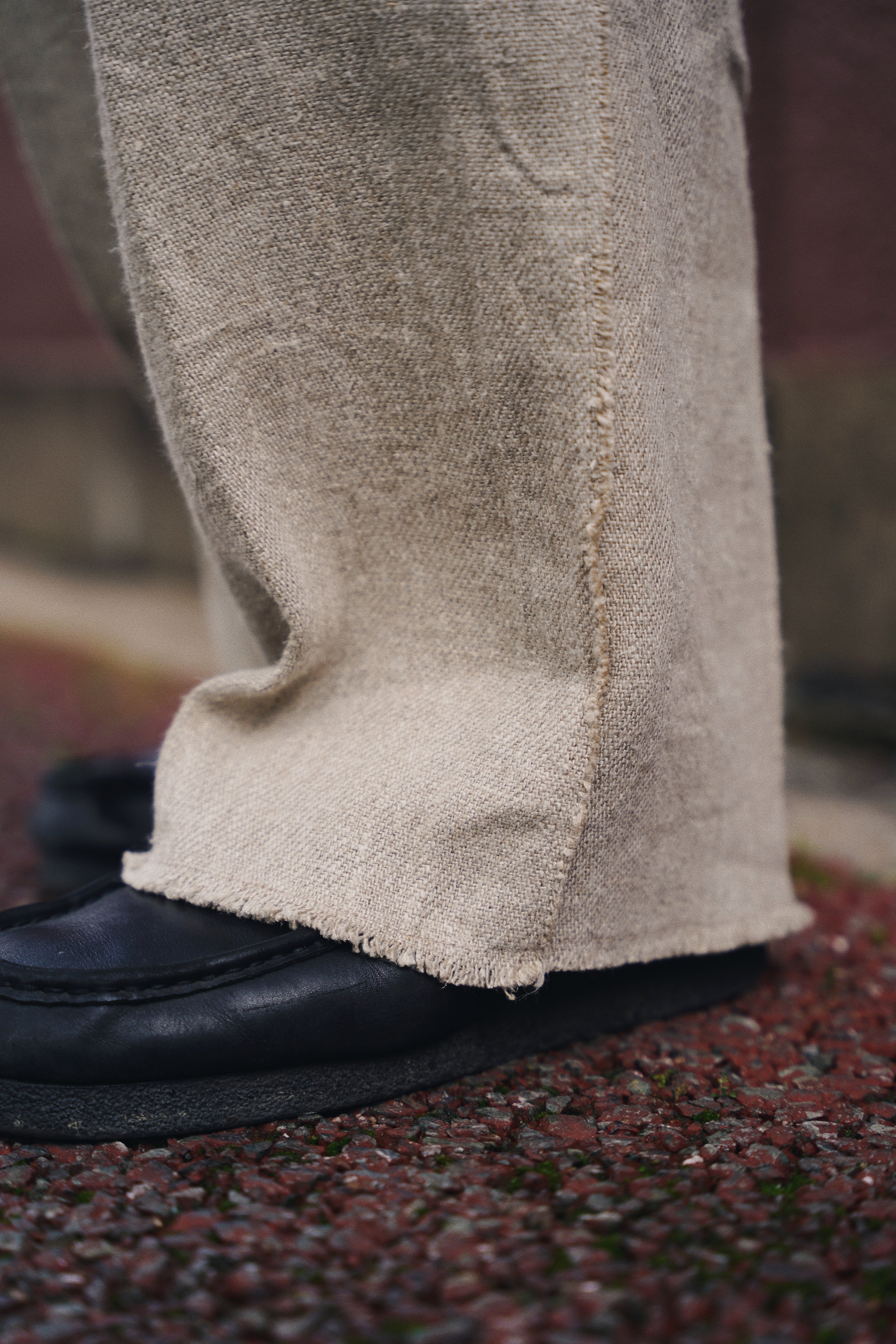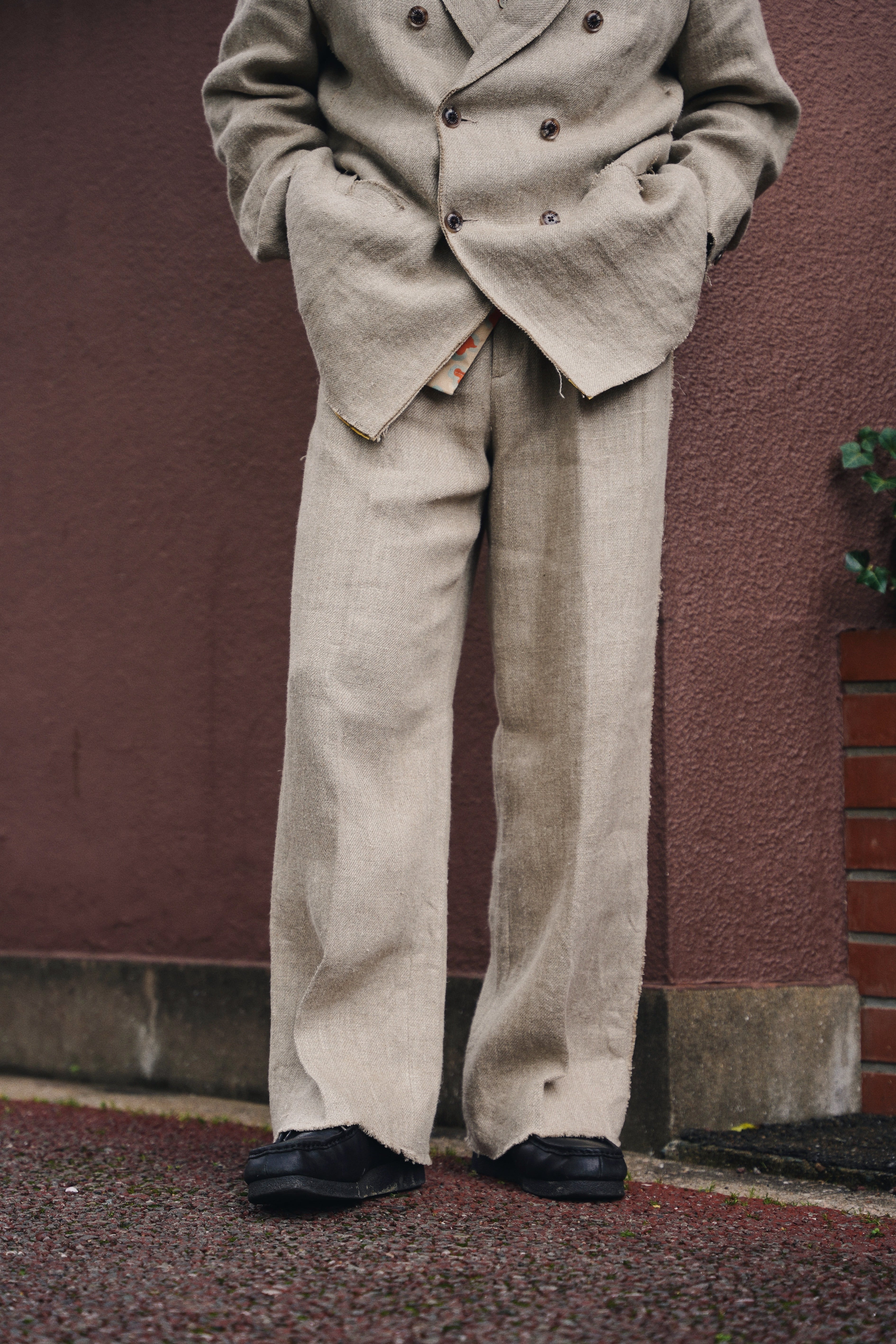 8番手の太いリネン糸を綾織りで超重厚に仕上げたリネン100%のワイドスラックス。リネンの持つ本来の粗野感を残しつつも、セミウェットな質感と柔らかさを表現。部分的に断ち切りで仕上げたスラックスは、2タックを用いたややボリュームのあるシルエット。フォーマルな要素を取り入れつつ、カジュアルなディティールとのバランスが抜群。普段使いからフォーマルシーンまで活躍間違いなしのスラックス。