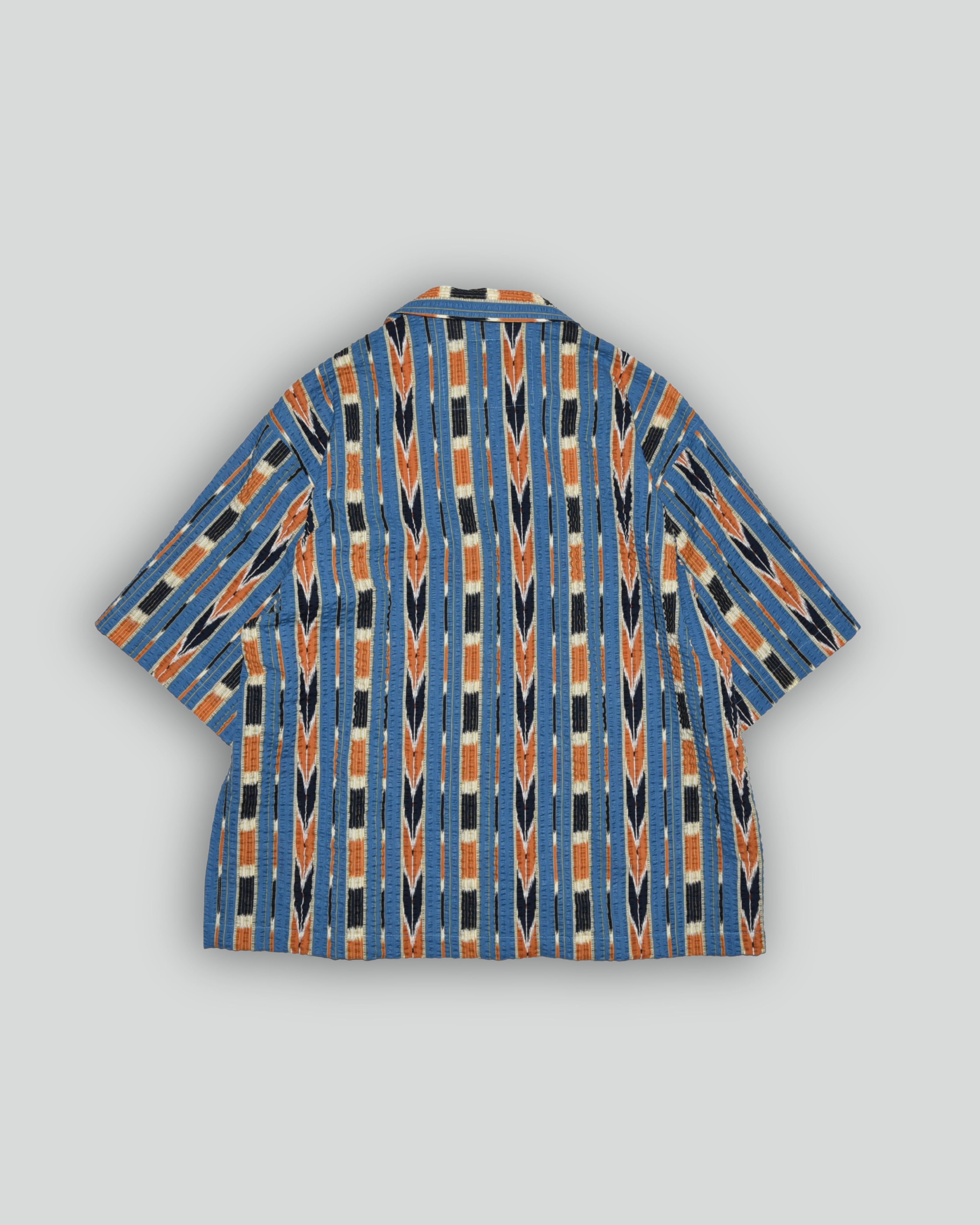 ブルーをベースに、オレンジとブラックを効かせた総柄。